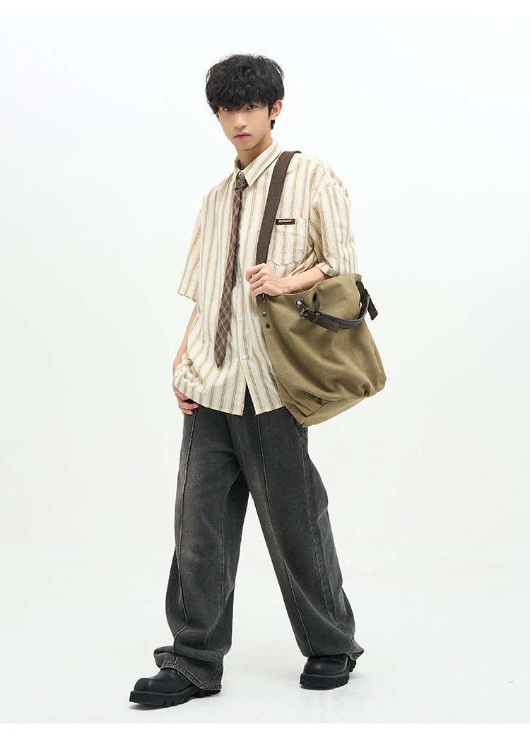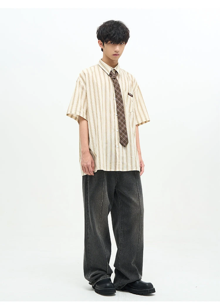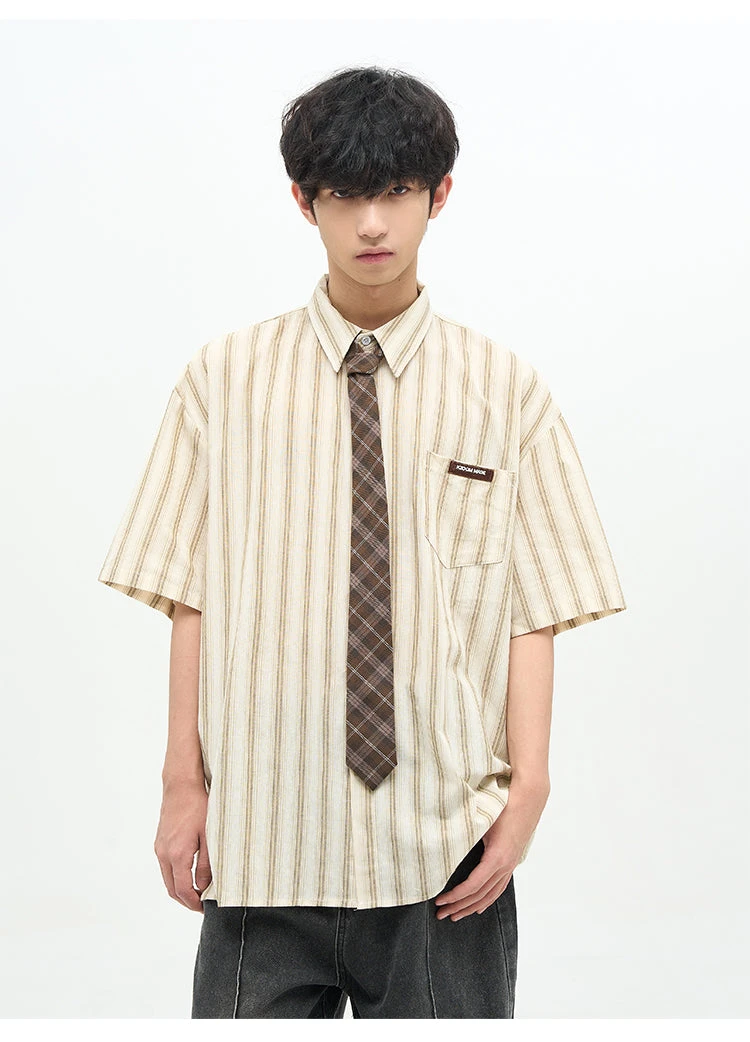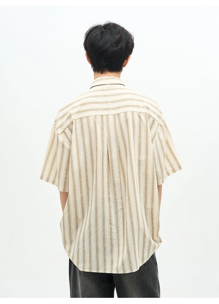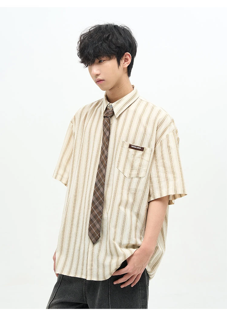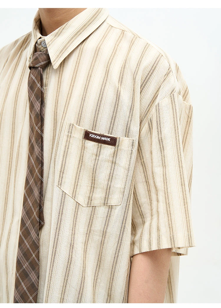77F7GHT cotton-blend short sleeve shirt, stripes throughout, spread collar, dropped shoulders, summary closure, patch pocket at chest, shirttail hem.
