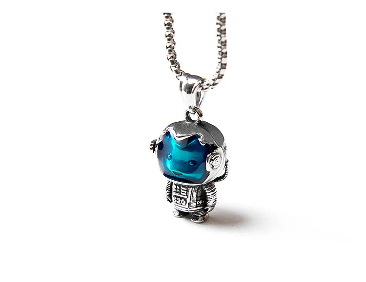 Titanium steel necklace, mini curb chain, detailed astronaut steel and enamel pendant.