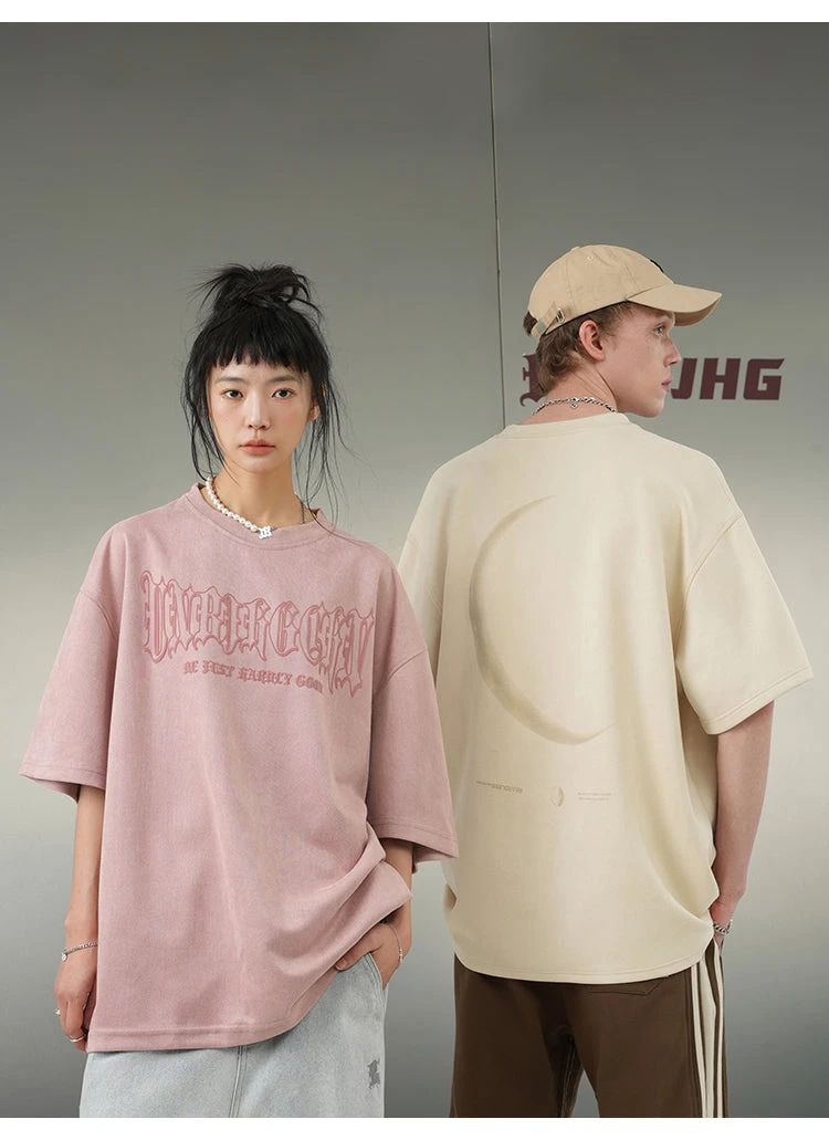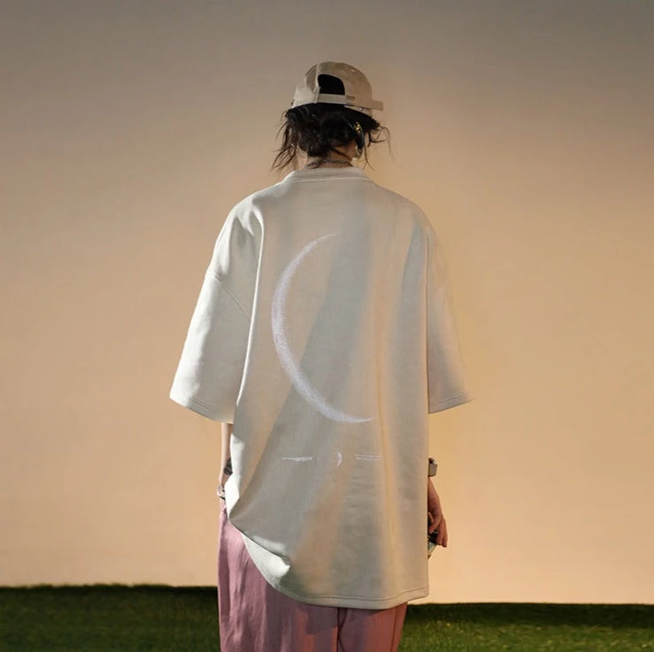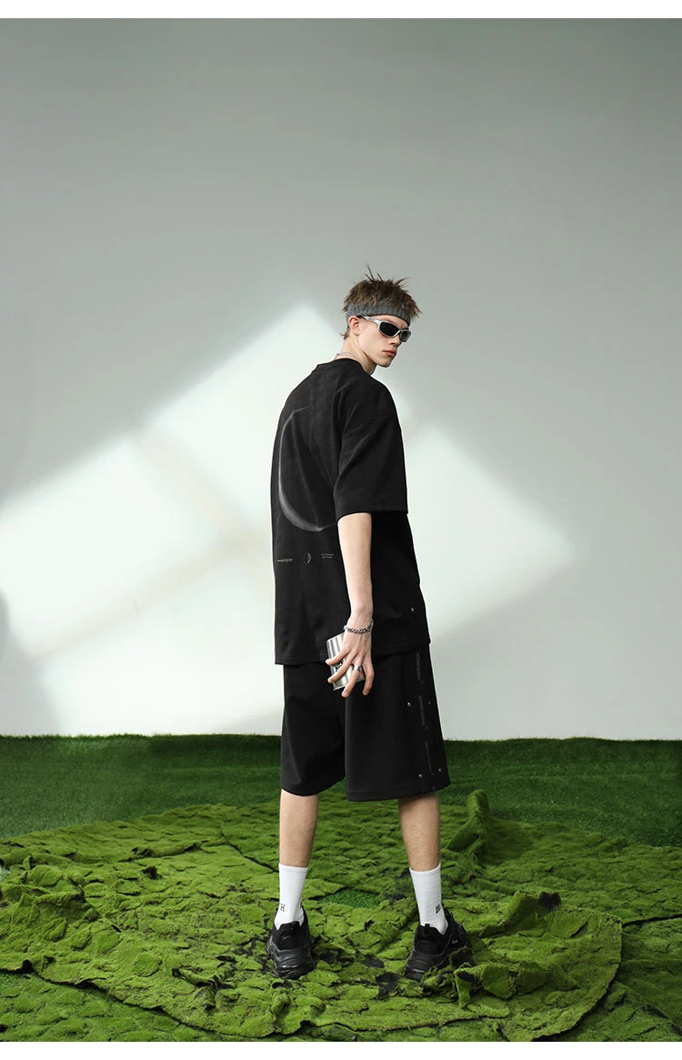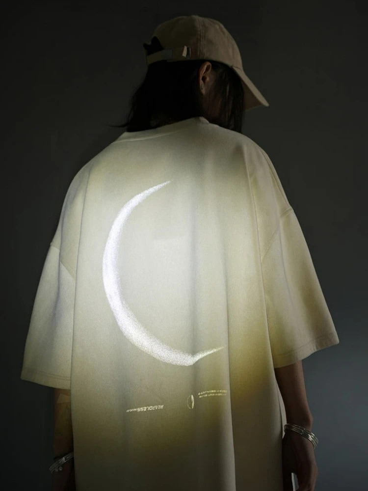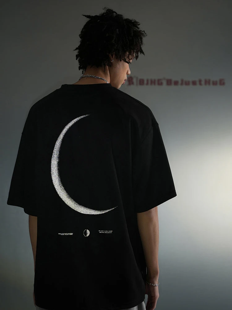BJHG polyester-blend shirt, rib knit crewneck, hem and cuffs, puff print script at chest, 3M reflective crescent print at back.
