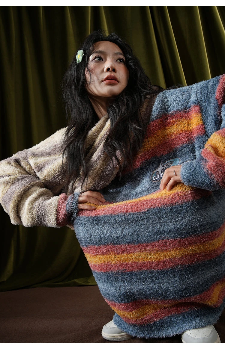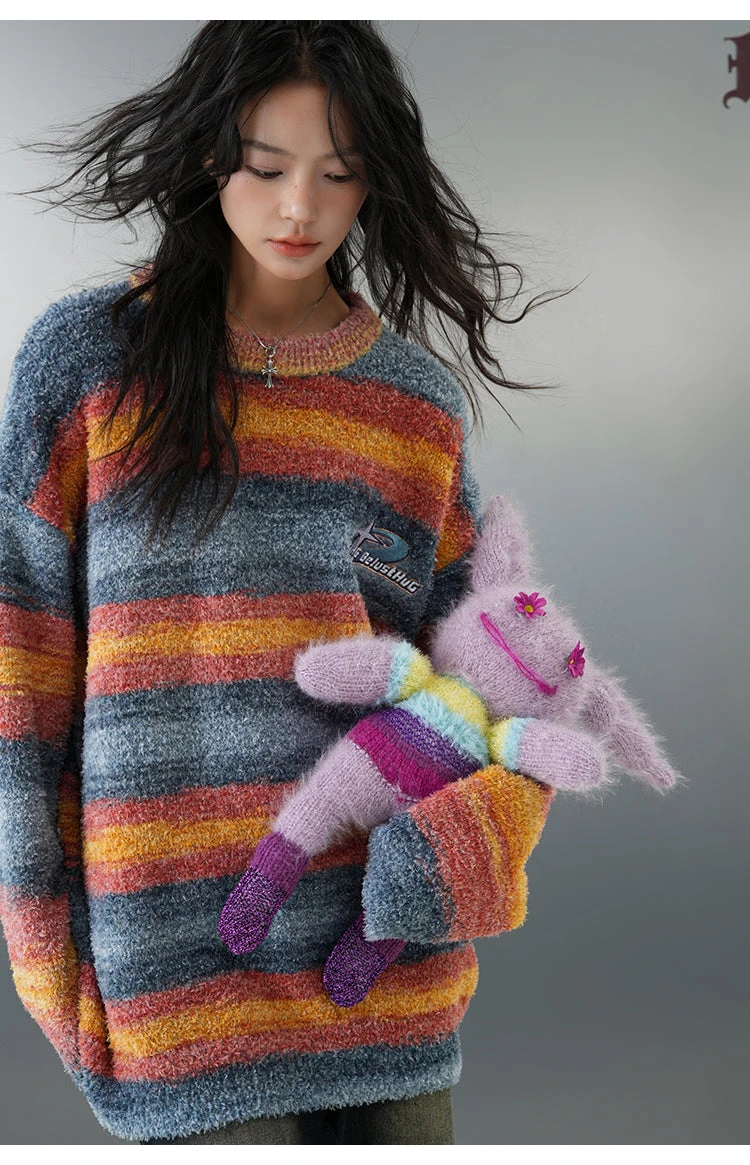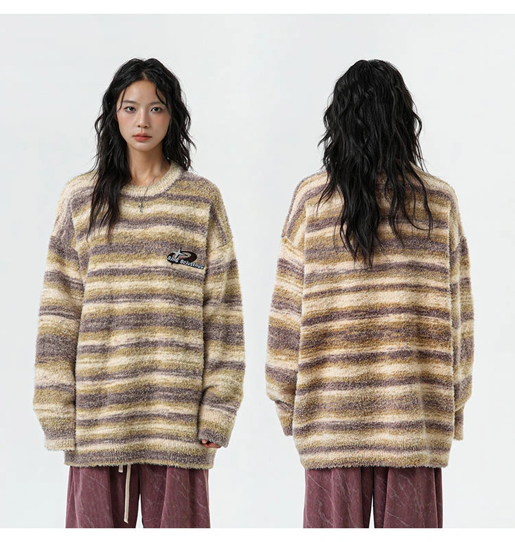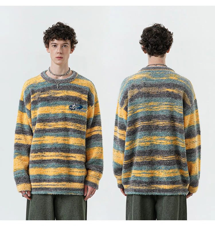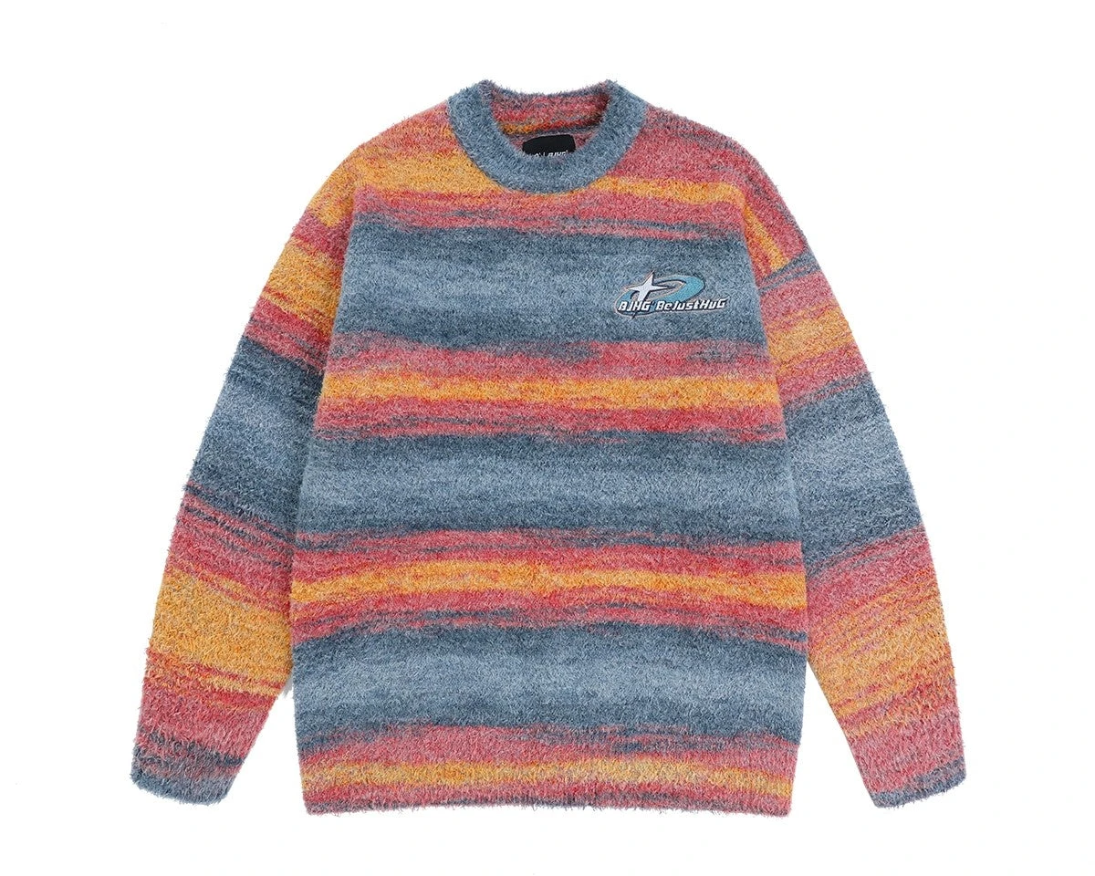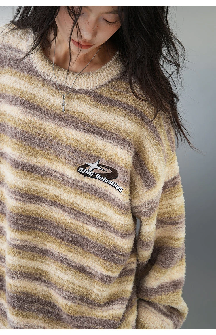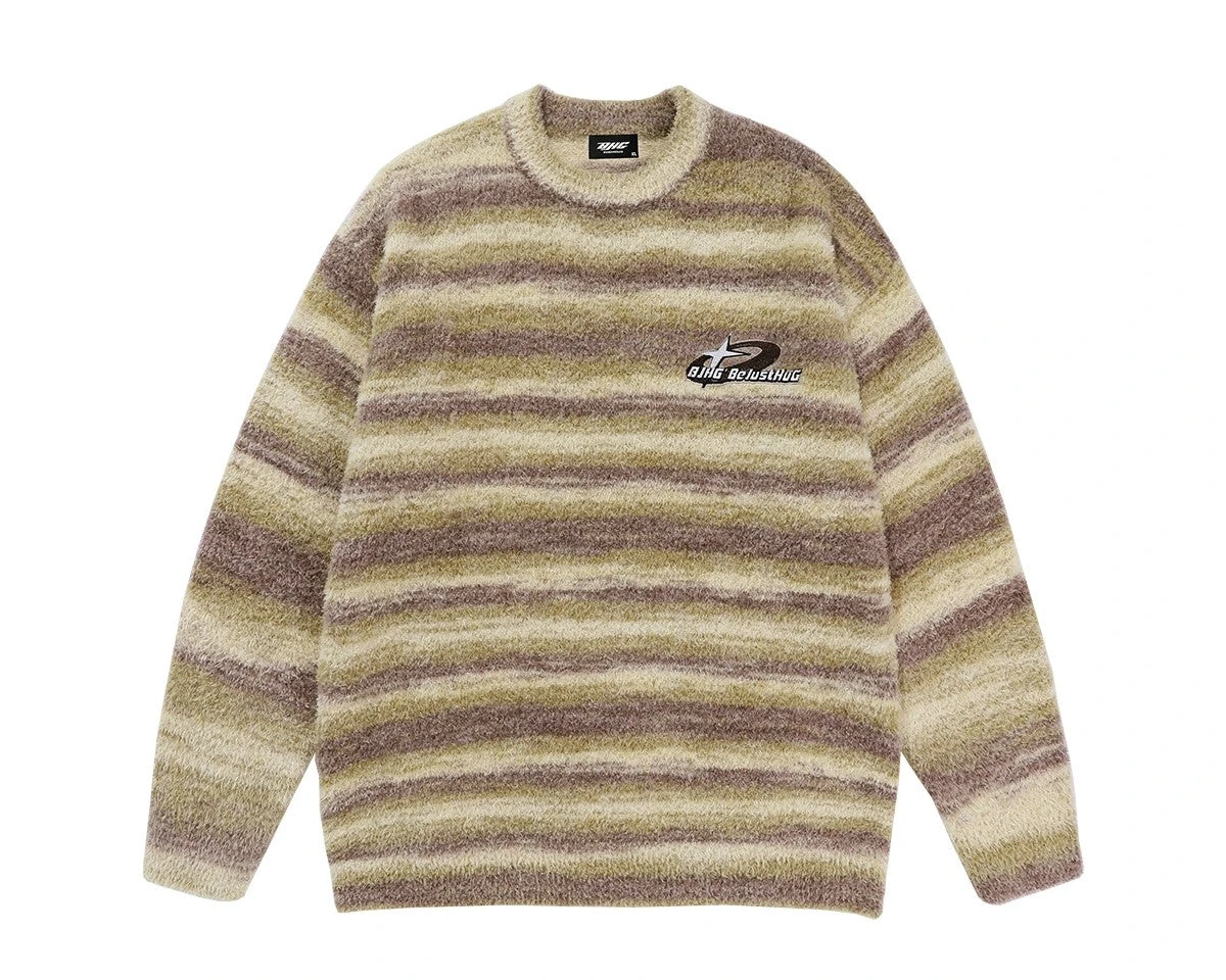 BJHG knit polyester and acrylic-blend sweater, striped pattern printed throughout, rib knit crewneck/hem/cuffs, logo patch embroidered at chest.