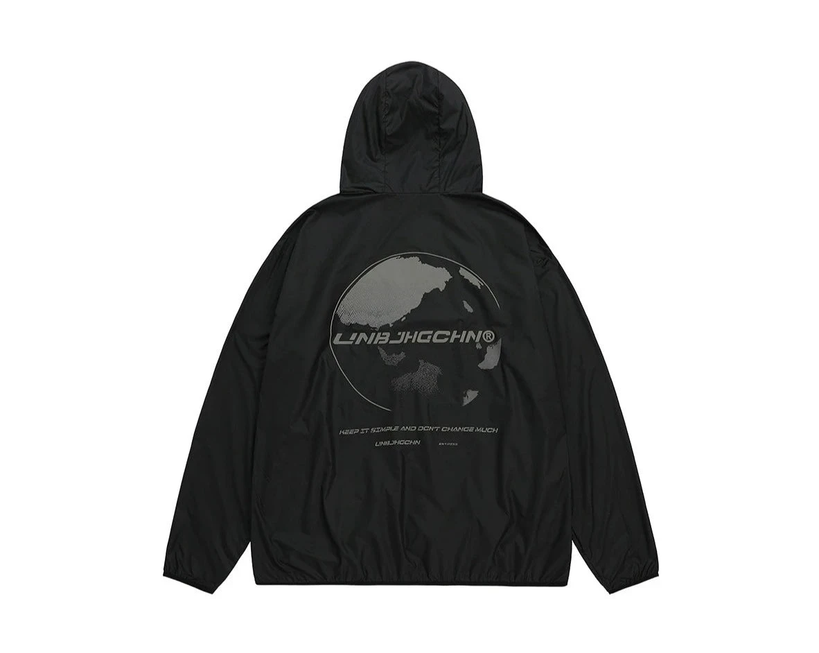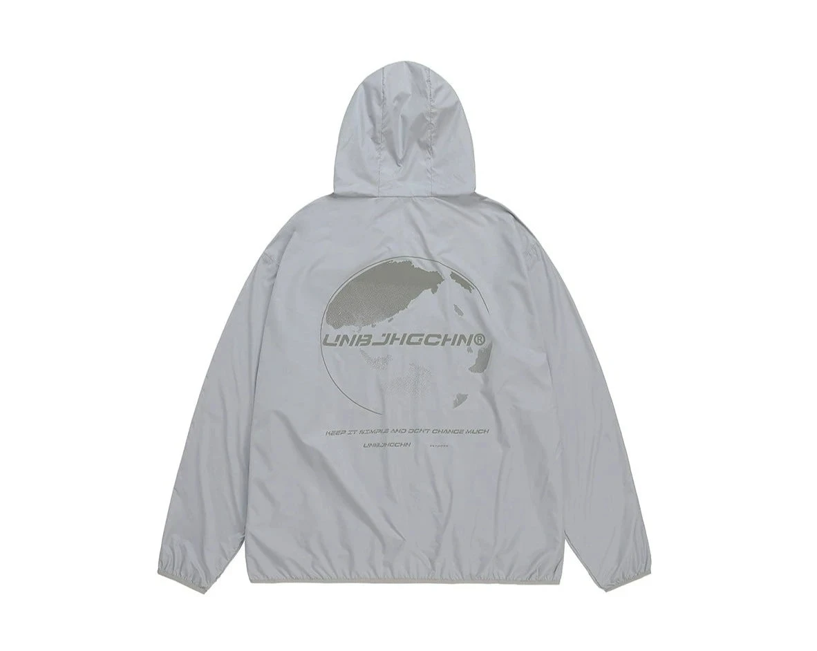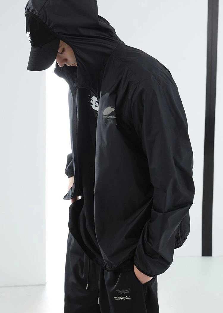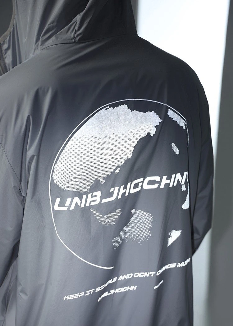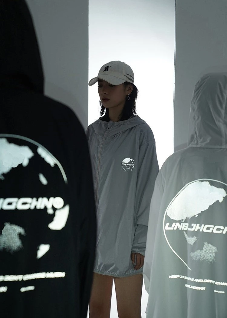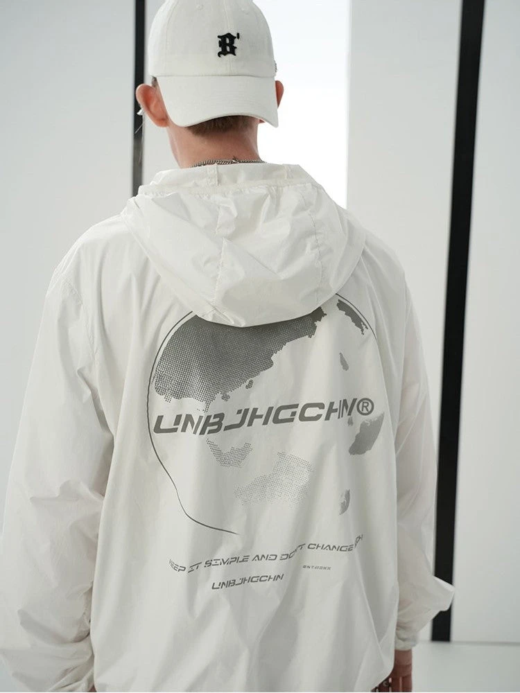BJHG ultraviolet protection jacket, brimmed hood, zip closure, welt pockets, elasticized cuffs, DTG print with reflective ink at front and back.