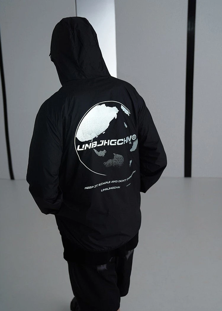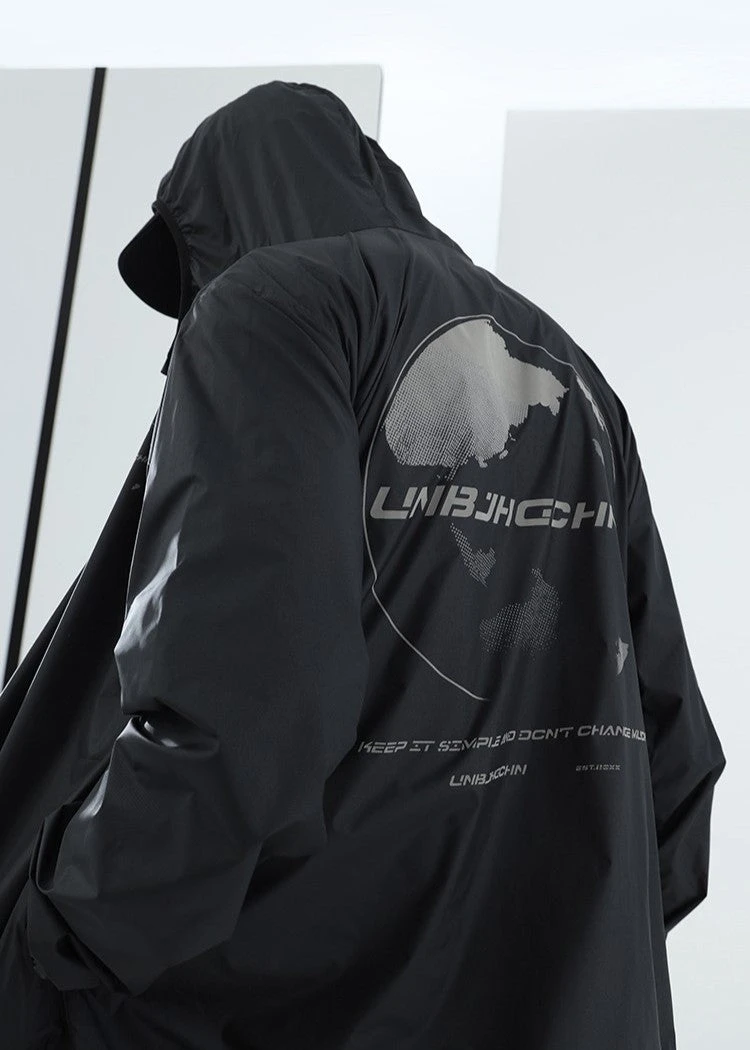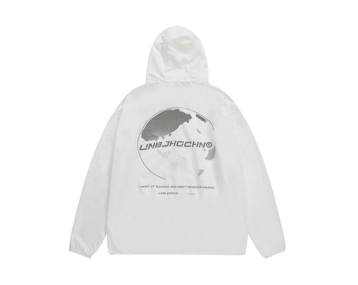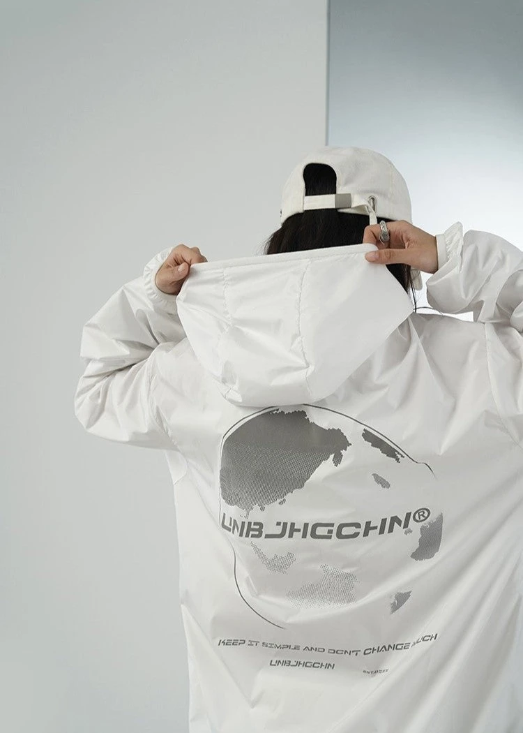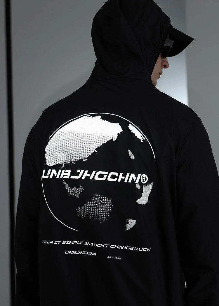 BJHG ultraviolet protection jacket, brimmed hood, zip closure, welt pockets, elasticized cuffs, DTG print with reflective ink at front and back.