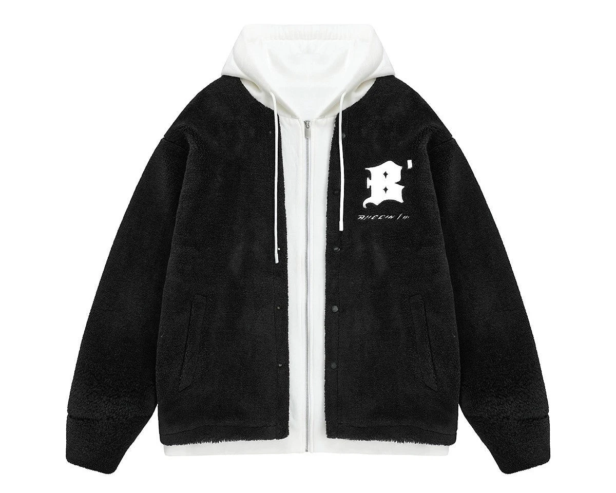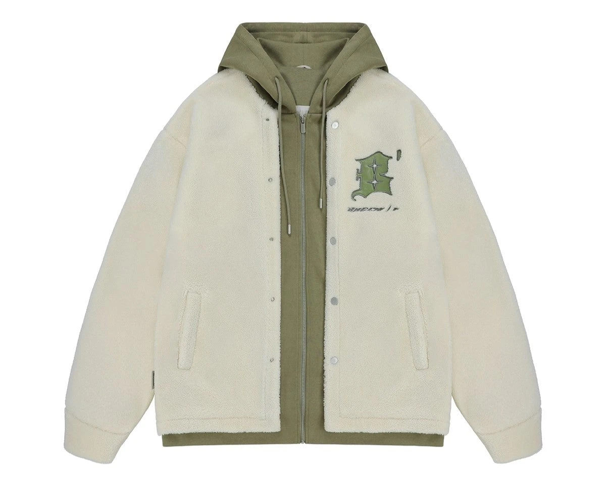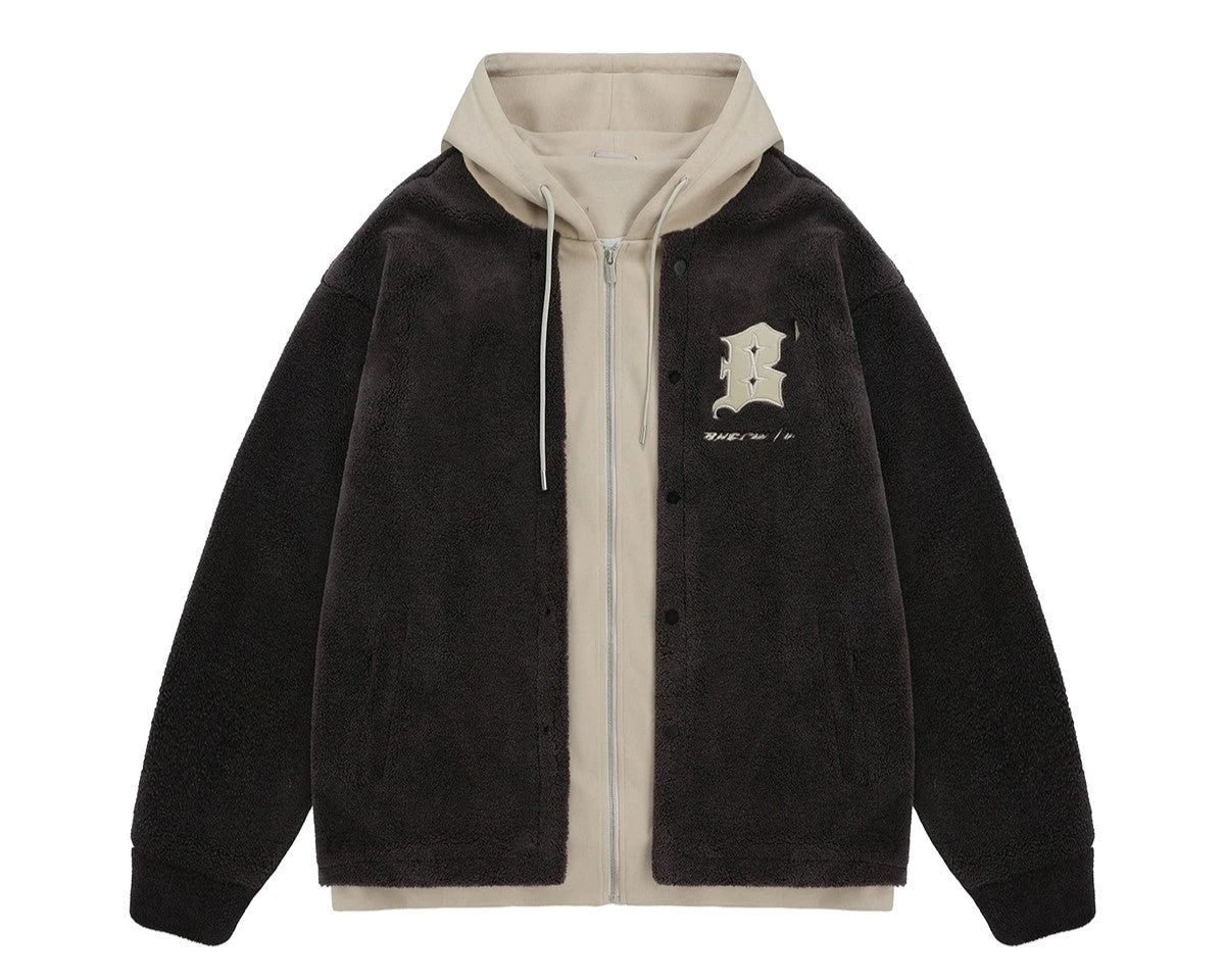 BJHG cotton-blend jacket, fleece exterior, layered construction, rib knit cuffs and hem, drawstring at hood, dropped shoulders, summary and zip closure, welt pockets, logo patch embroidered at front and back.Â