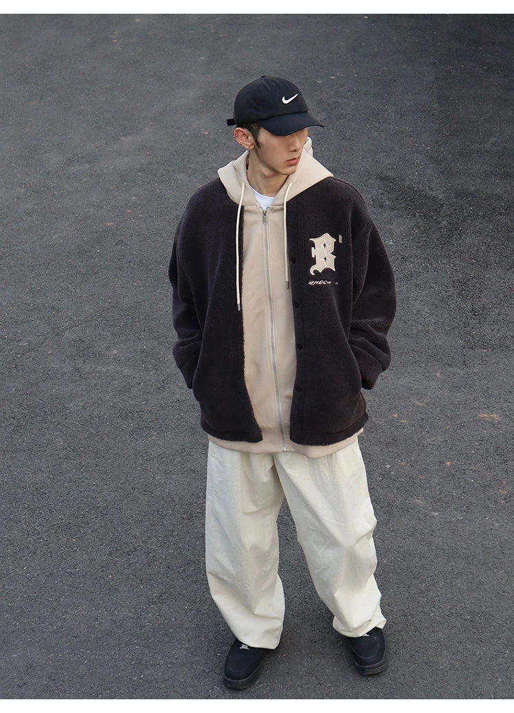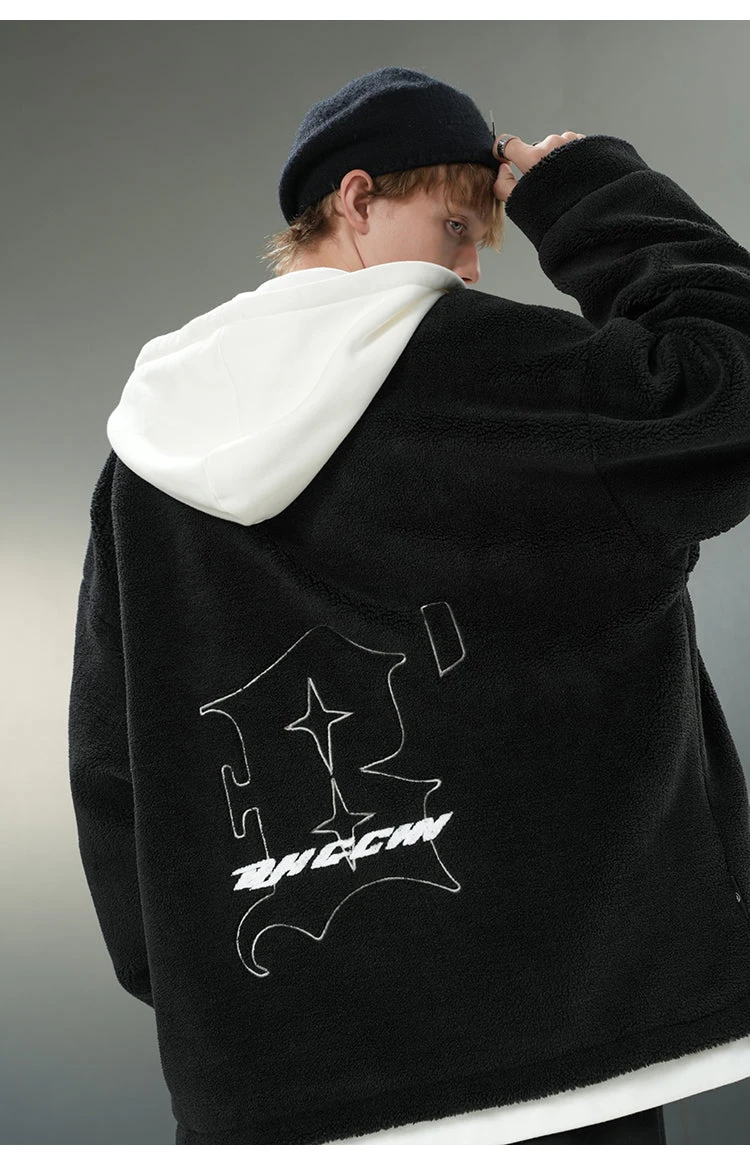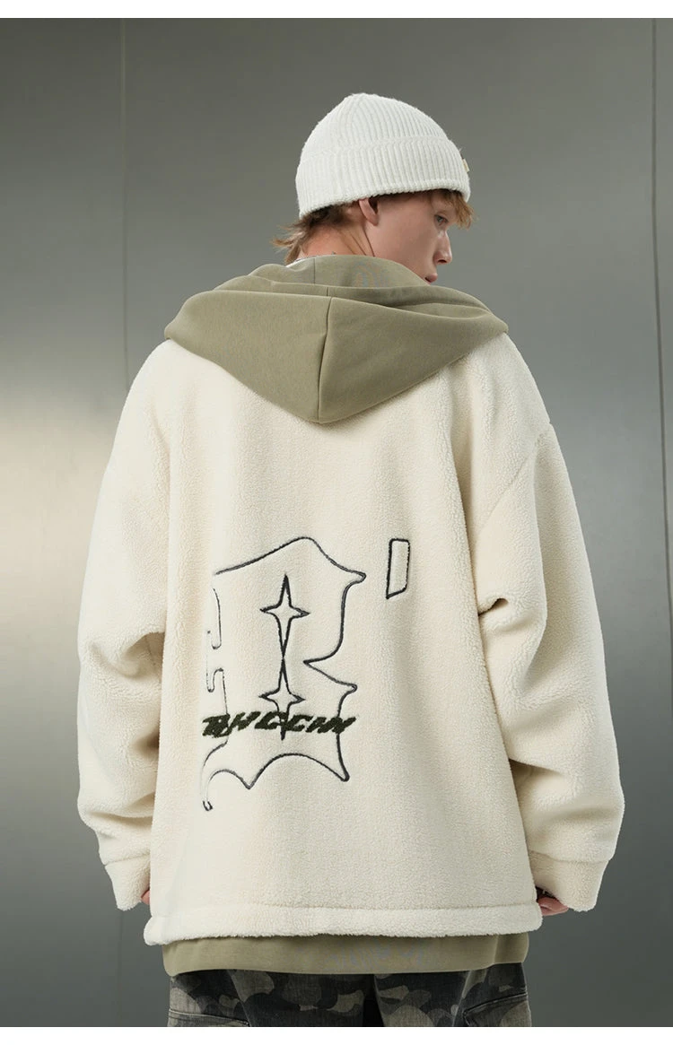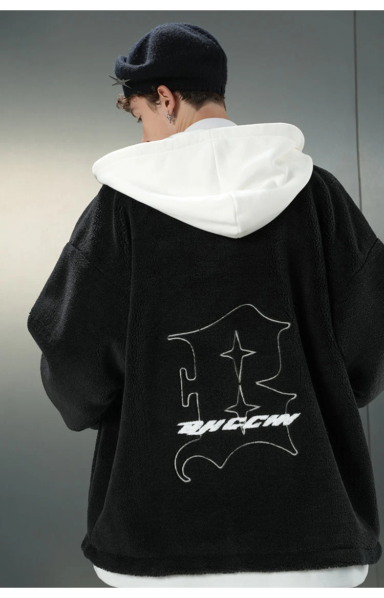 BJHG cotton-blend jacket, fleece exterior, layered construction, rib knit cuffs and hem, drawstring at hood, dropped shoulders, summary and zip closure, welt pockets, logo patch embroidered at front and back.Â