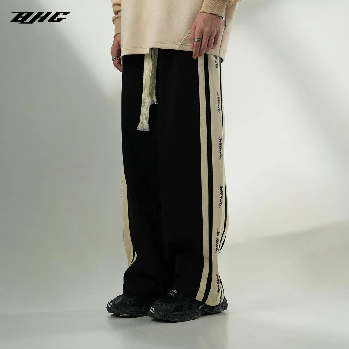 Technical velour wideleg lounge pants, elasticated waistband with flat adjustable drawstring, parallel suede track stripes, open straight/finished hem bottoms, tonal stitching.Â