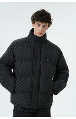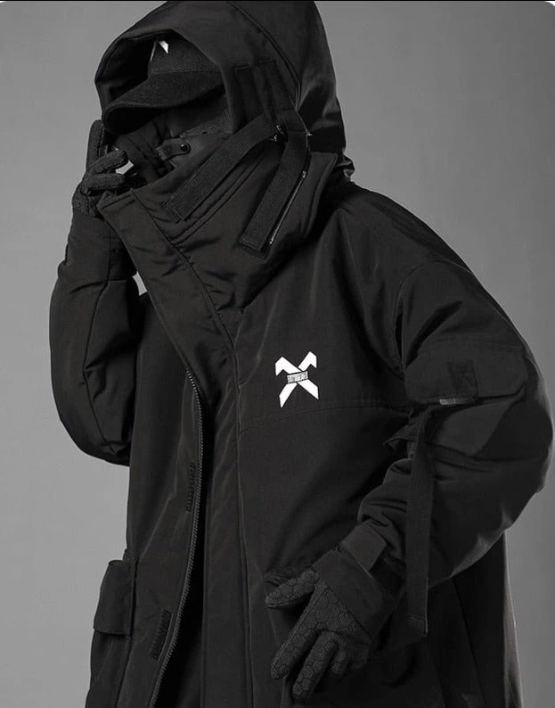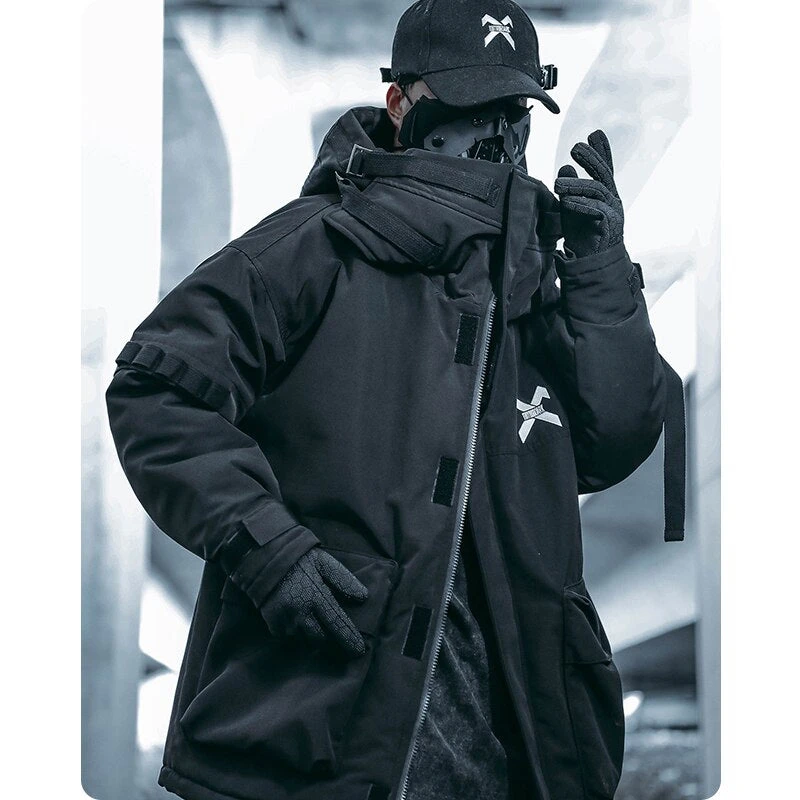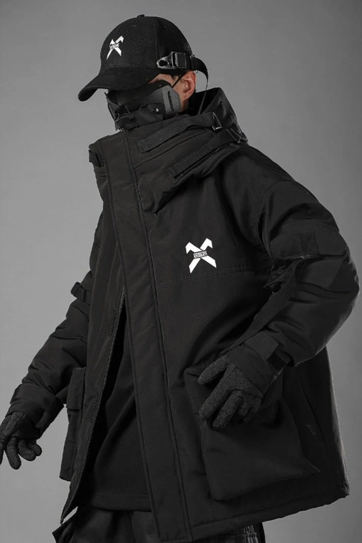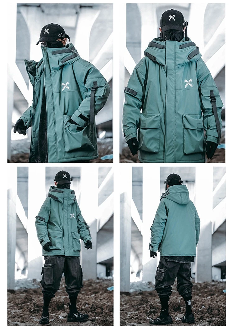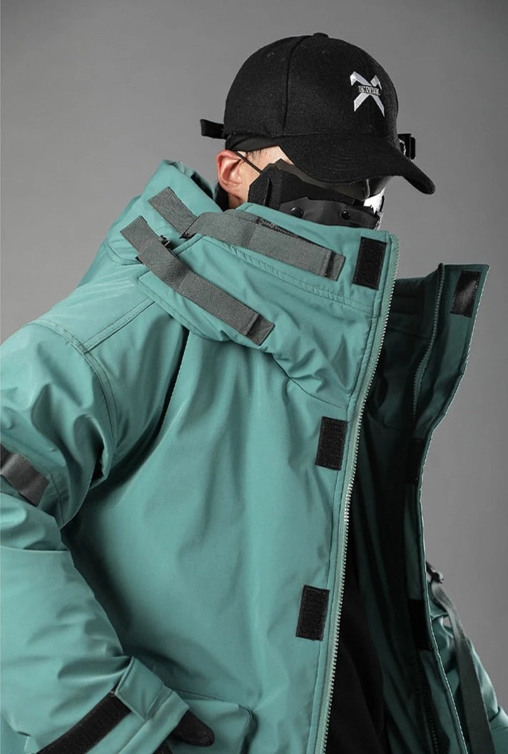 BXB Dark’s Nylon Parka Jacket in green and black, extremely thick, waterproof and snow rated, utility pocket on sleeve, two front pockets on stomach, relaxed cuffs, flap pockets at waist, concealed steel zip closure, rubber embossed logo on left chest, closable chin guard.