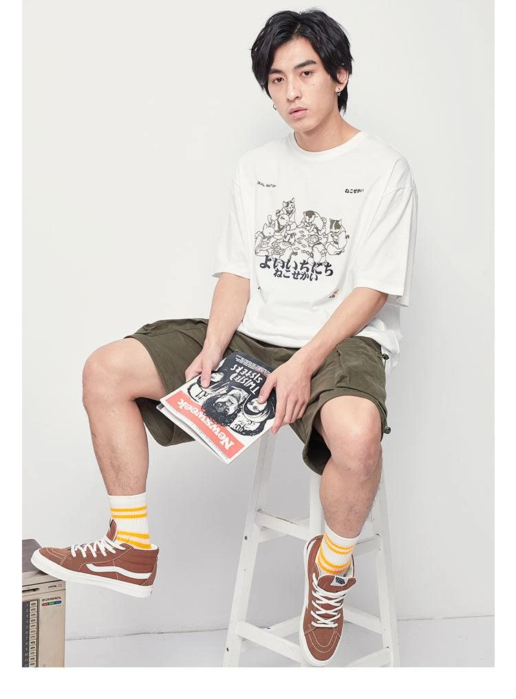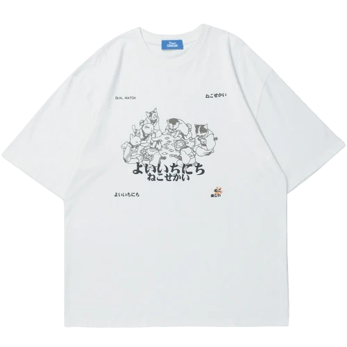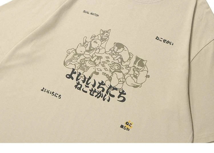 Cotton short sleeve shirt, rib knit crewneck/hem/cuffs, cat graphic printed at front.