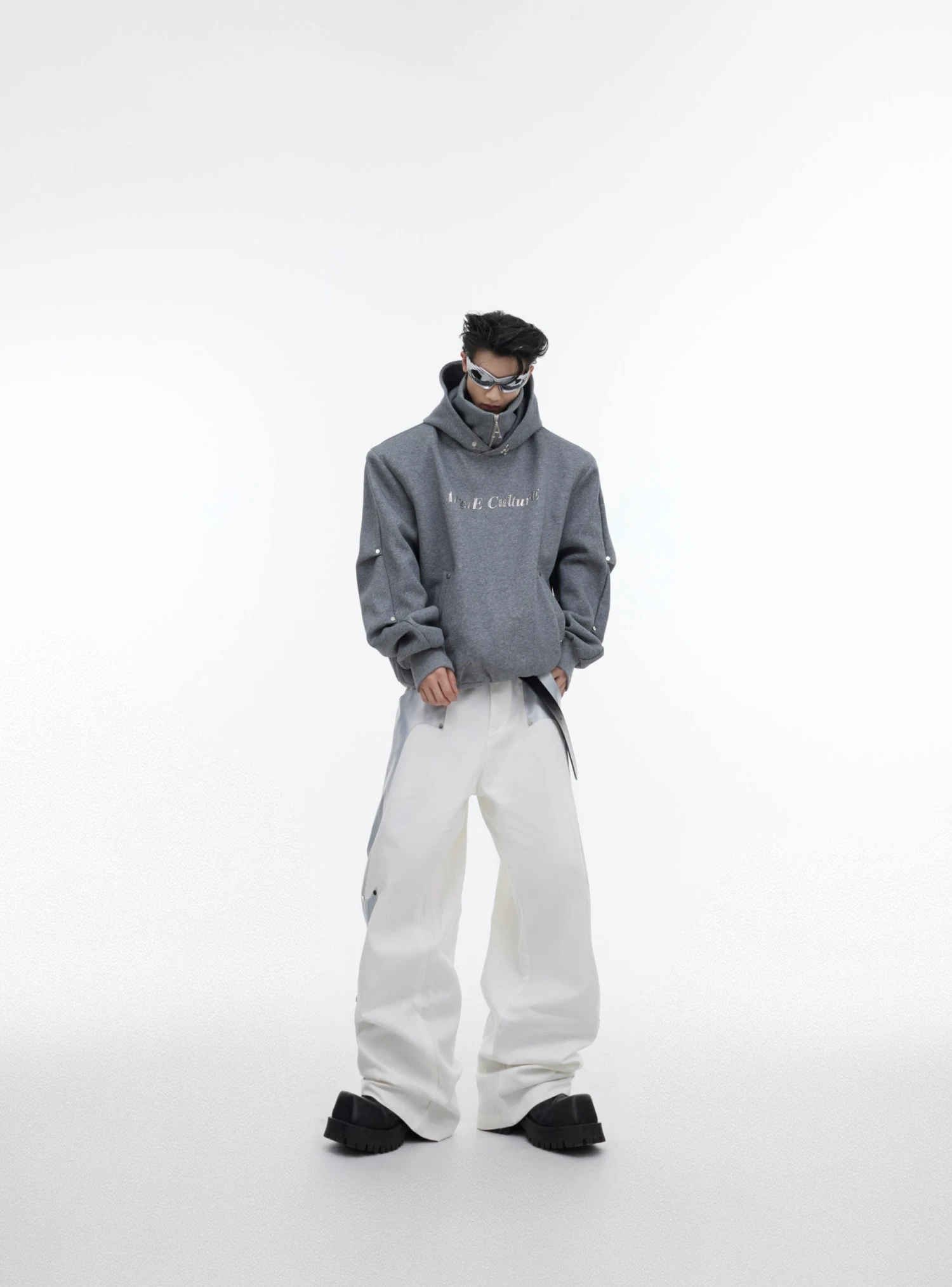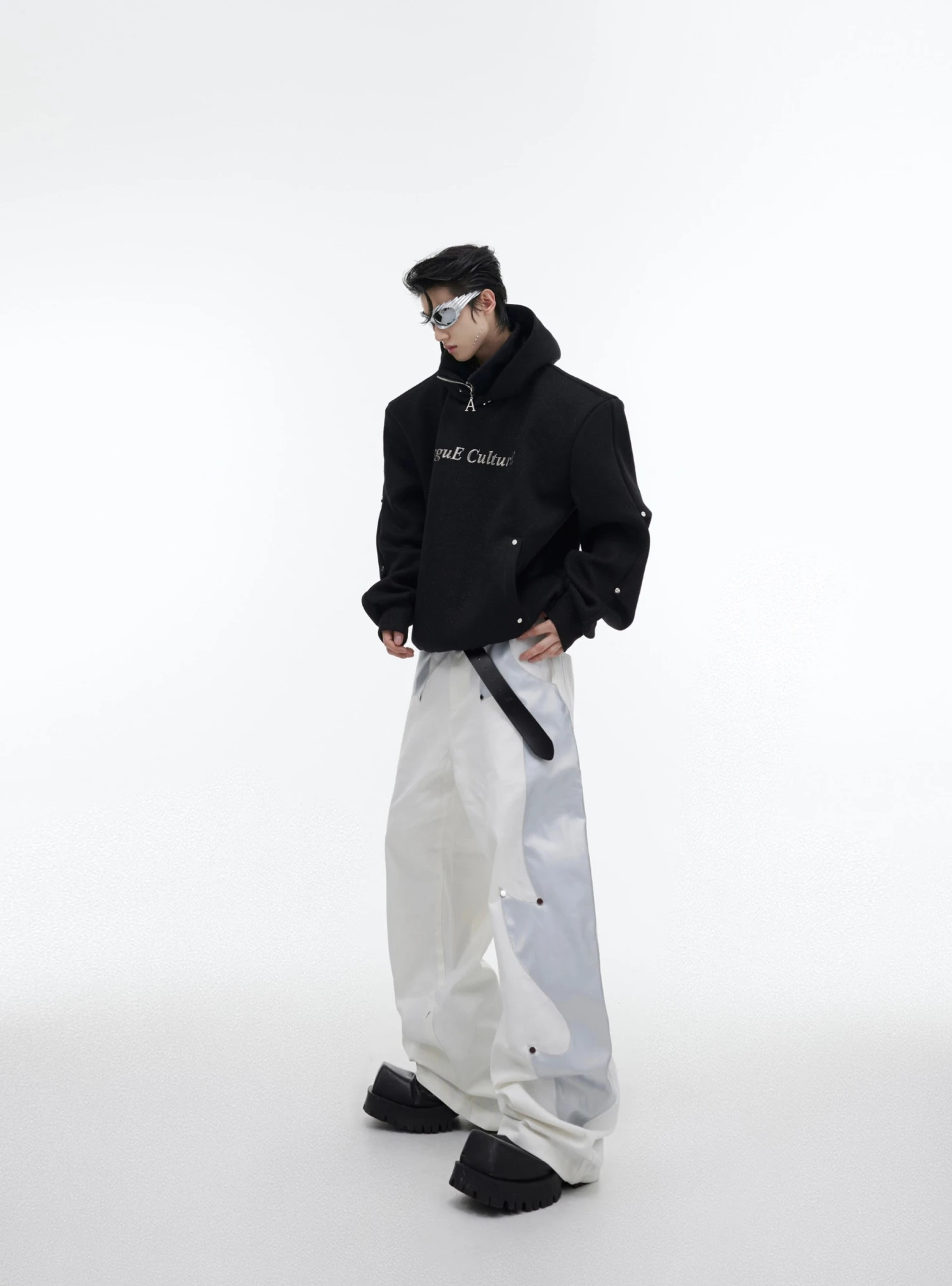 CulturE cotton-blend trousers, press-stud detailing, pleats throughout, belt loops, zip-fly.