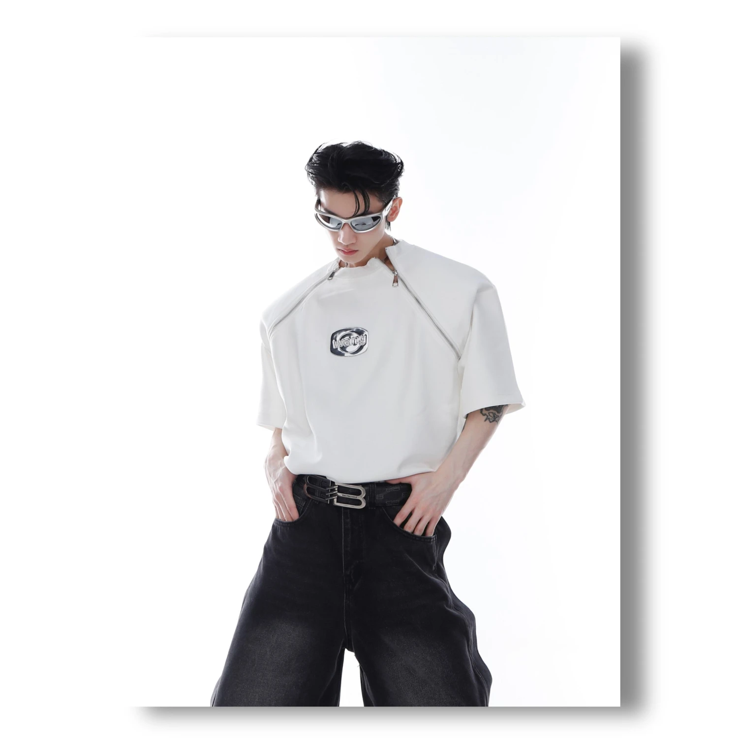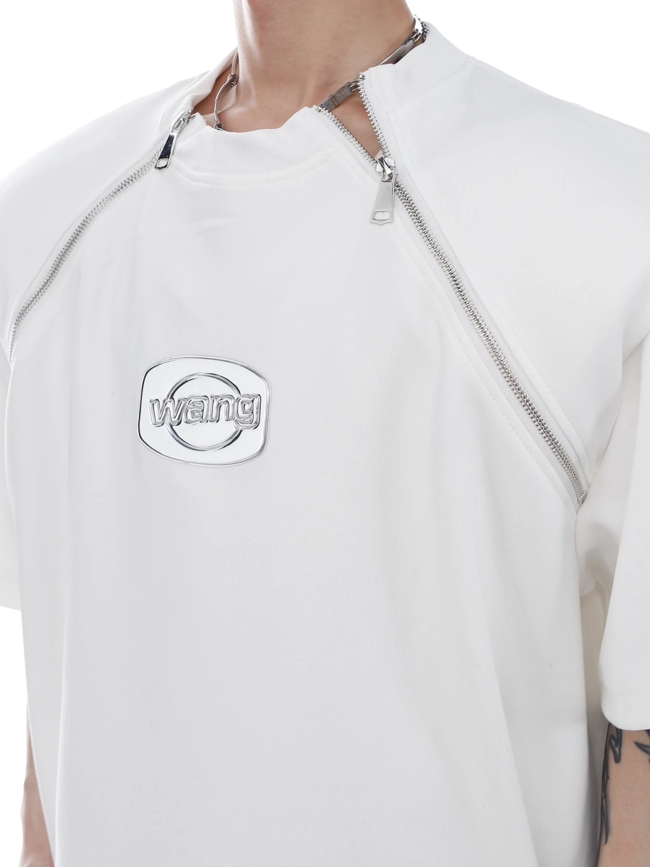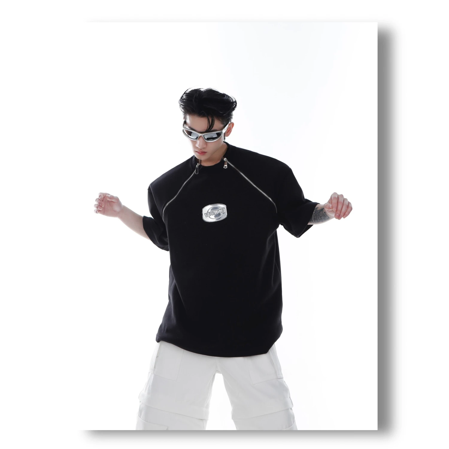 CulturE short sleeve cotton shirt, rib-knit crewneck, half-zip closure and silver-tone hardware at front.