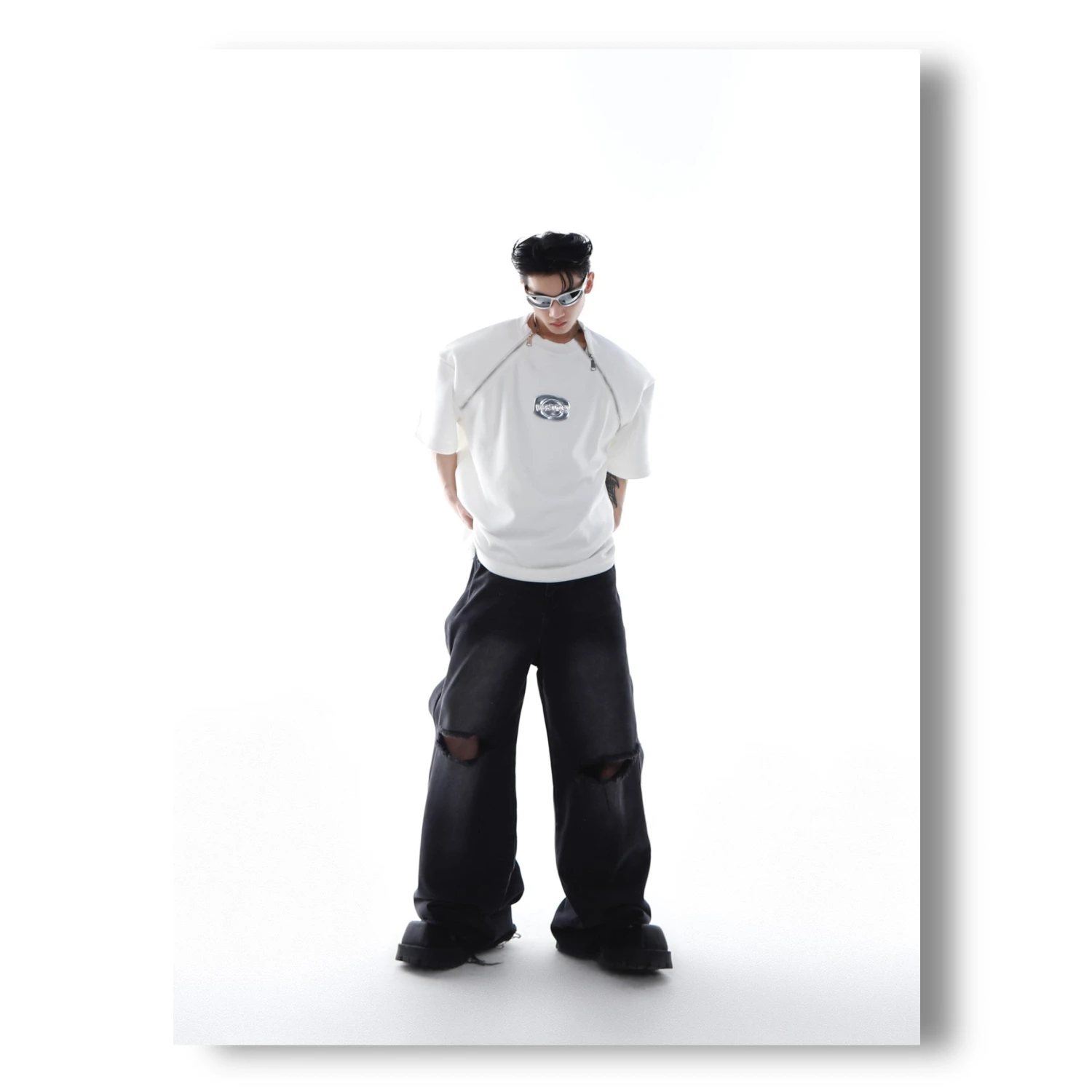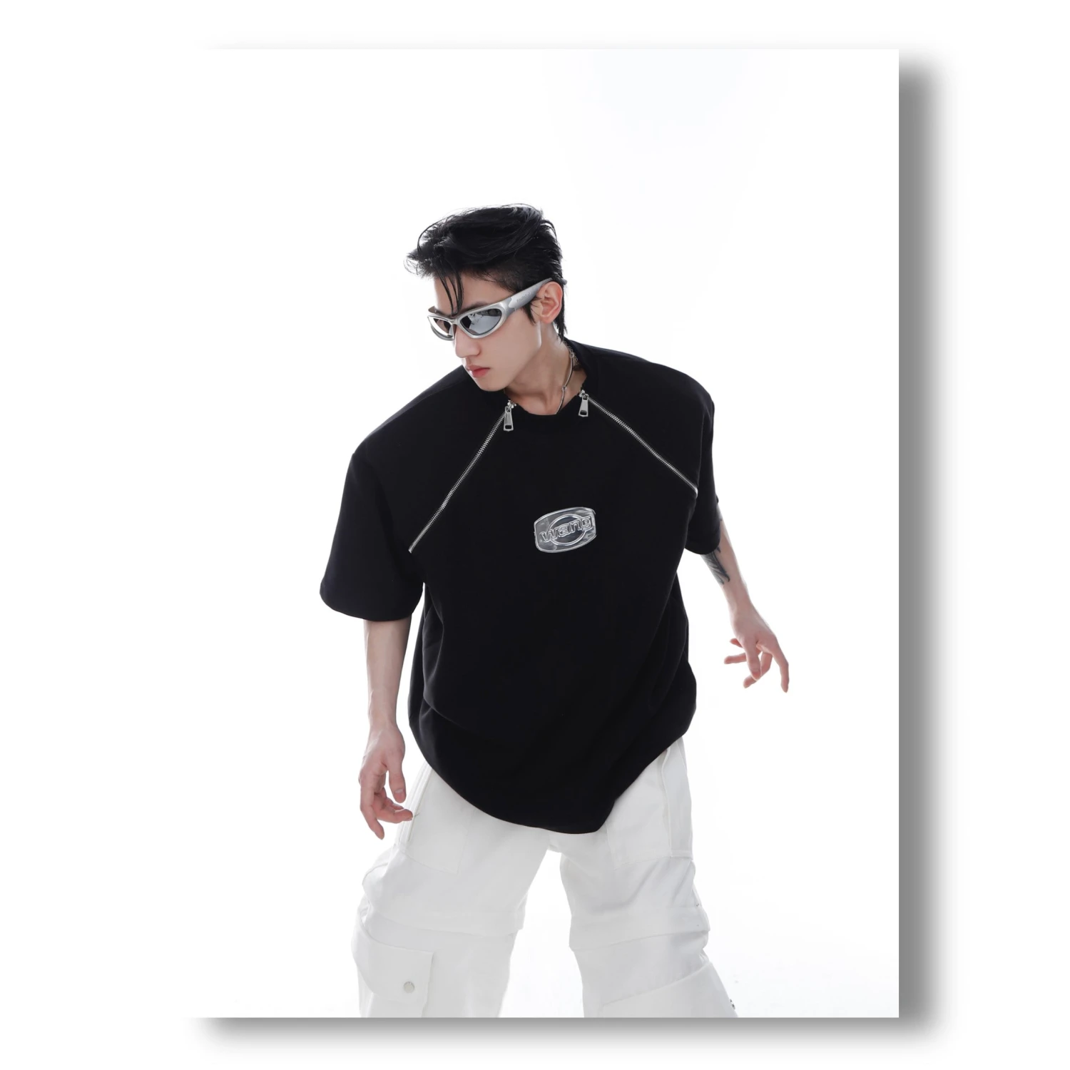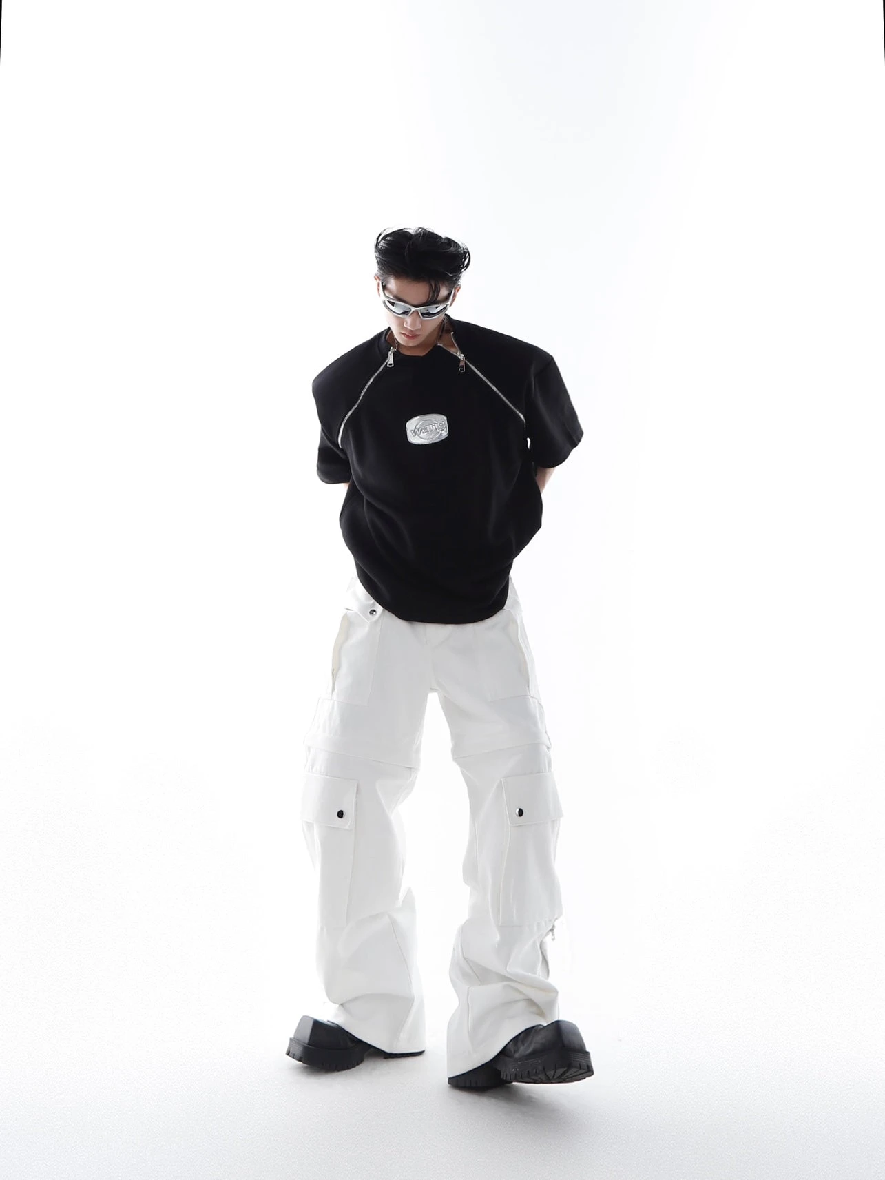 CulturE short sleeve cotton shirt, rib-knit crewneck, half-zip closure and silver-tone hardware at front.