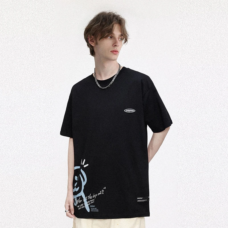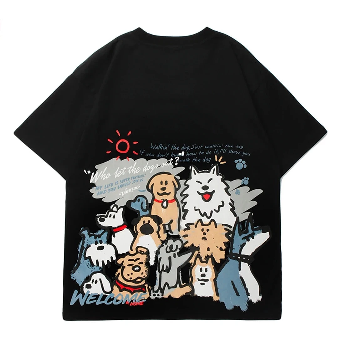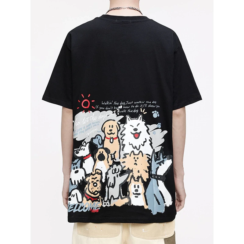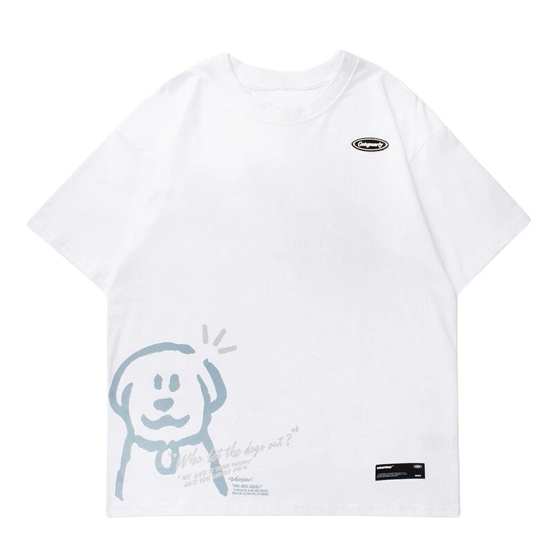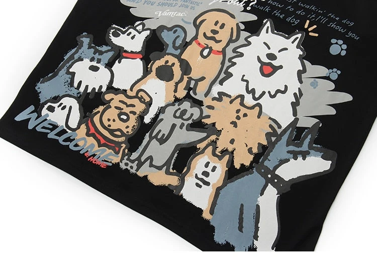 Cotton short sleeve shirt, rib knit crewneck, text patch at chest, dog design printed at front and back.