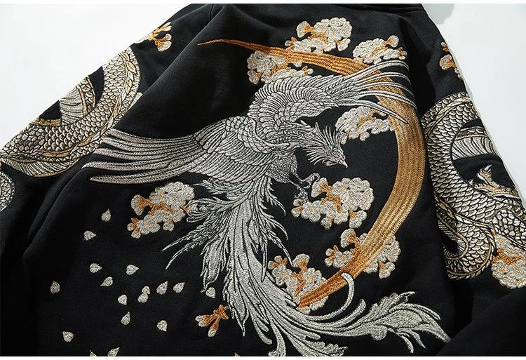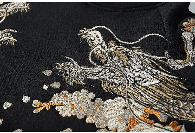 Cotton hoodie, rib knit crewneck/hem/cuffs, intricate phoenix design embroidered at back – detailing a crescent moon, dragons embroidered at chest to sleeves, beautifully embroidered sakura petals throughout. The Houou, known as the phoenix in Japanese culture, symbolizes good fortune and prosperity.Â