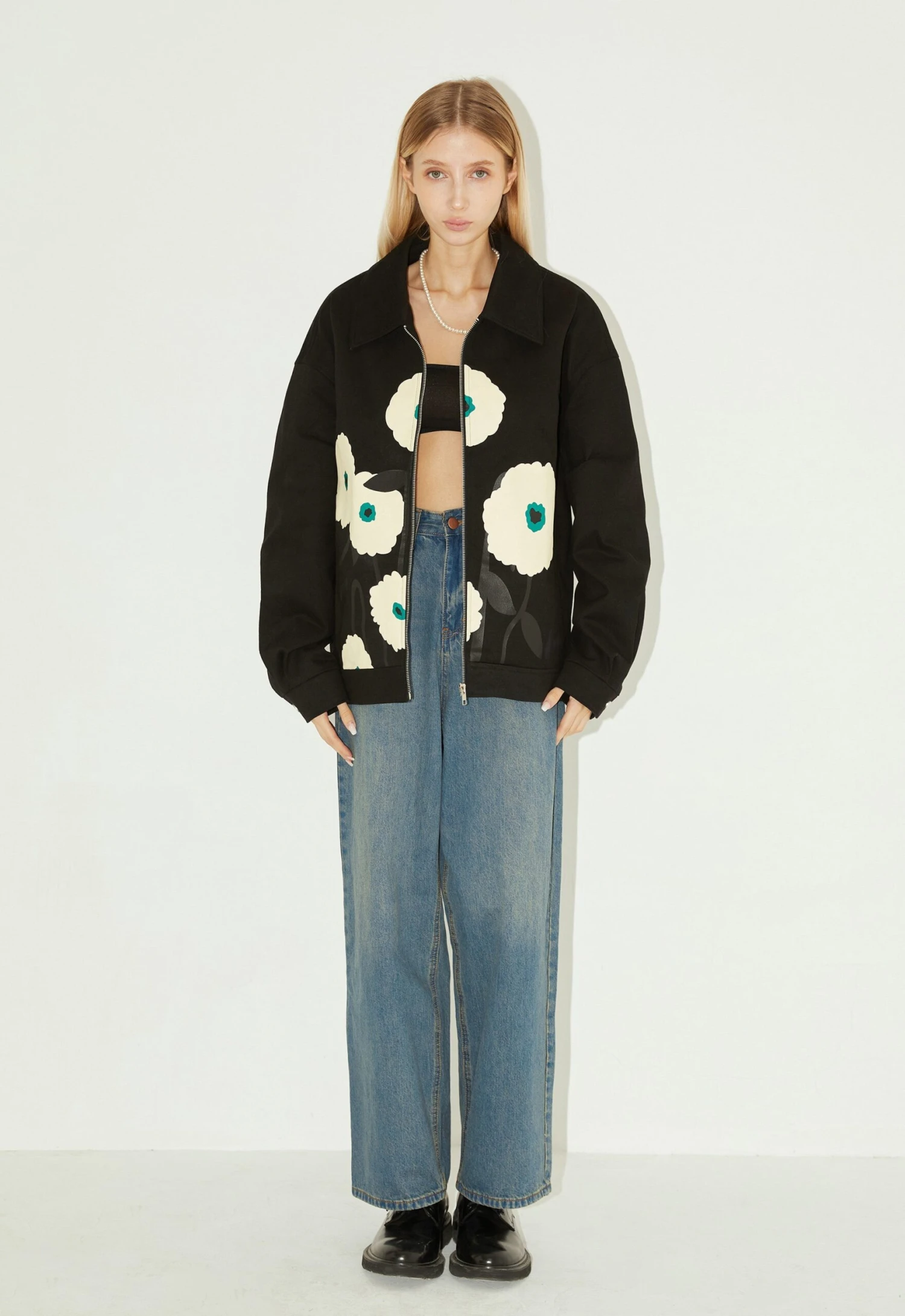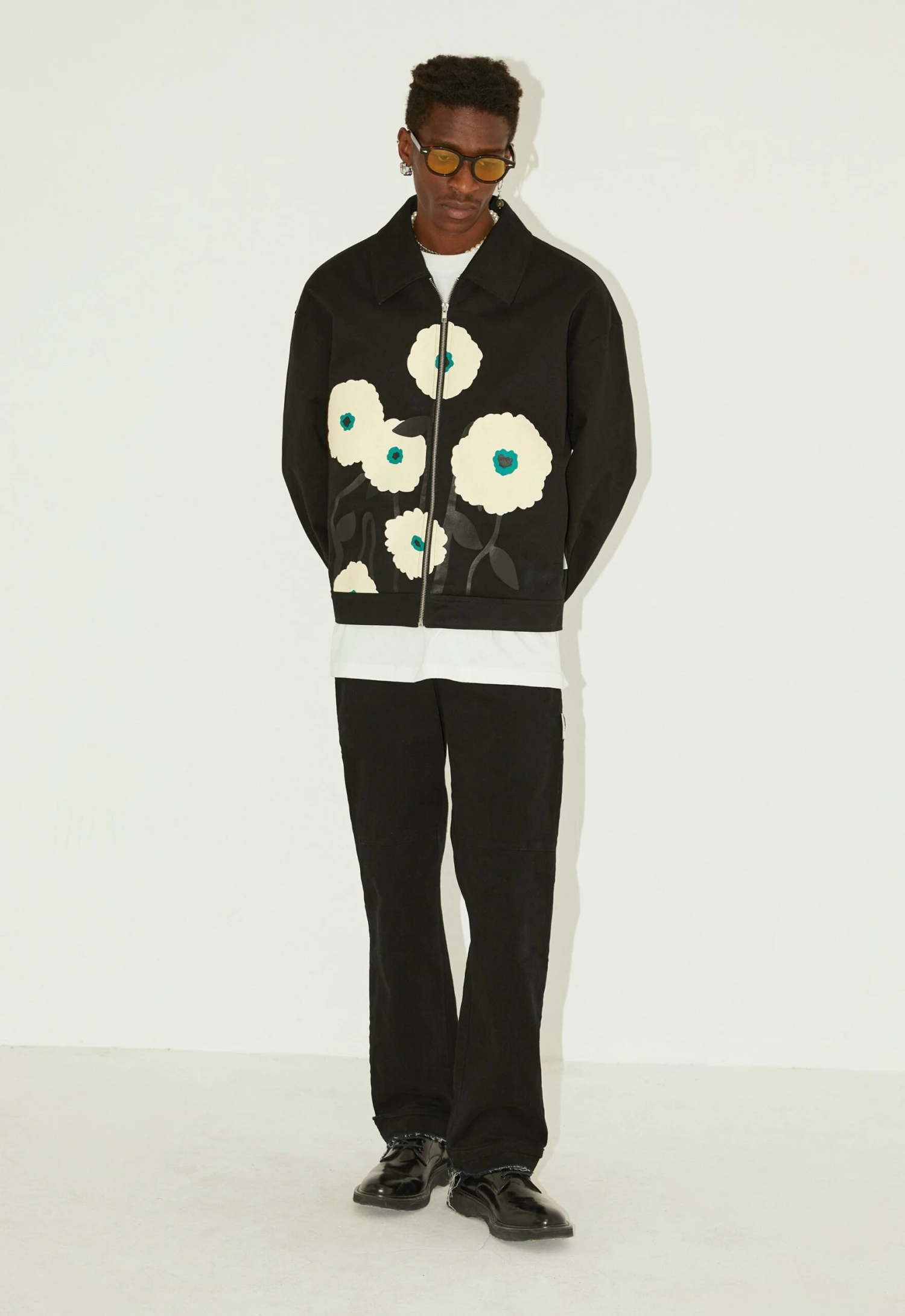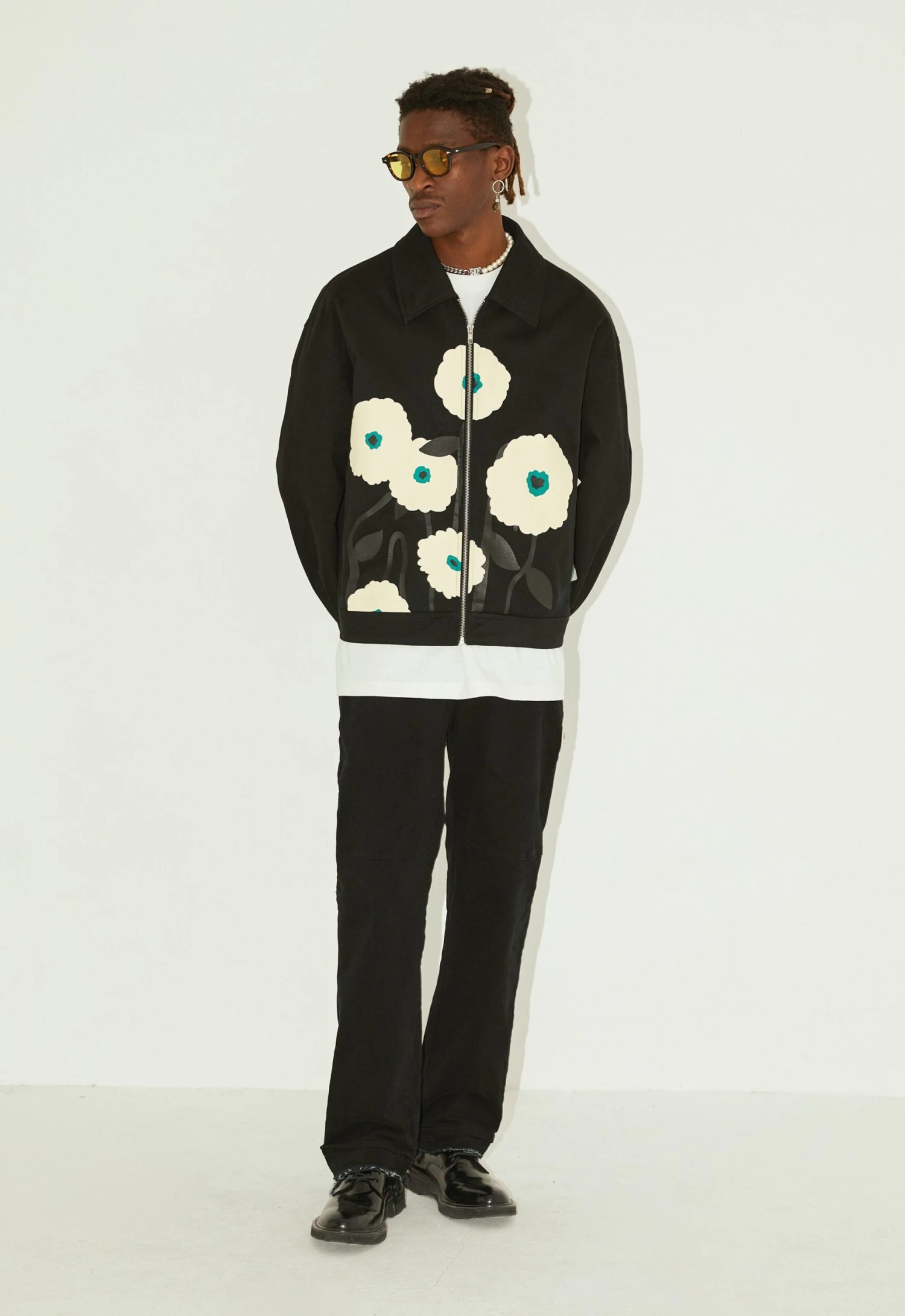 EMPTY REFERENCE polyester jacket, rib knit V-neck/hem/cuffs, zip closure, single-summary barrel cuffs, summarys attached at hem, flower graphic at front, logo embroidered at back.