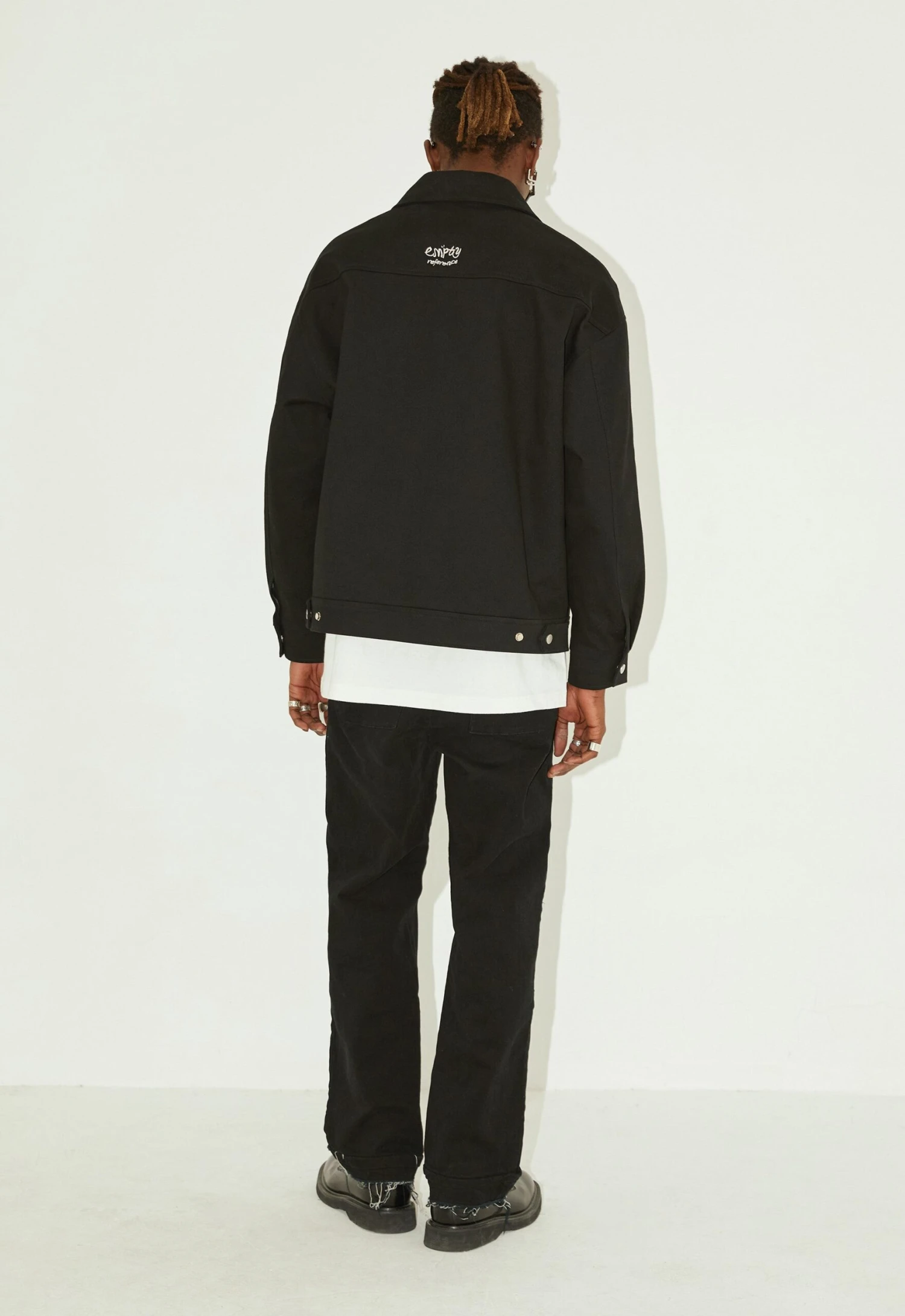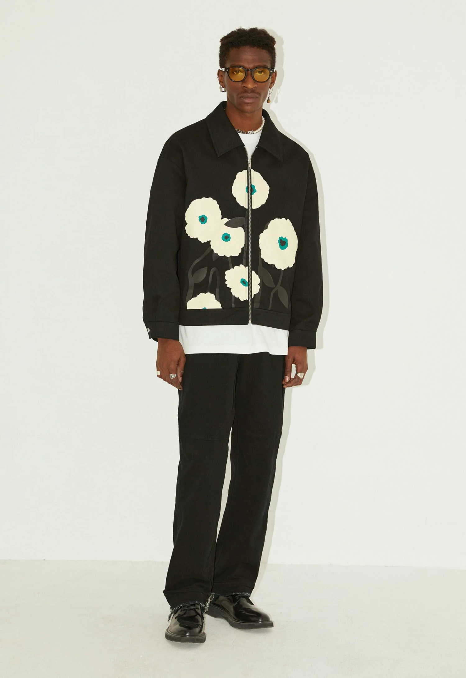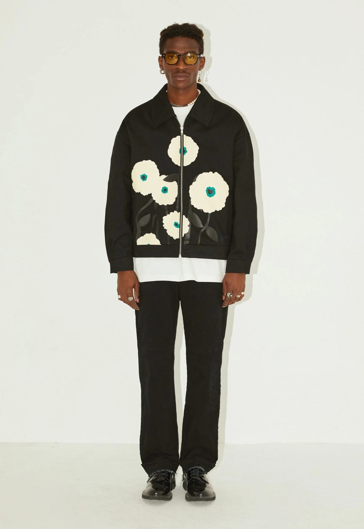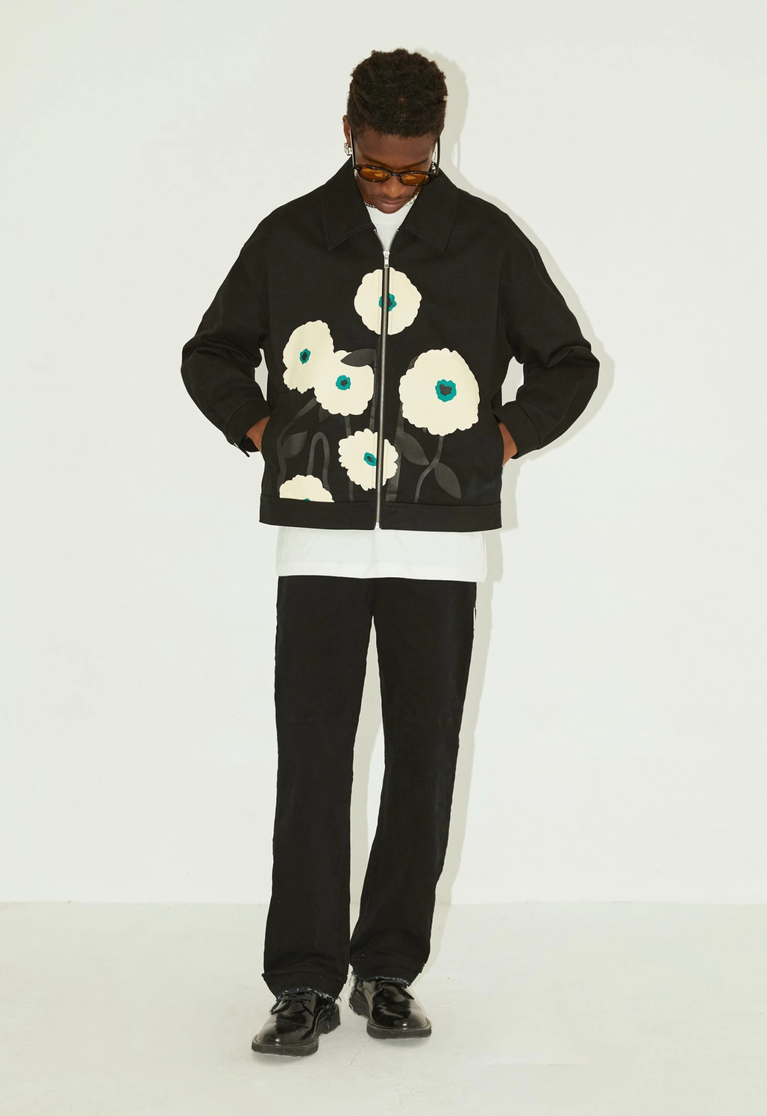 EMPTY REFERENCE polyester jacket, rib knit V-neck/hem/cuffs, zip closure, single-summary barrel cuffs, summarys attached at hem, flower graphic at front, logo embroidered at back.
