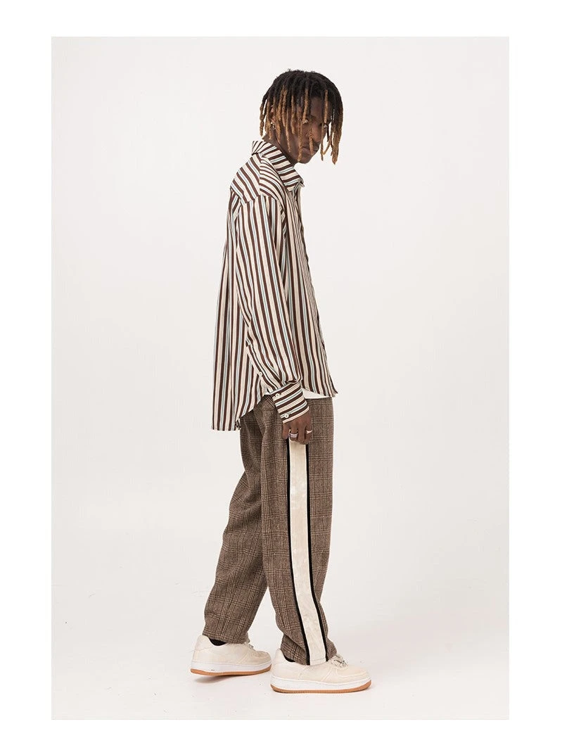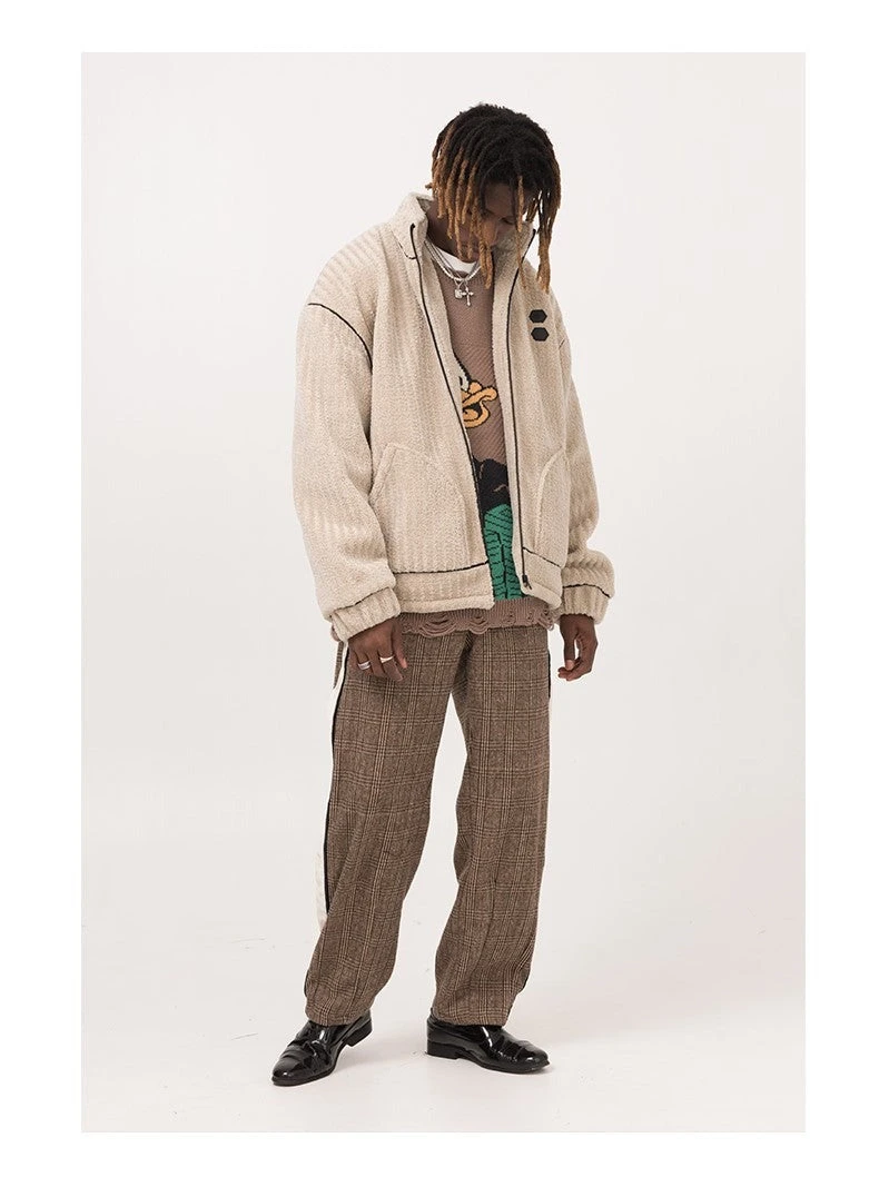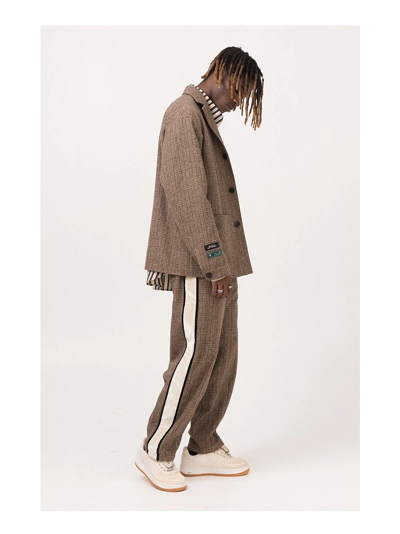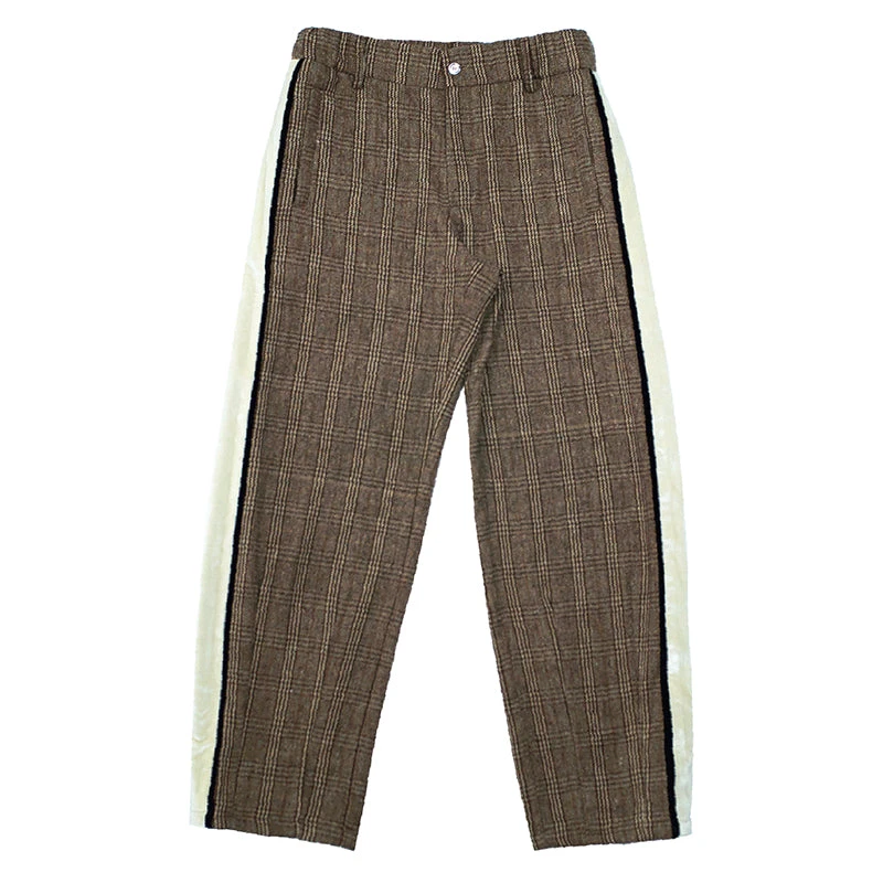 EMPTY REFERENCE wool pants, plaid patter throughout, belt loops, zip-fly, three-pocket styling, elasticized waistband, strip design at outseams.