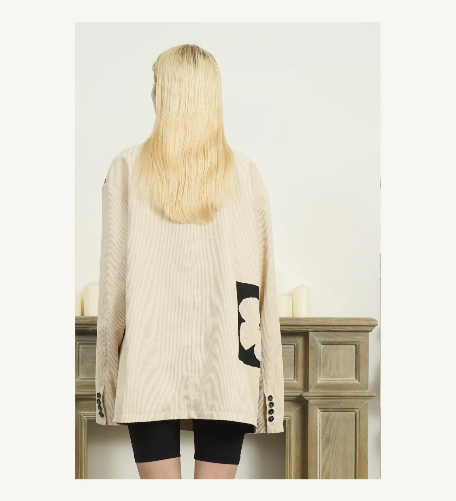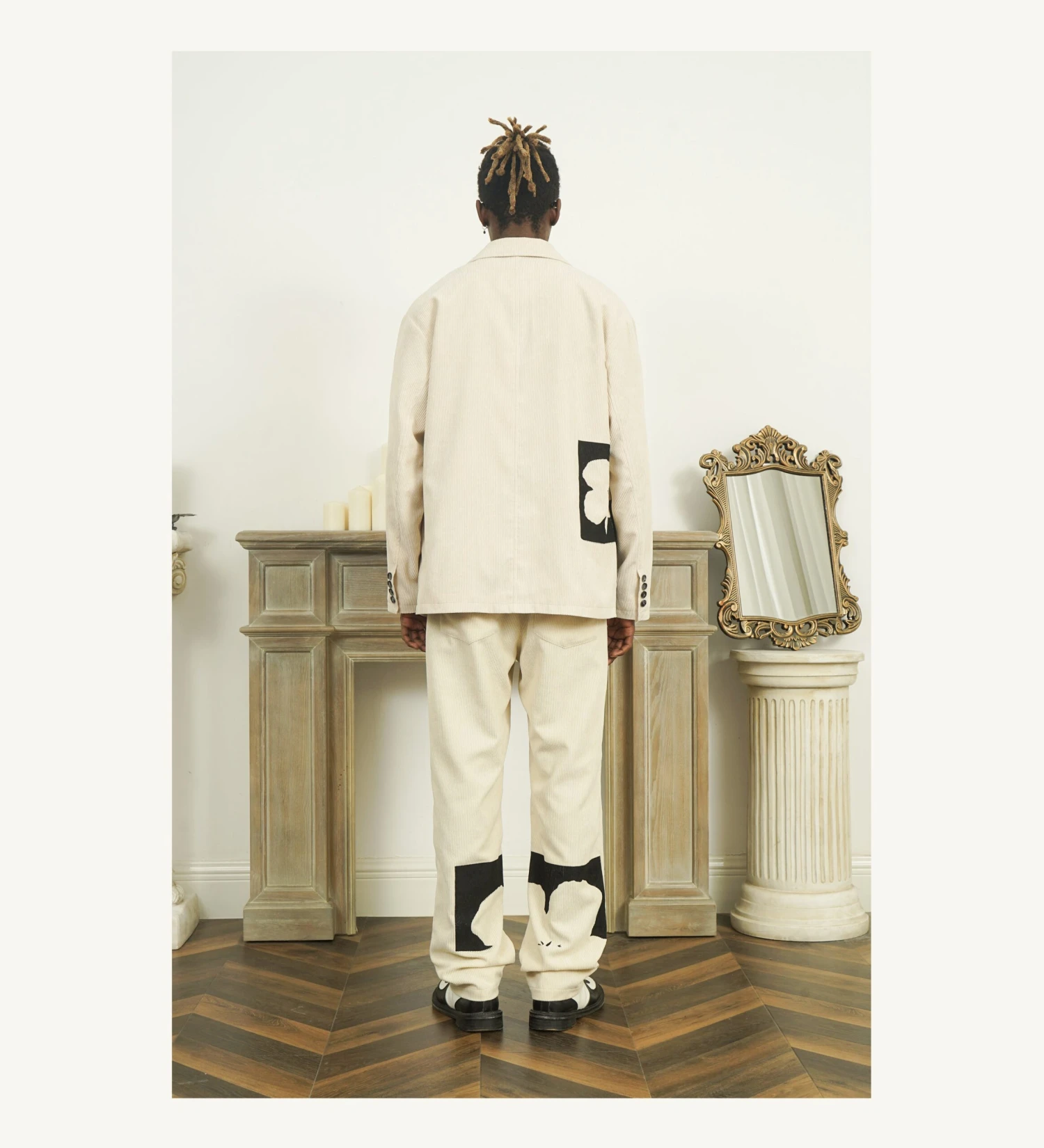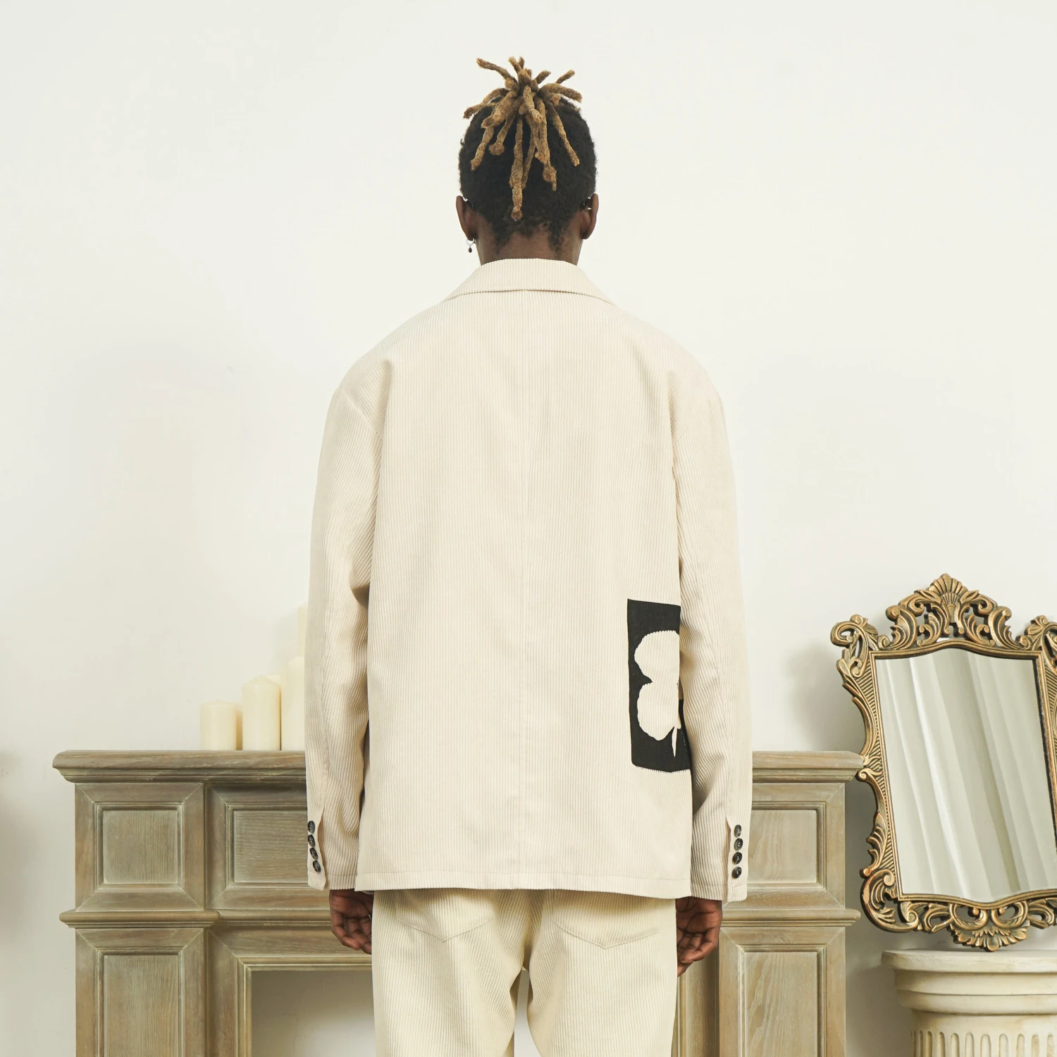 EMPTY REFERENCE corduroy cotton two-tone blazer, notched lapel, two-summary closure, welt pocket at chest, flap pockets at waist, flower cut-out designs embedded throughout, four-summary surgeon’s cuffs.