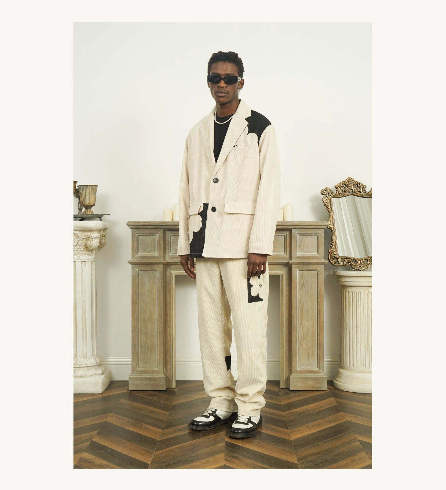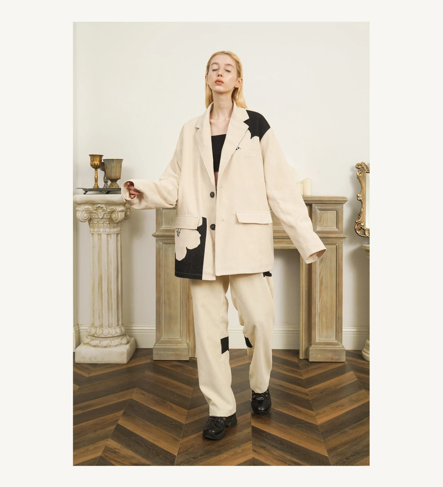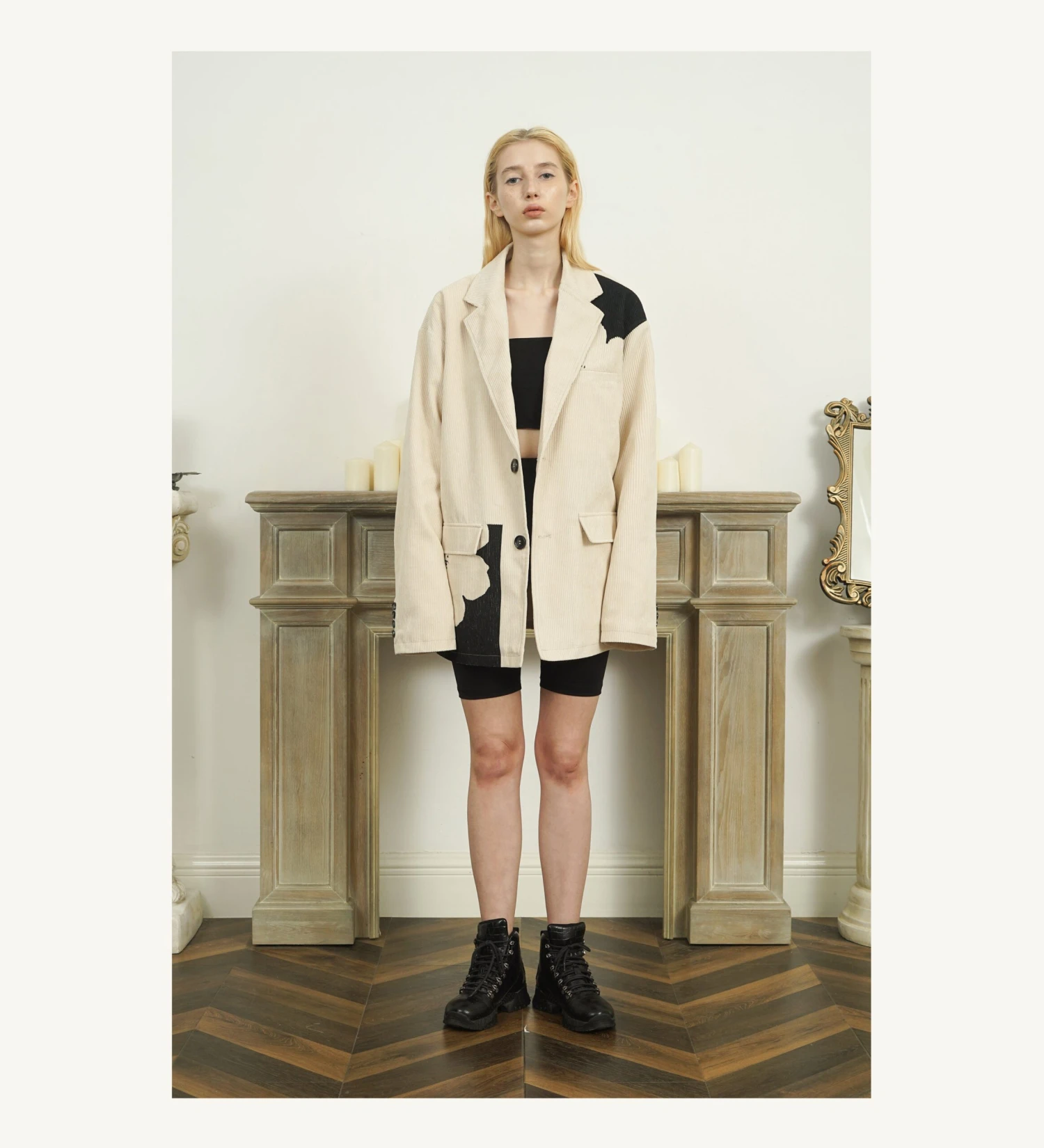 EMPTY REFERENCE corduroy cotton two-tone blazer, notched lapel, two-summary closure, welt pocket at chest, flap pockets at waist, flower cut-out designs embedded throughout, four-summary surgeon’s cuffs.