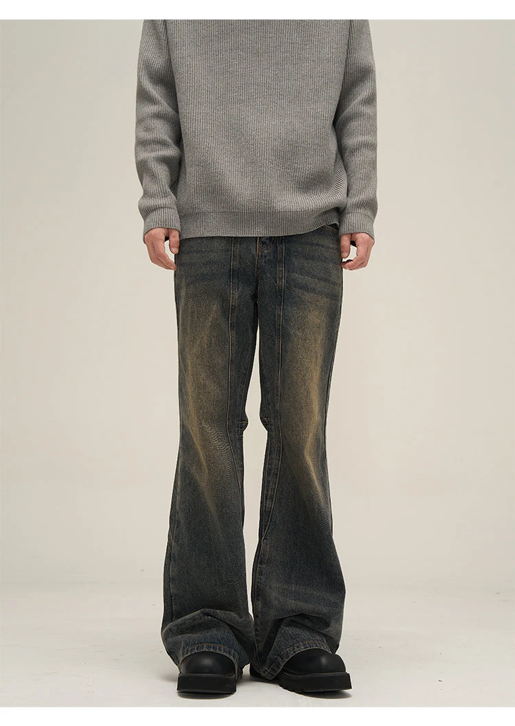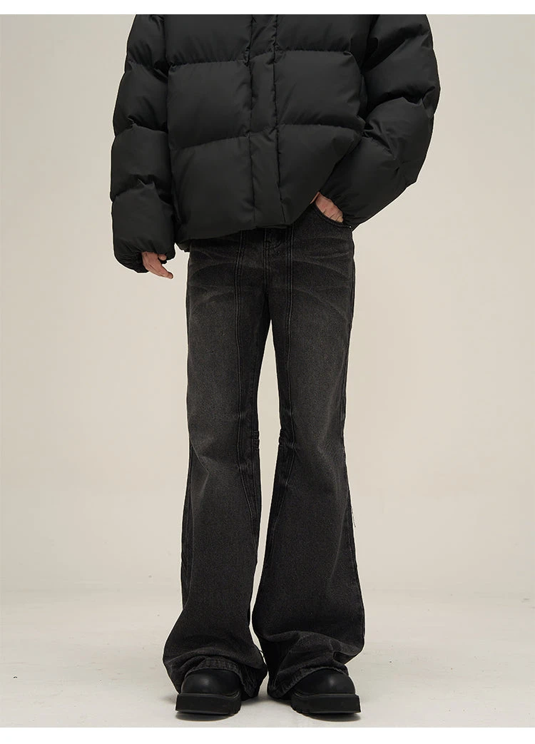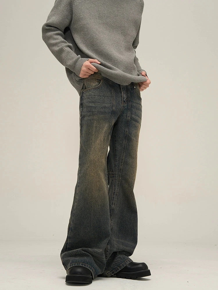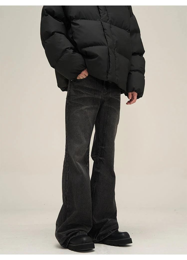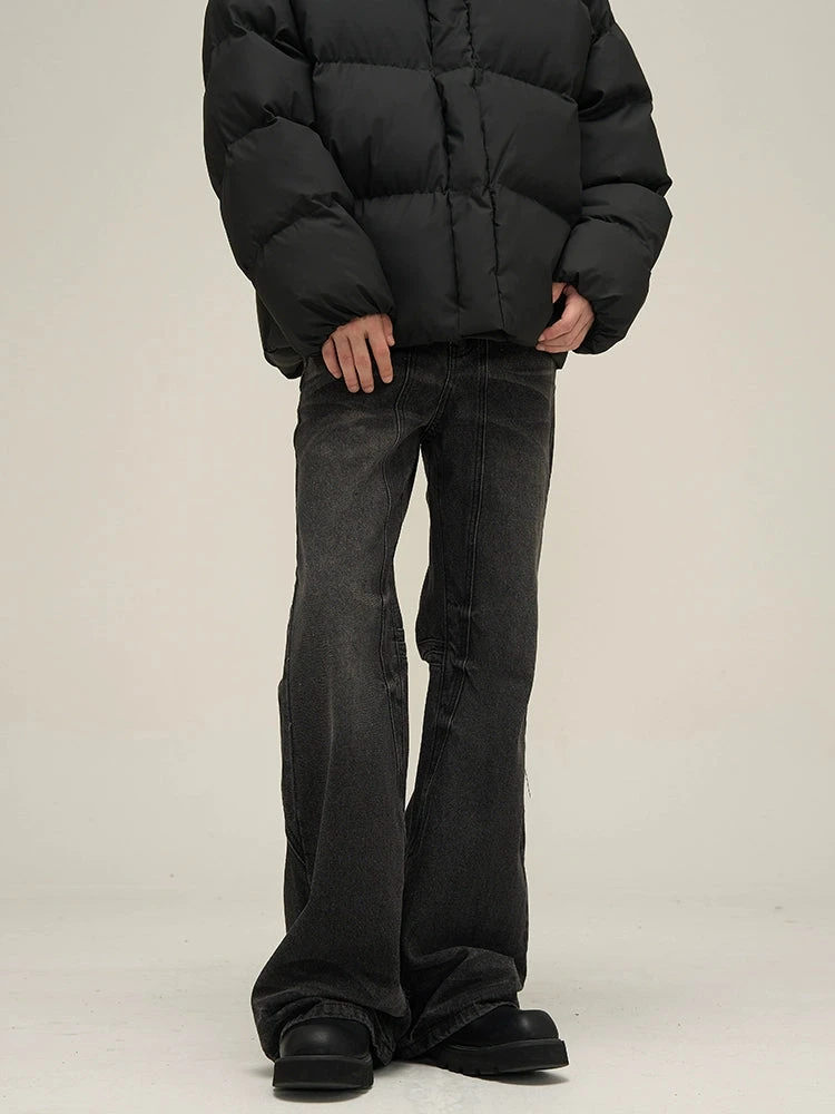 Flared denim jeans, paneled construction, fading and whiskering throughout, belt loops, four-pocket styling.