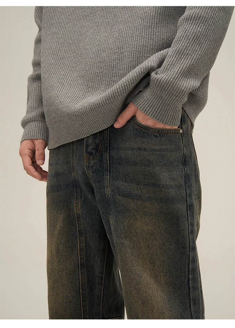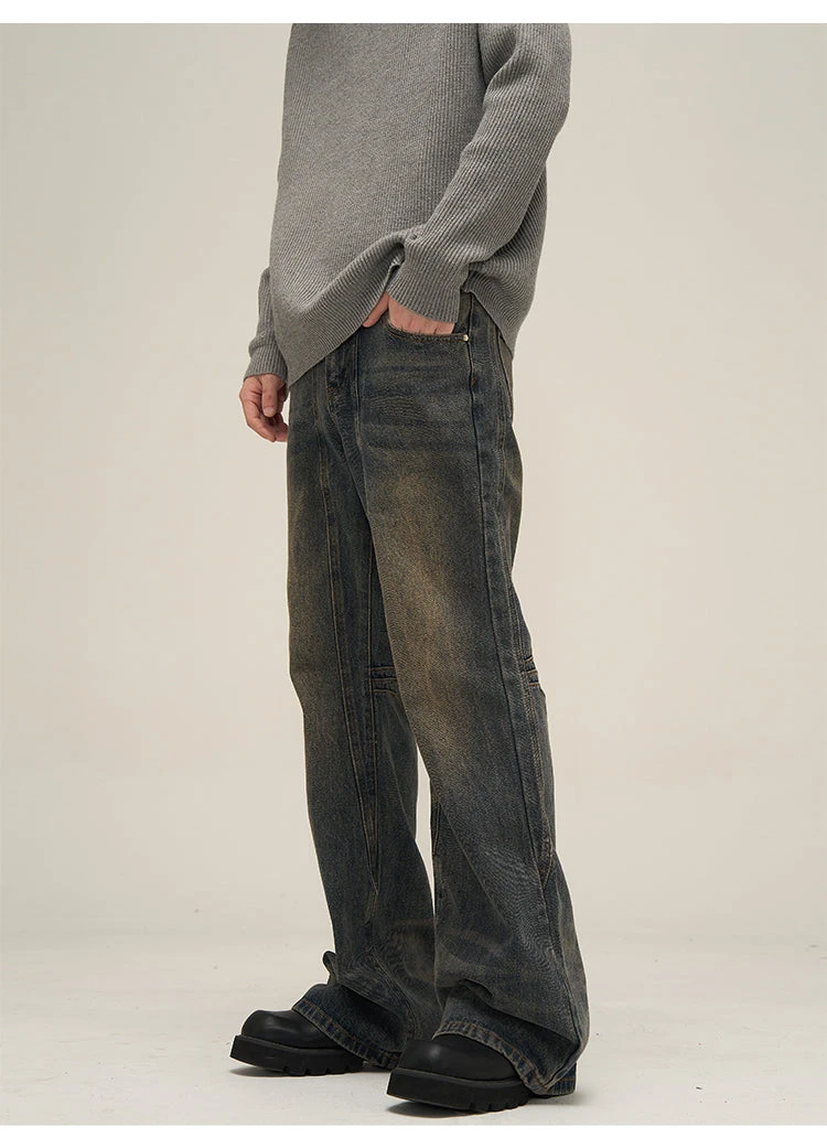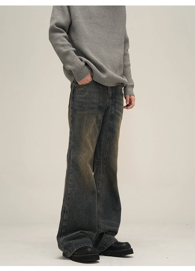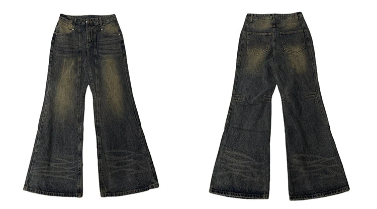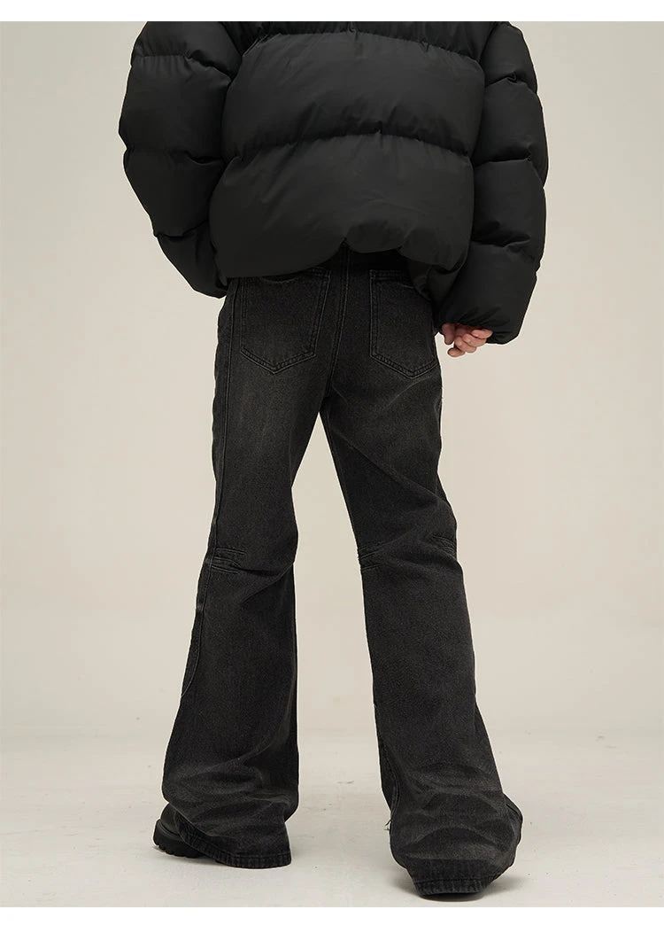 Flared denim jeans, paneled construction, fading and whiskering throughout, belt loops, four-pocket styling.