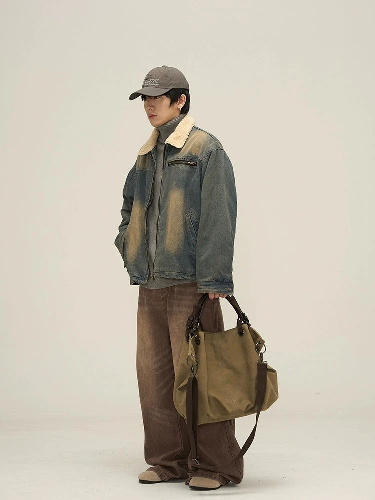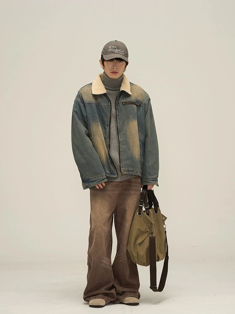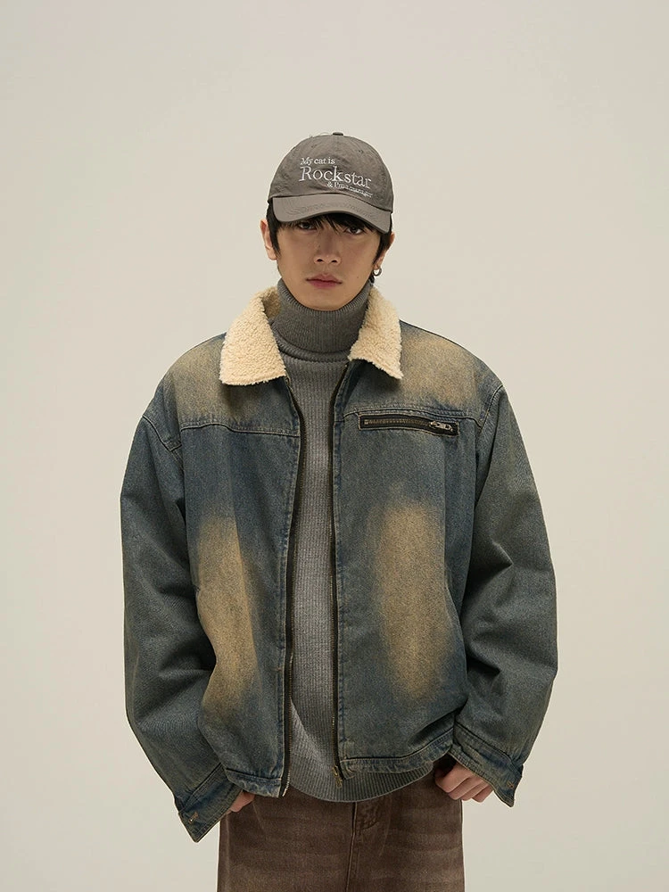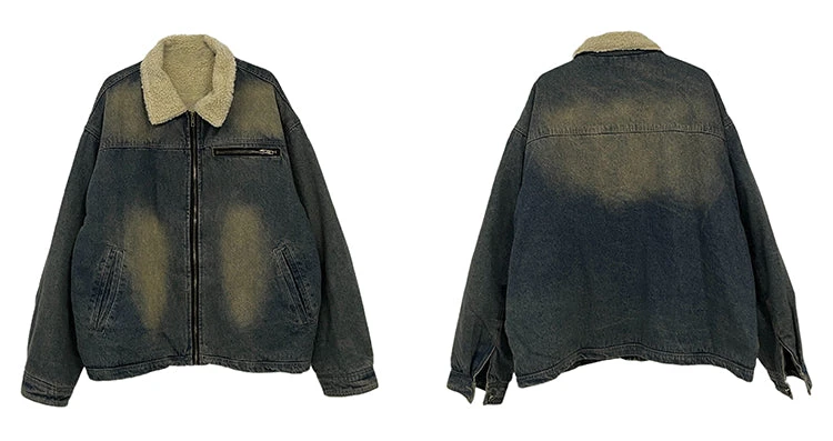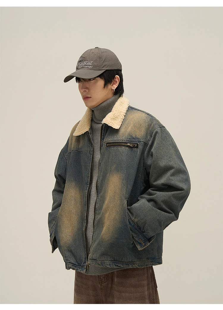 Denim jacket, fading throughout, sherpa fleece trim at spread collar, zip closure, zip and welt pockets, single-summary barrel cuffs.
