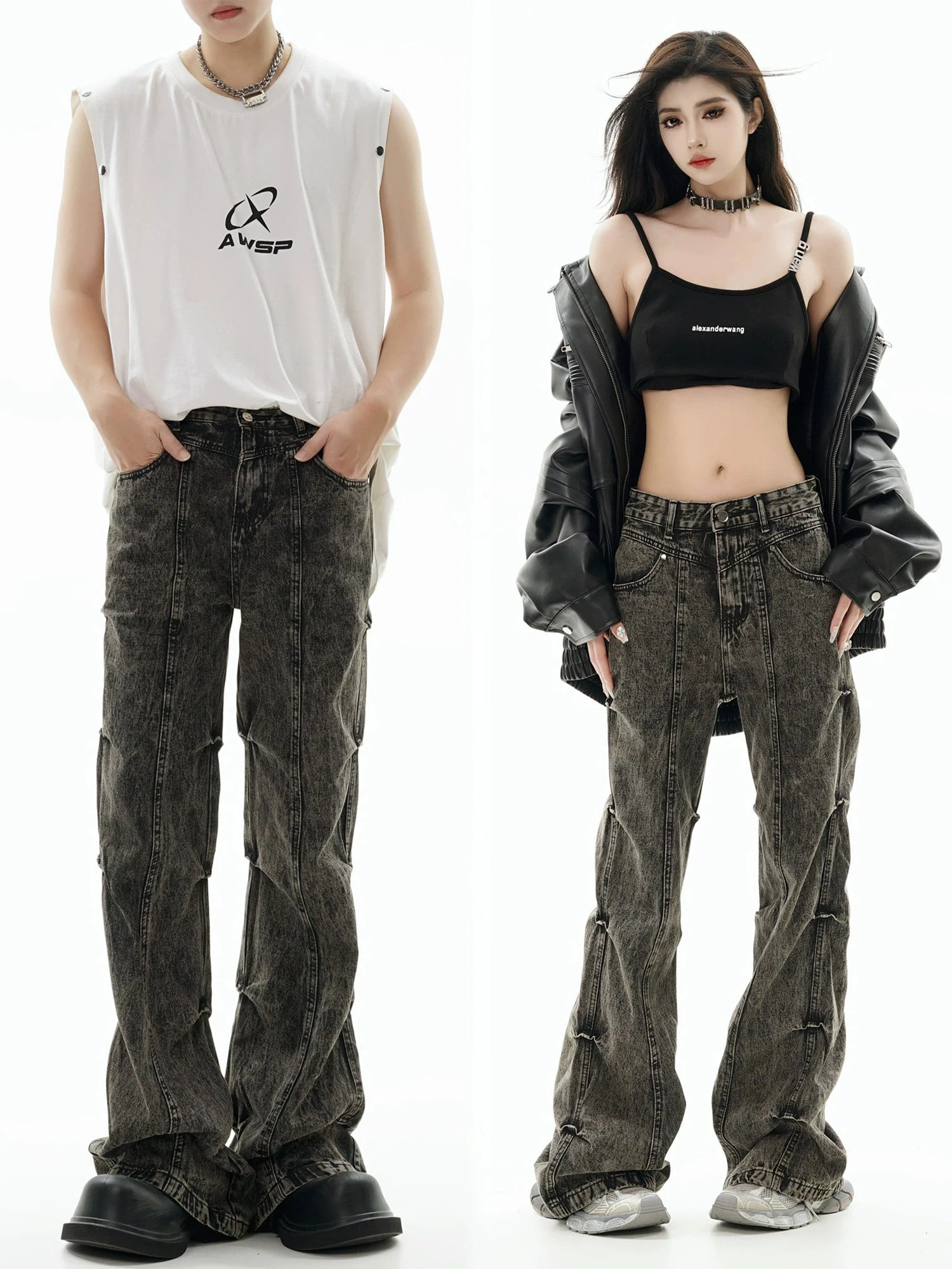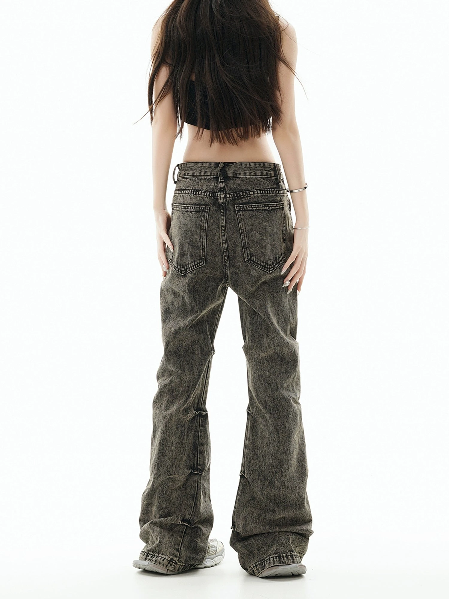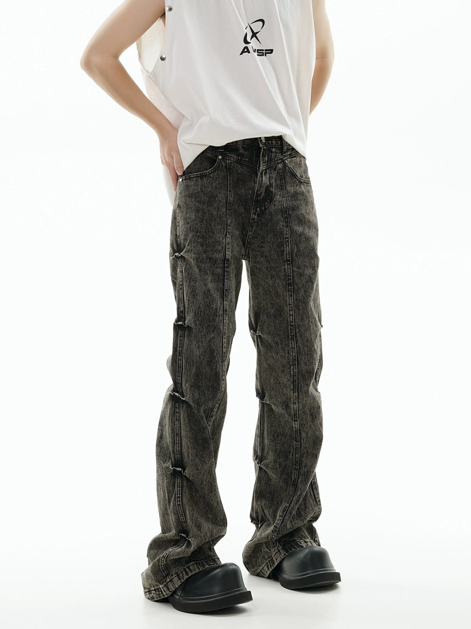 GCINIM baggy denim jeans, acid wash effect throughout, paneled construction, ruched detailing at outseams, belt loops, four-pocket styling, zip-fly.