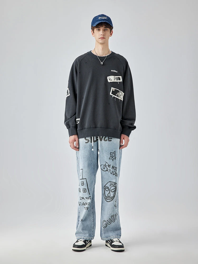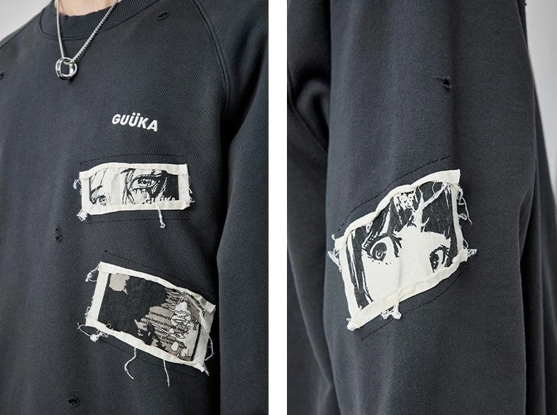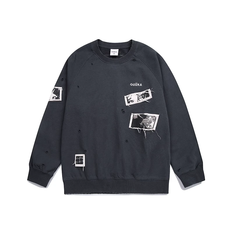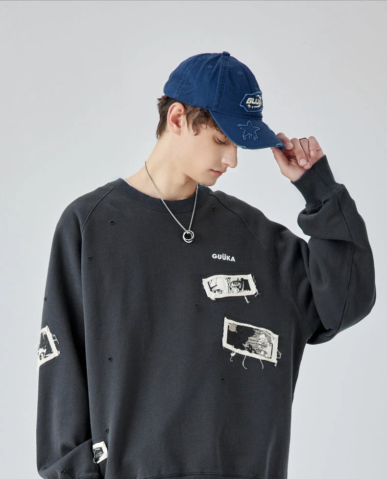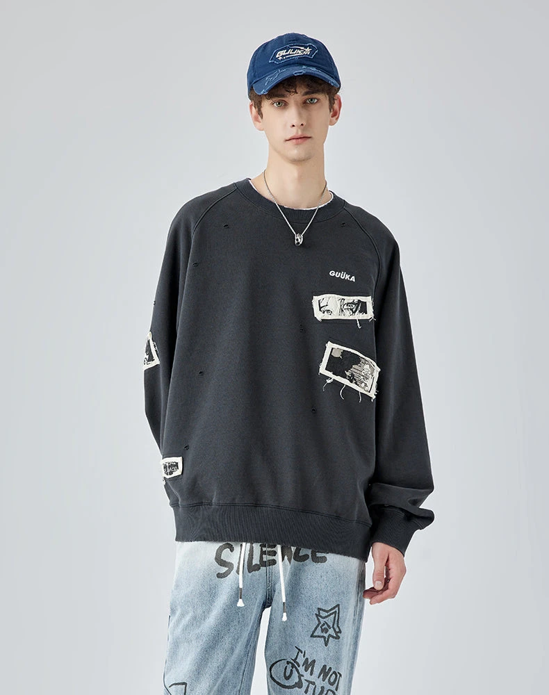 GUUKA cotton sweatshirt, paneled construction, frayed graphic patches throughout, rib knit crewneck/hem/cuffs, logo at chest.