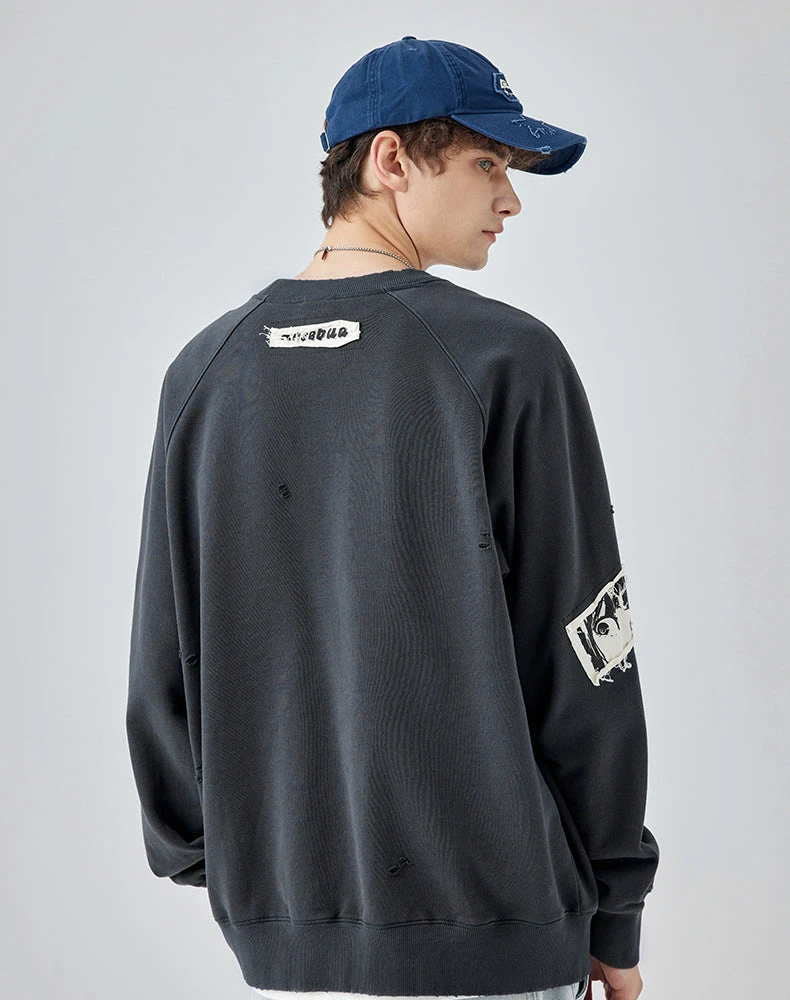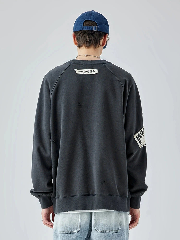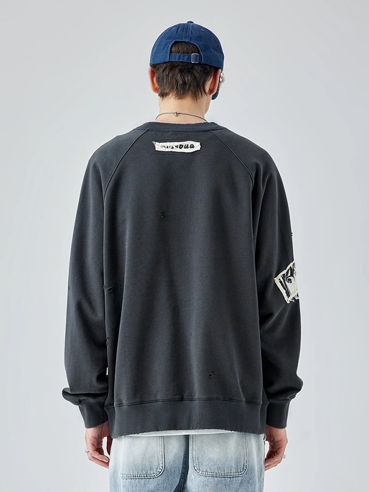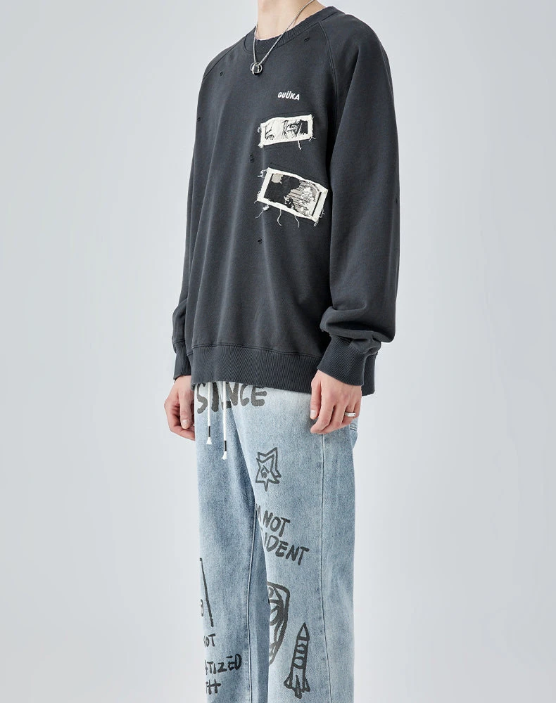GUUKA cotton sweatshirt, paneled construction, frayed graphic patches throughout, rib knit crewneck/hem/cuffs, logo at chest.