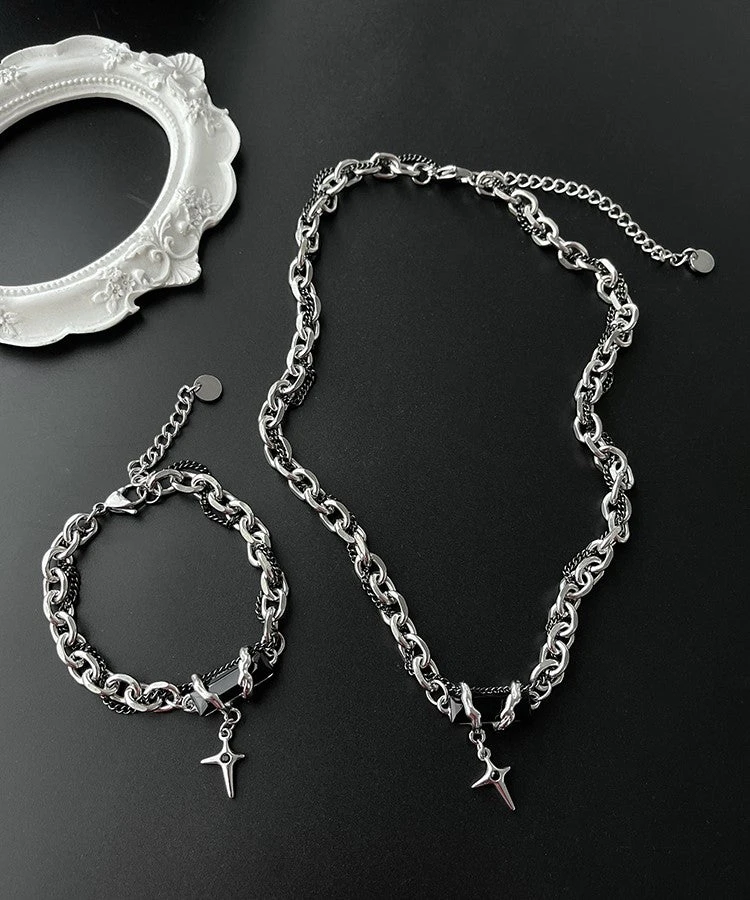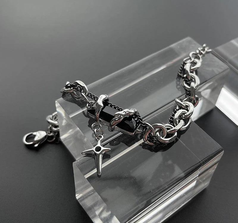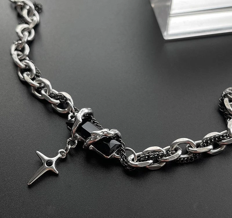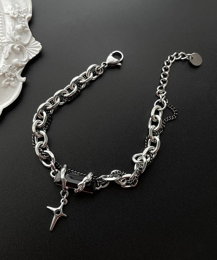 HEIMA tiered curb chain and fine curb chain bracelet in silver and black, obsidian crystal with thorn detailing and star spike charm at drop, adjustable lobster-clasp fastening.Â