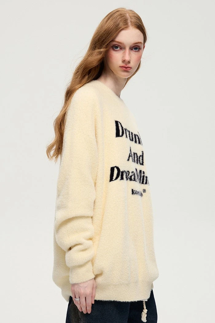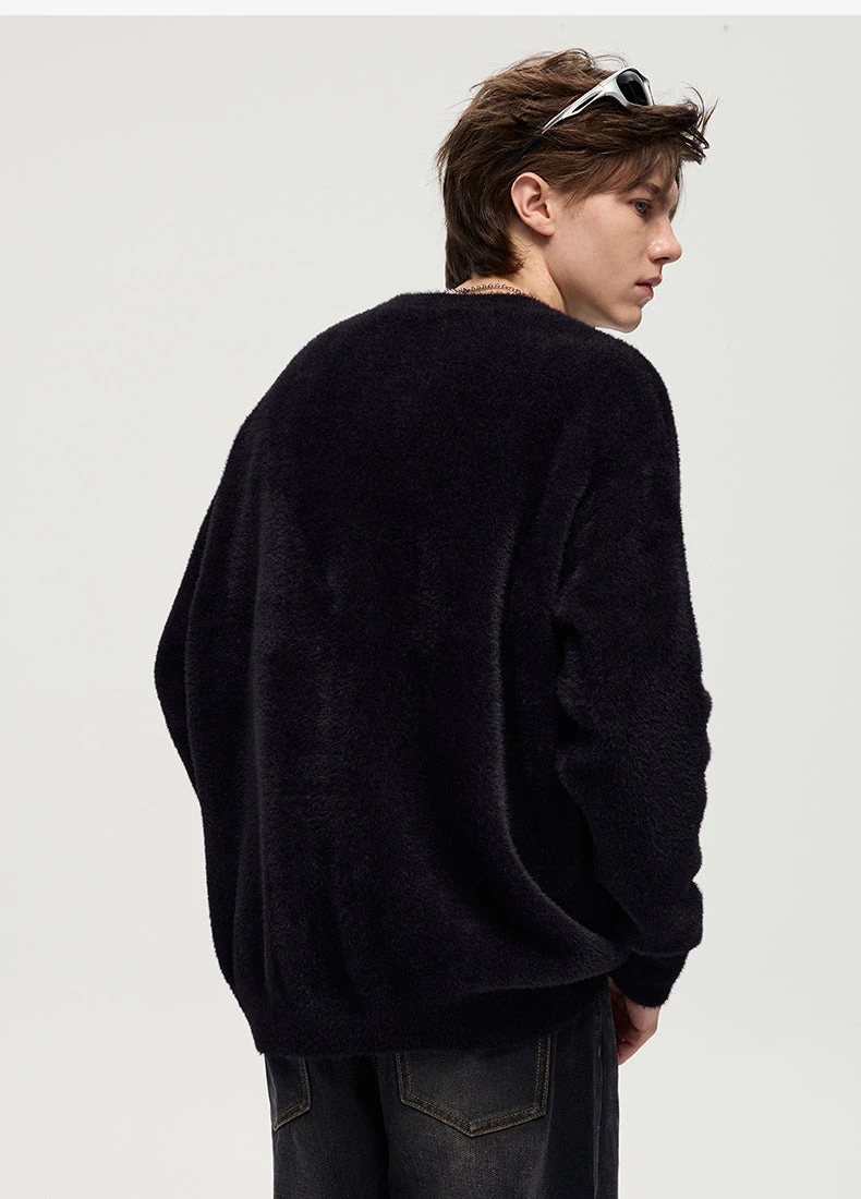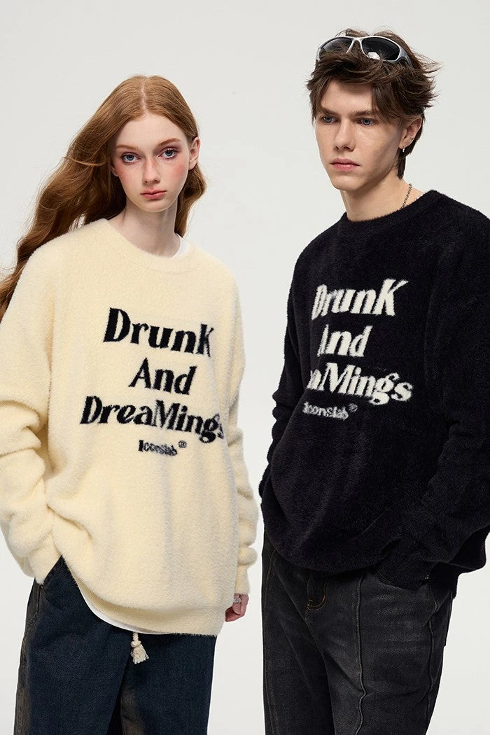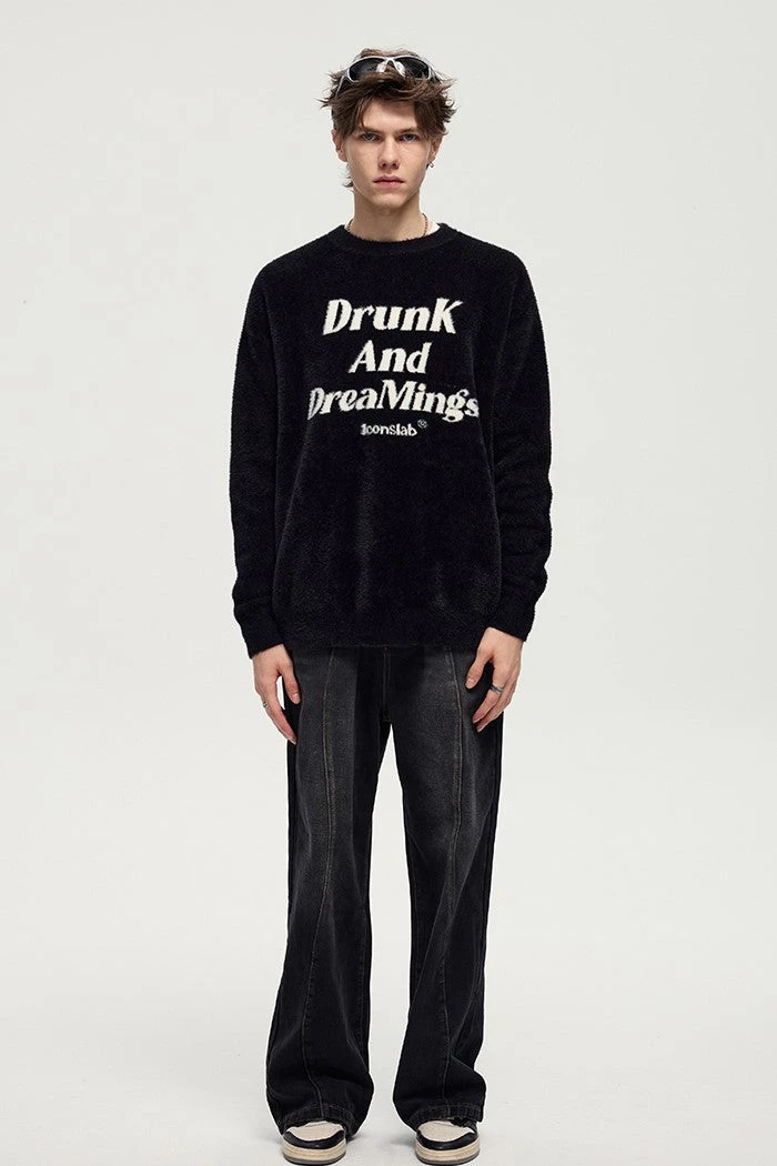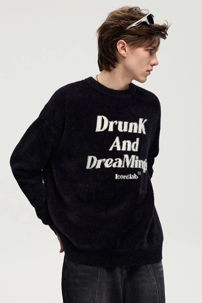 ICONSLAB nylon sweater, rib knit crewneck/hem/cuff, dropped shoulders, text design at chest.