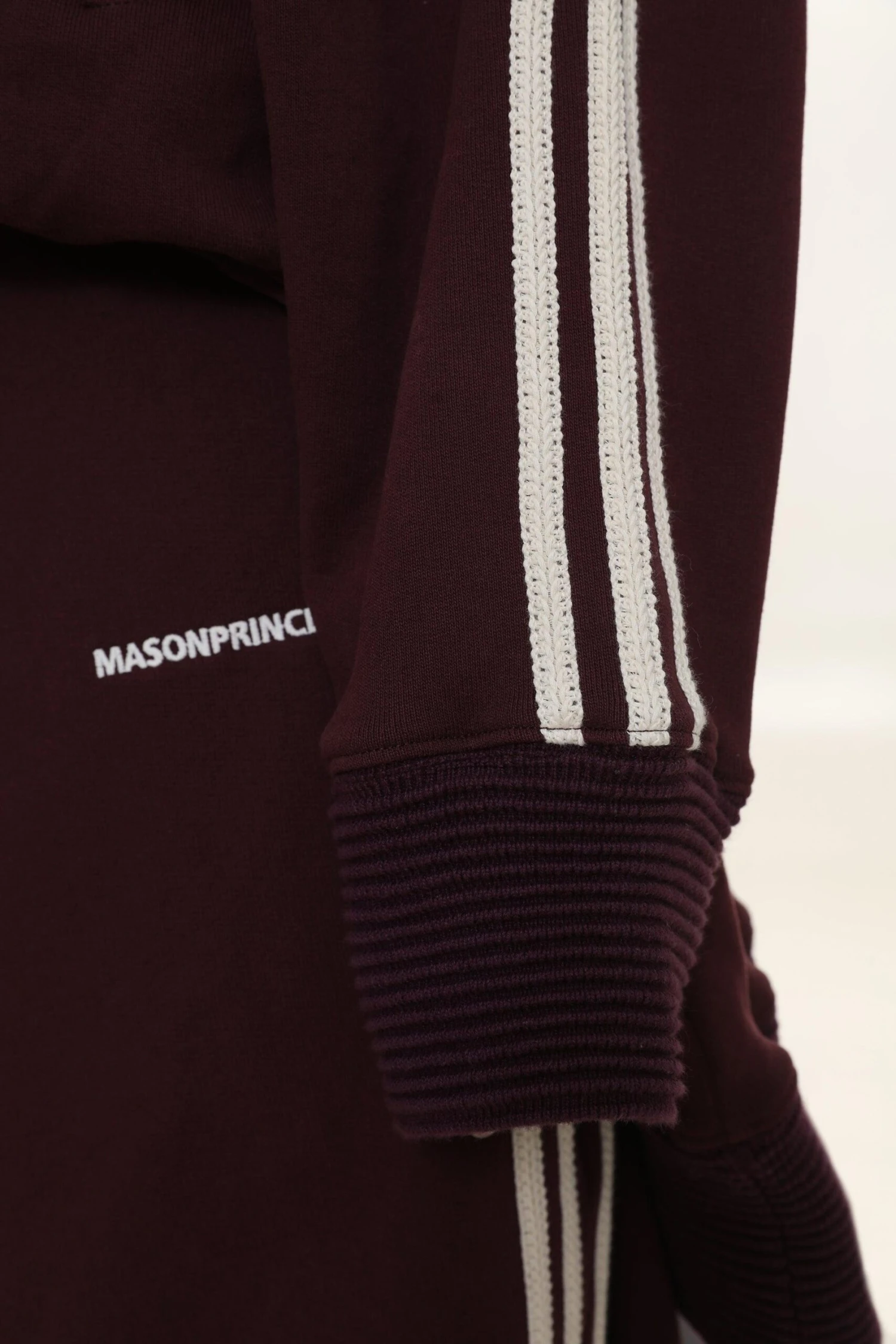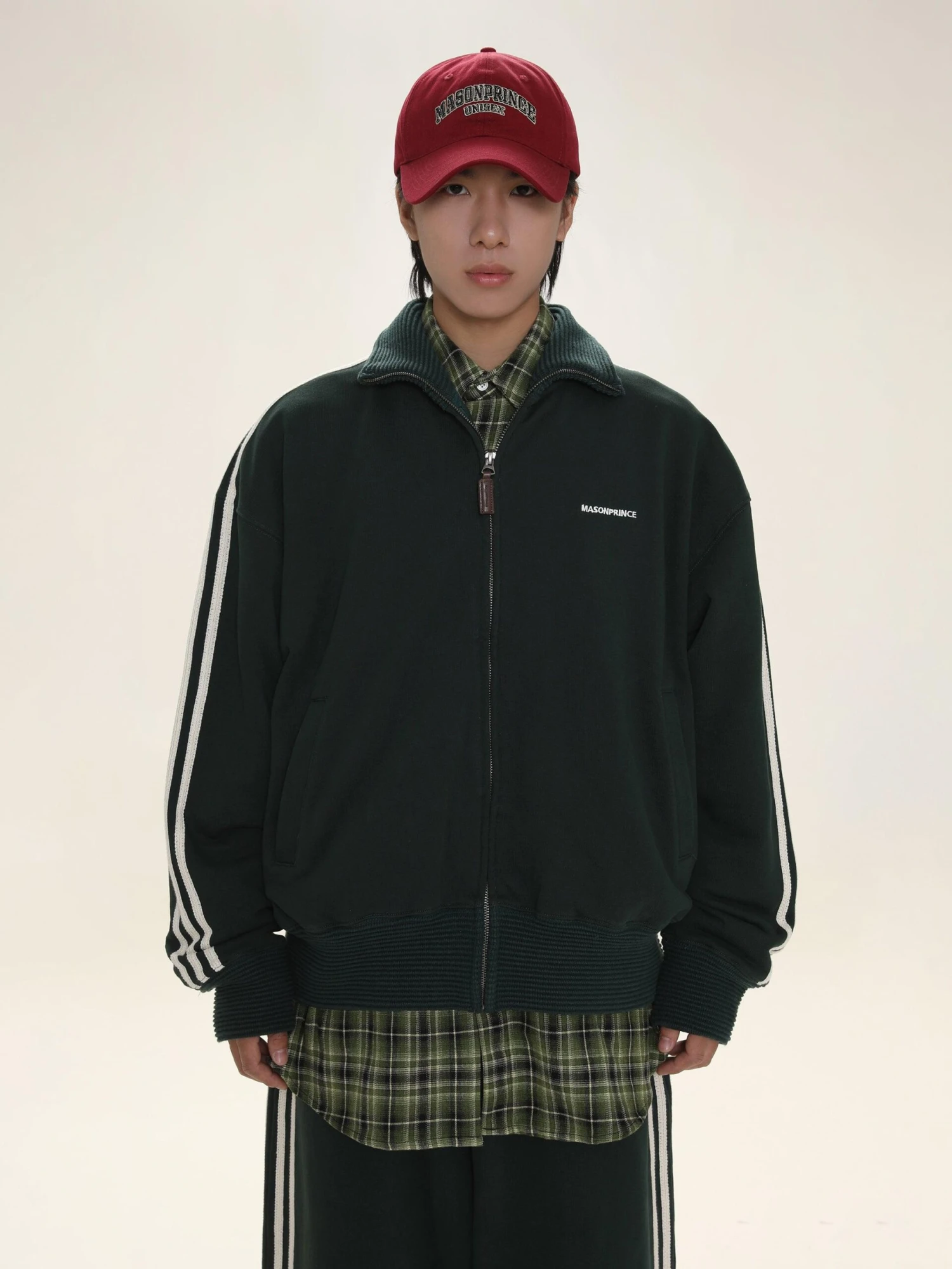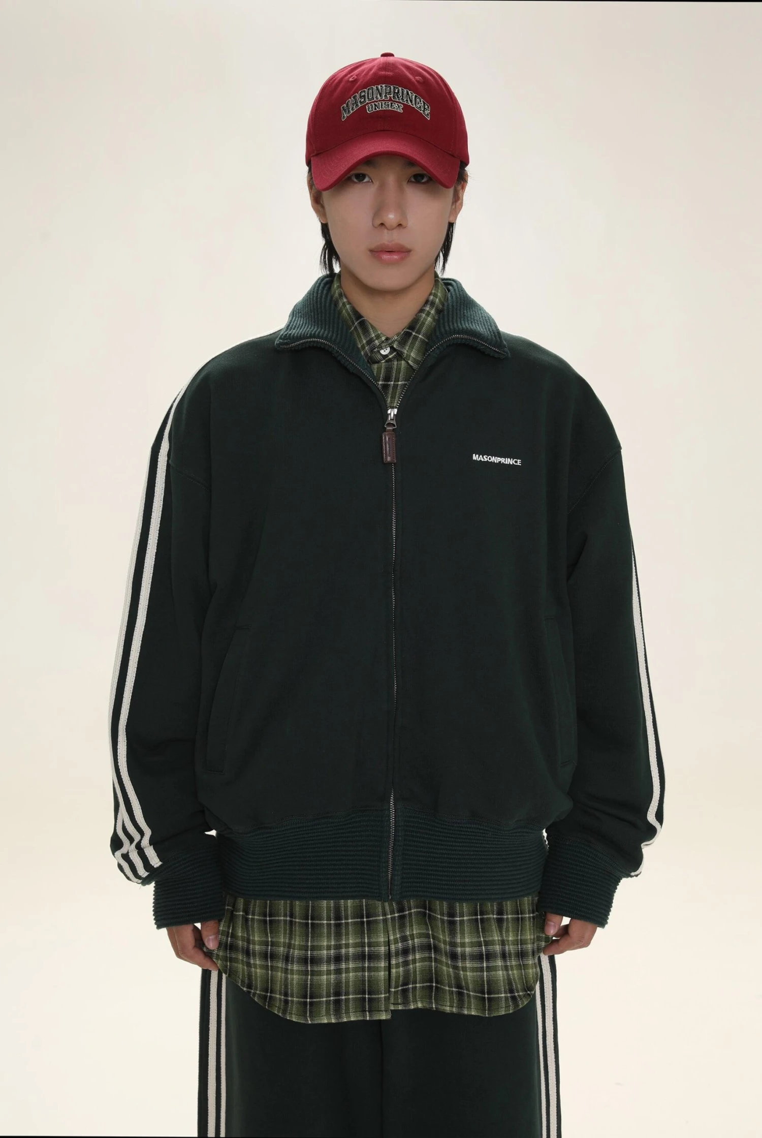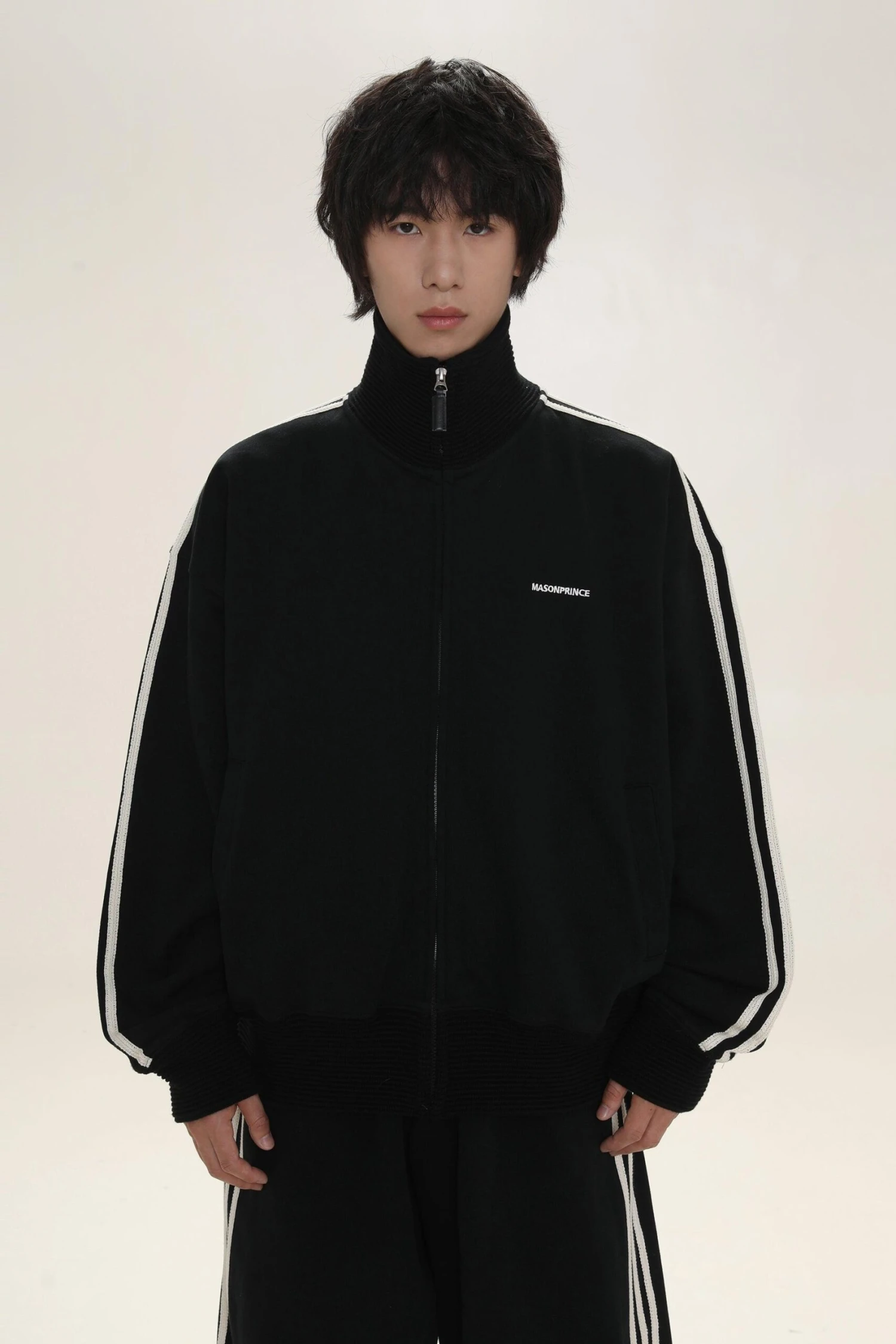 MASONPRINCE French terry cotton track jacket, stretchy, heavy, jacquard stripes at sleeves, rib knit stand collar, ribbed cuffs/hem, gunmetal-tone hardware, zip closure, side pockets.