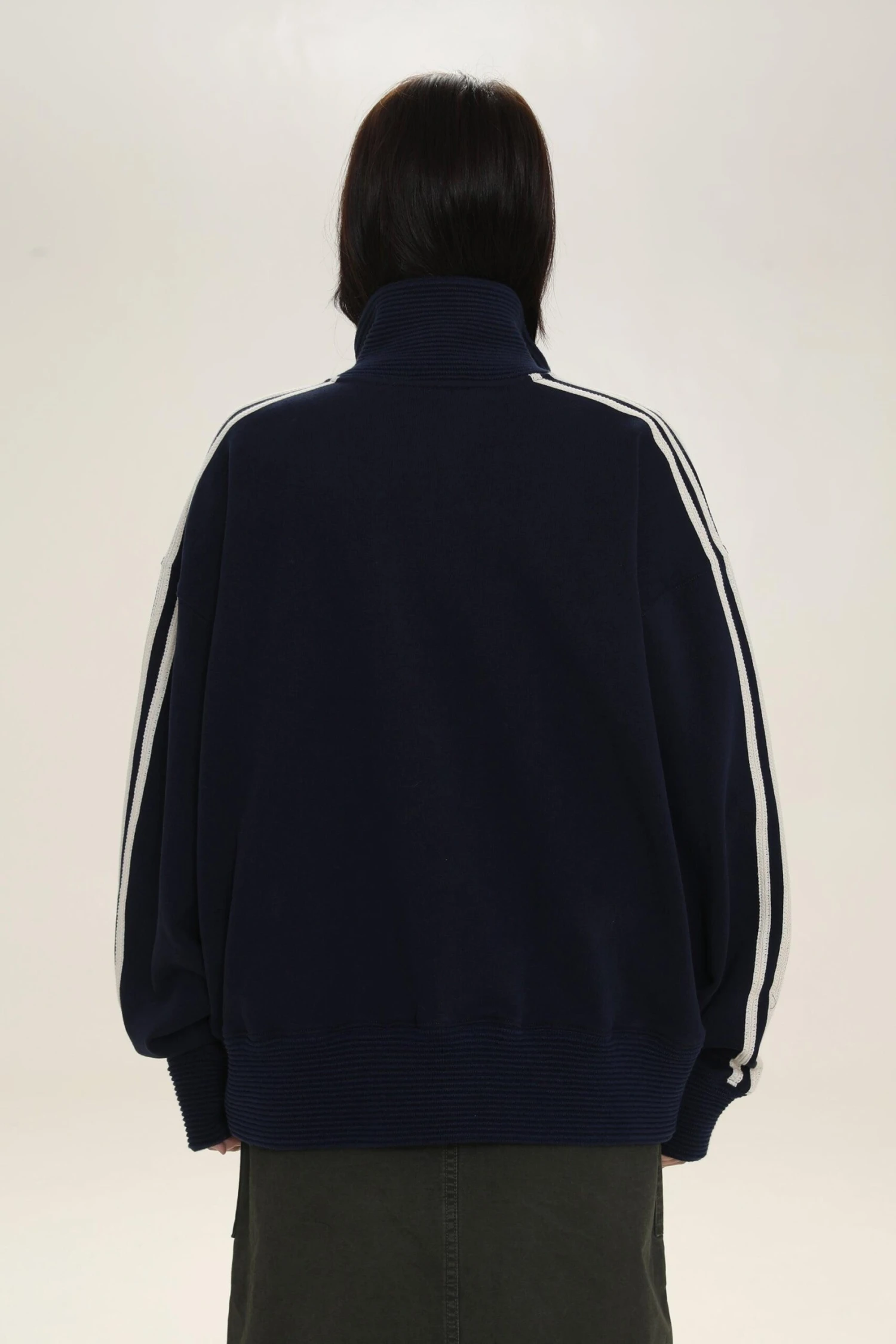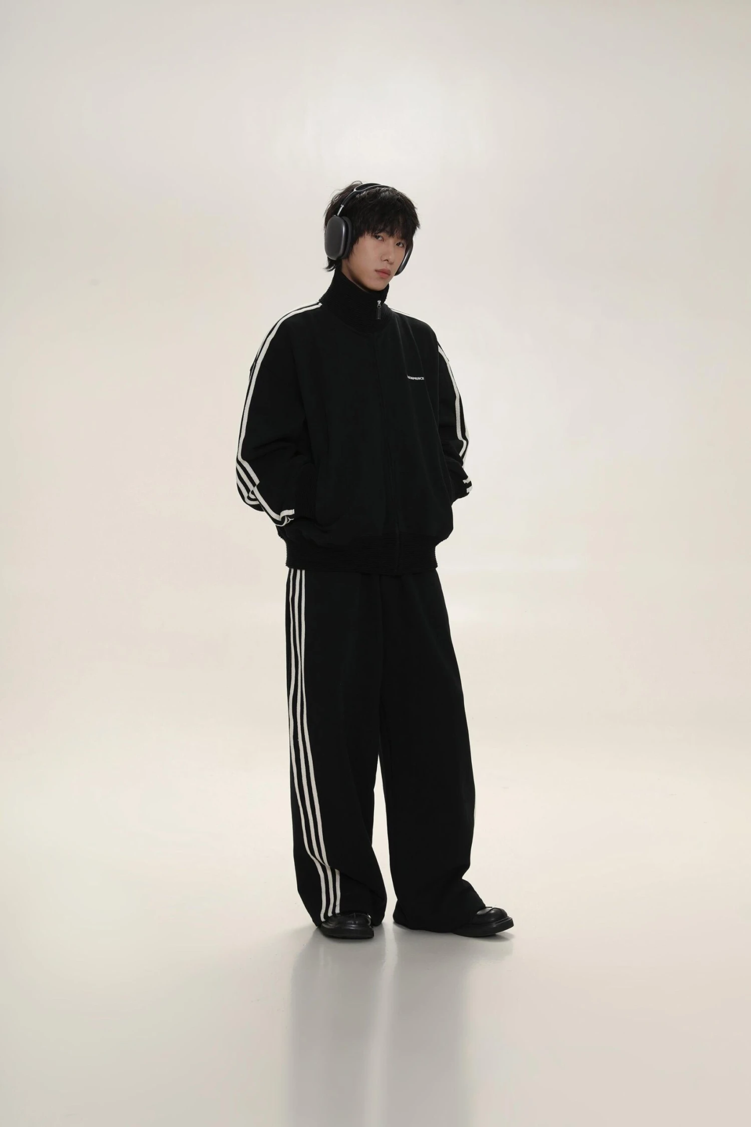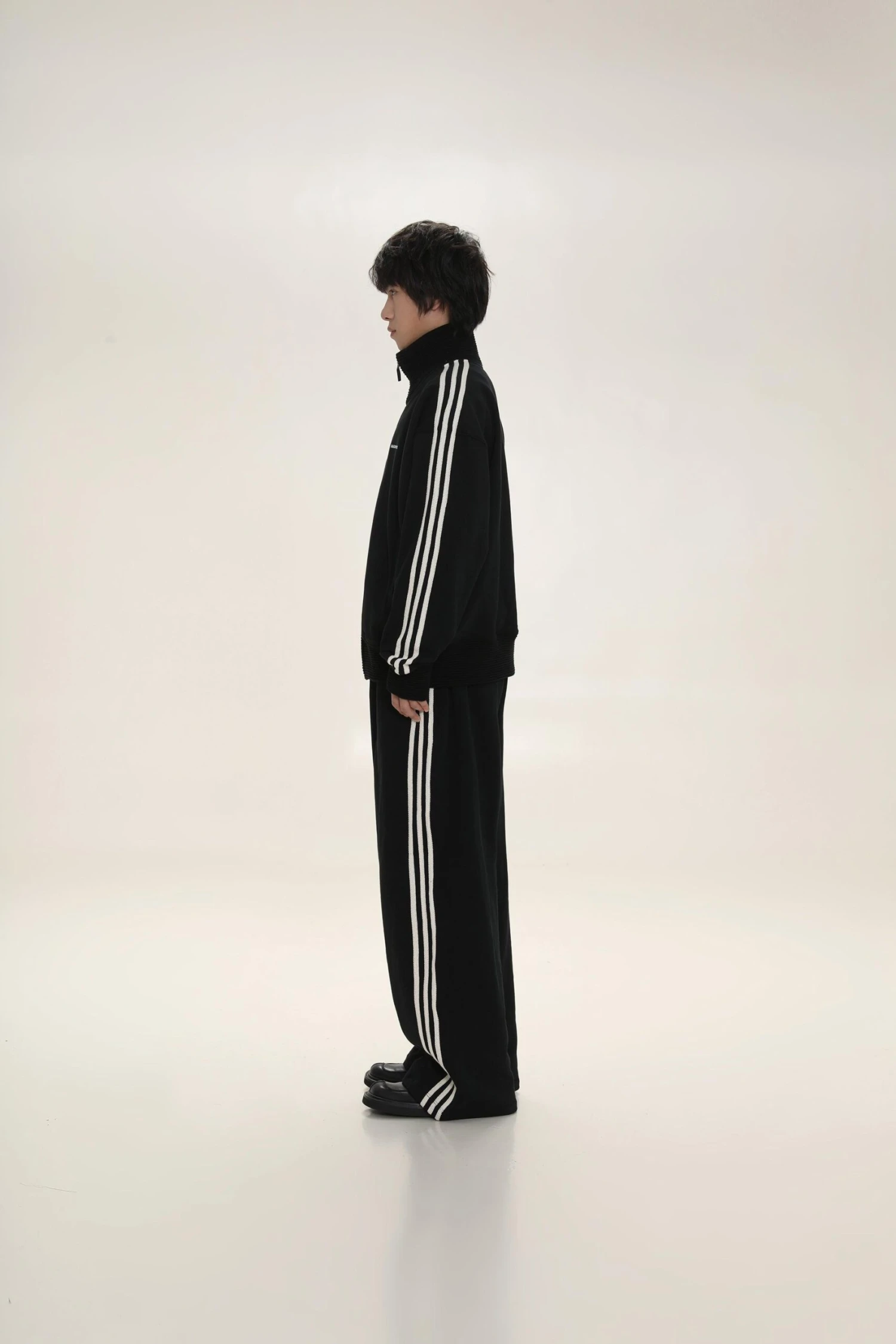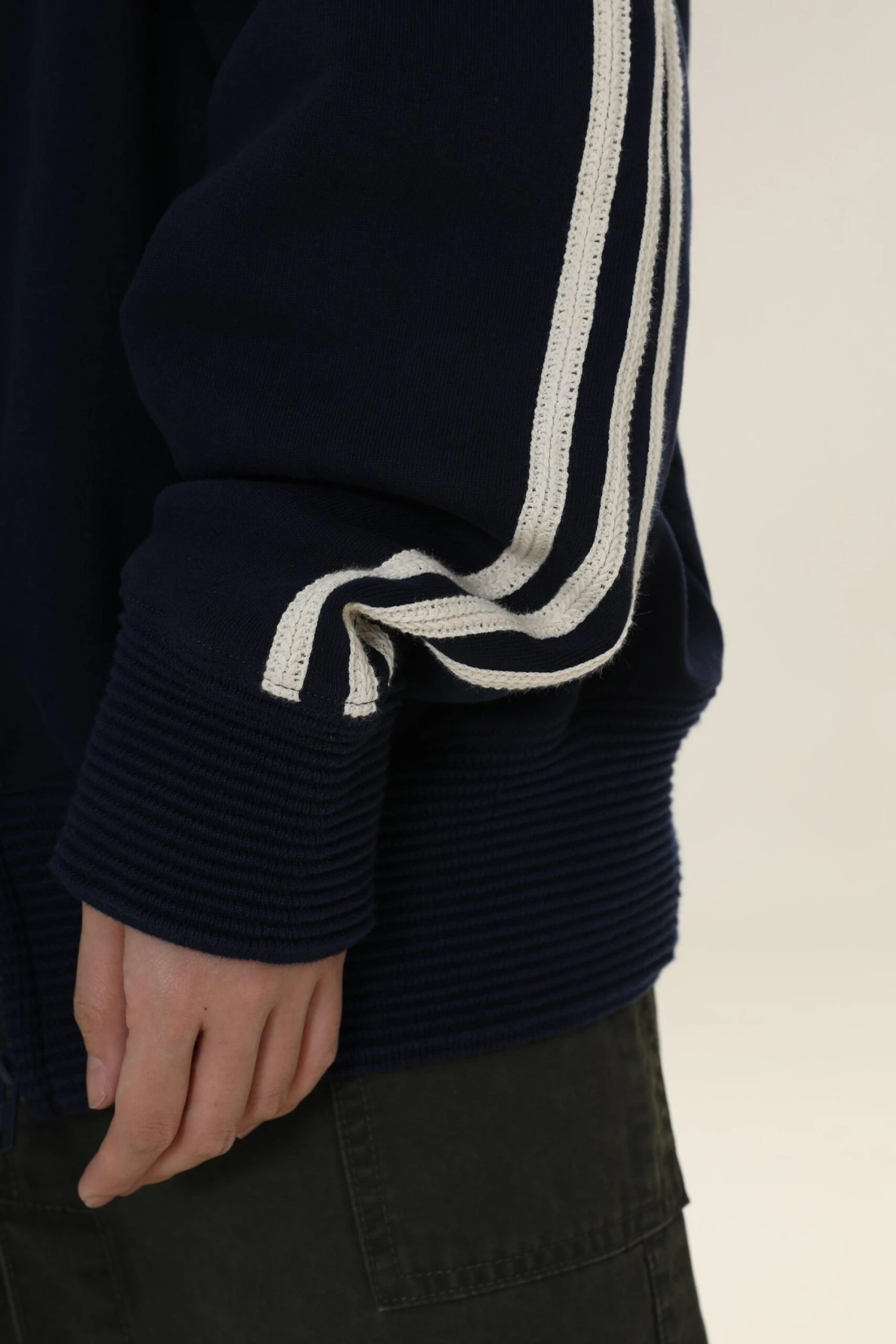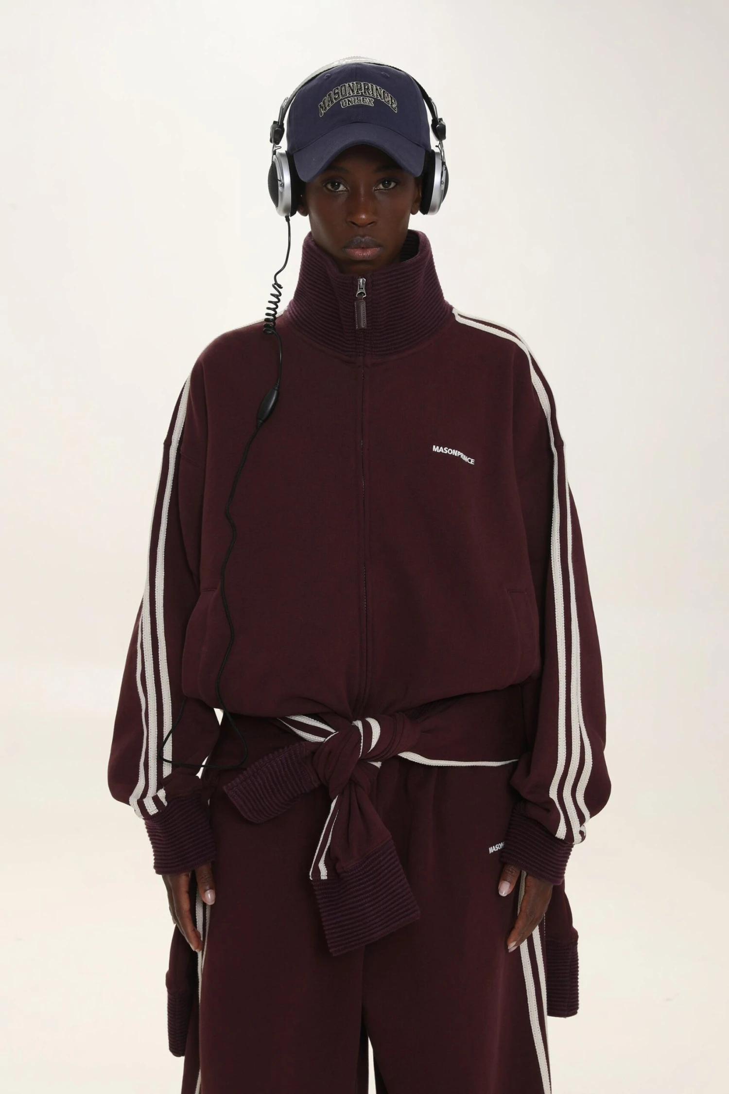 MASONPRINCE French terry cotton track jacket, stretchy, heavy, jacquard stripes at sleeves, rib knit stand collar, ribbed cuffs/hem, gunmetal-tone hardware, zip closure, side pockets.