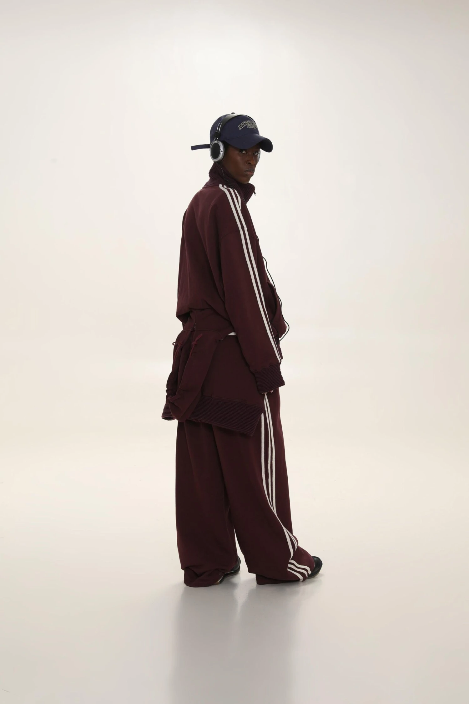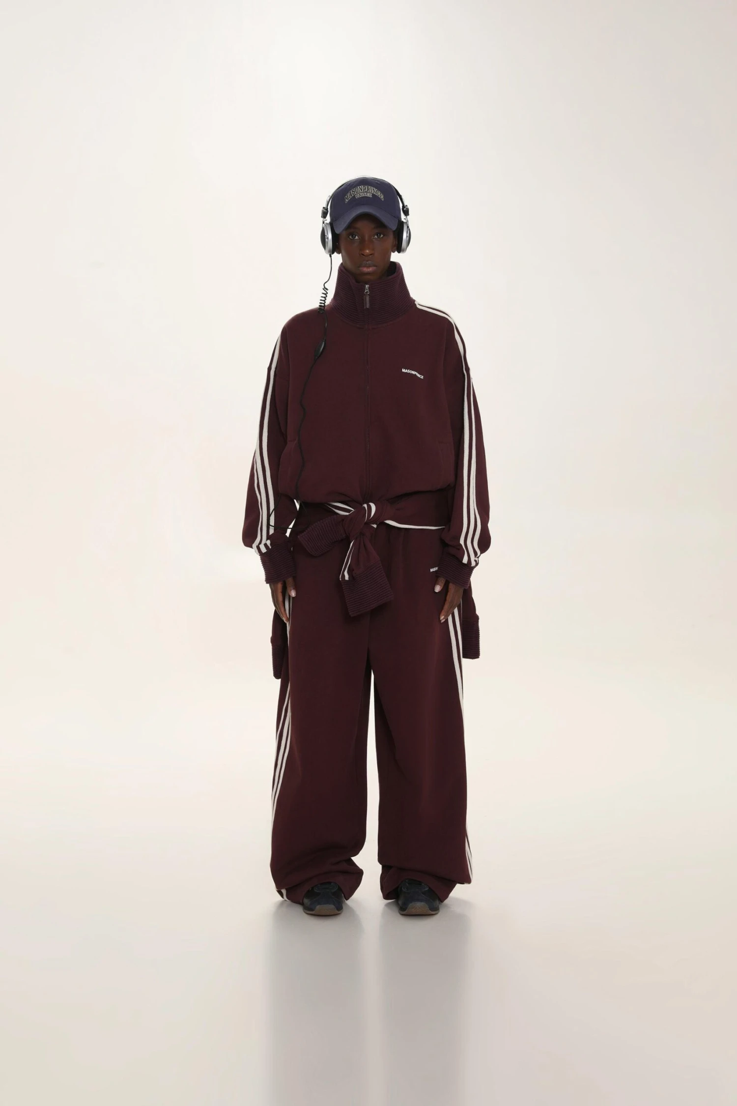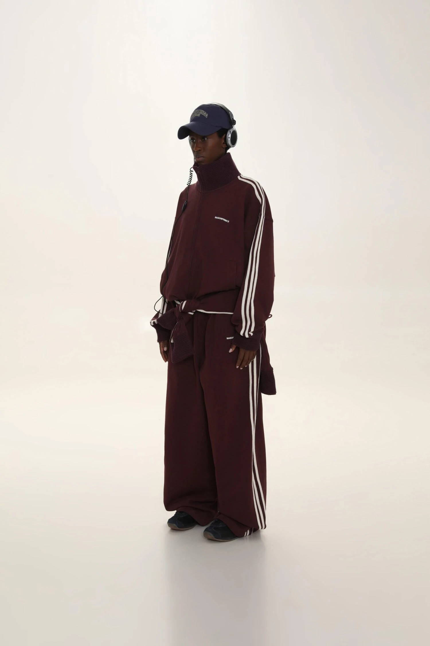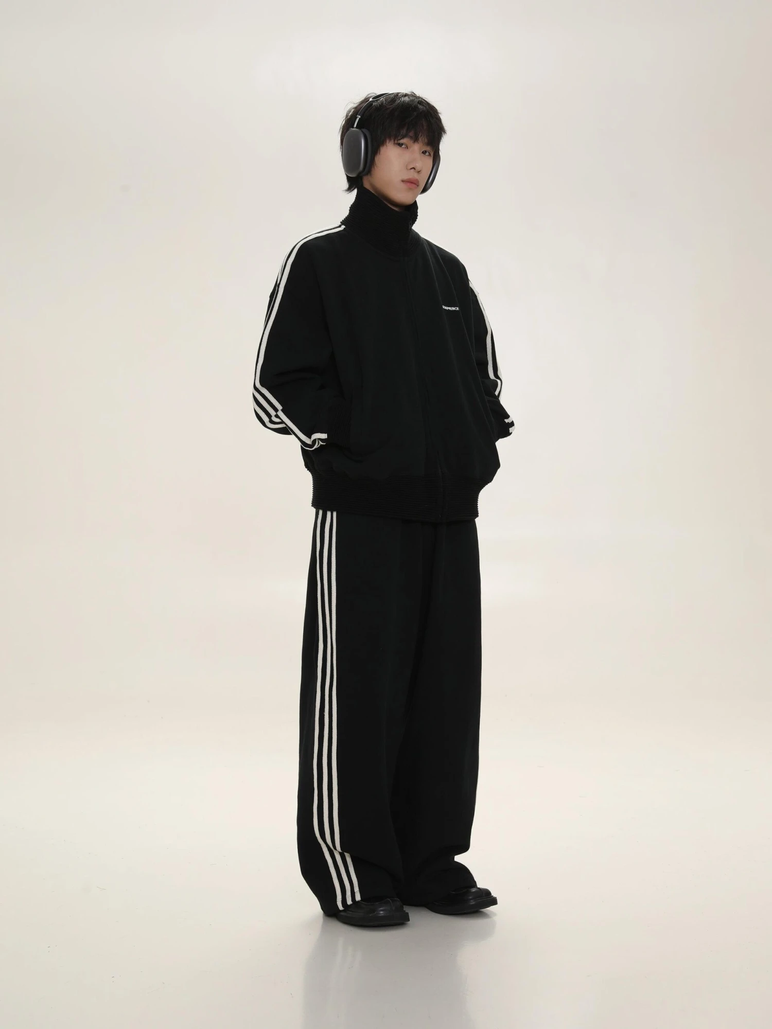 MASONPRINCE French terry cotton track jacket, stretchy, heavy, jacquard stripes at sleeves, rib knit stand collar, ribbed cuffs/hem, gunmetal-tone hardware, zip closure, side pockets.