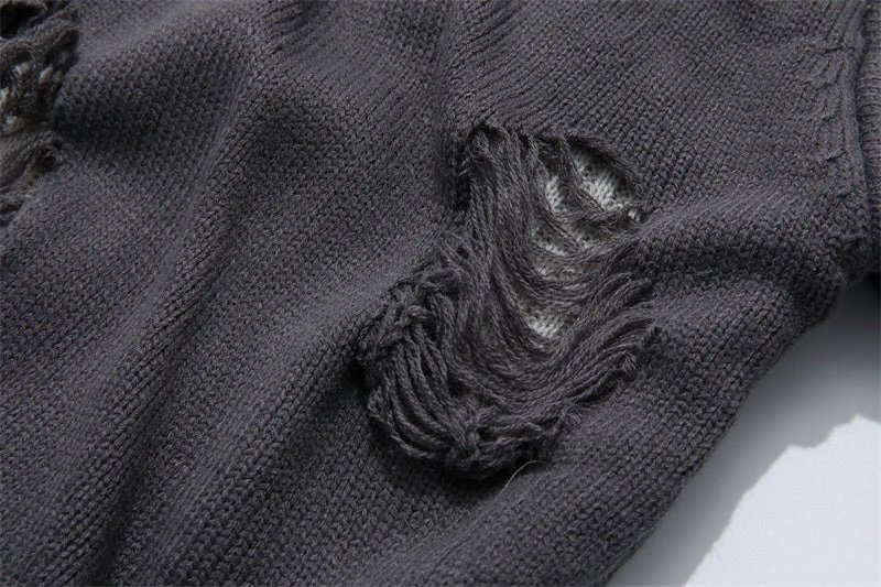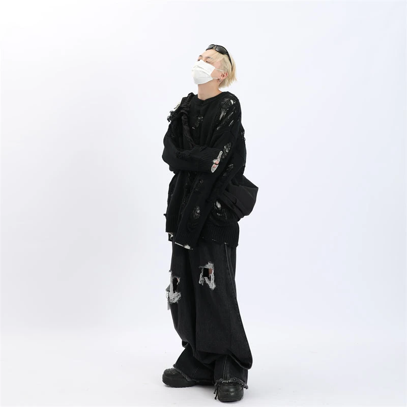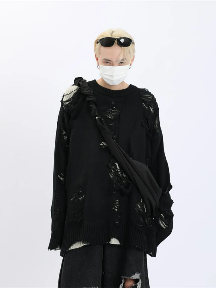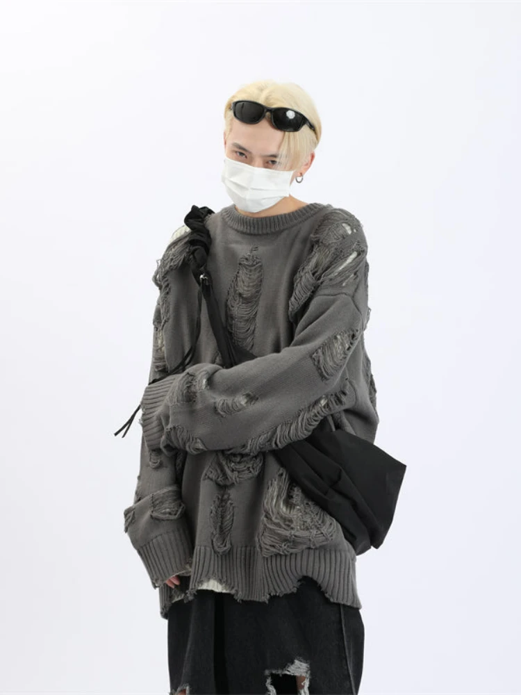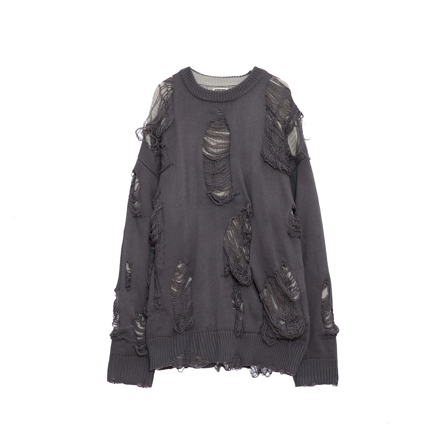 MaxDstr cotton sweater, rib knit crewneck/cuffs/hem, distressing/rips throughout