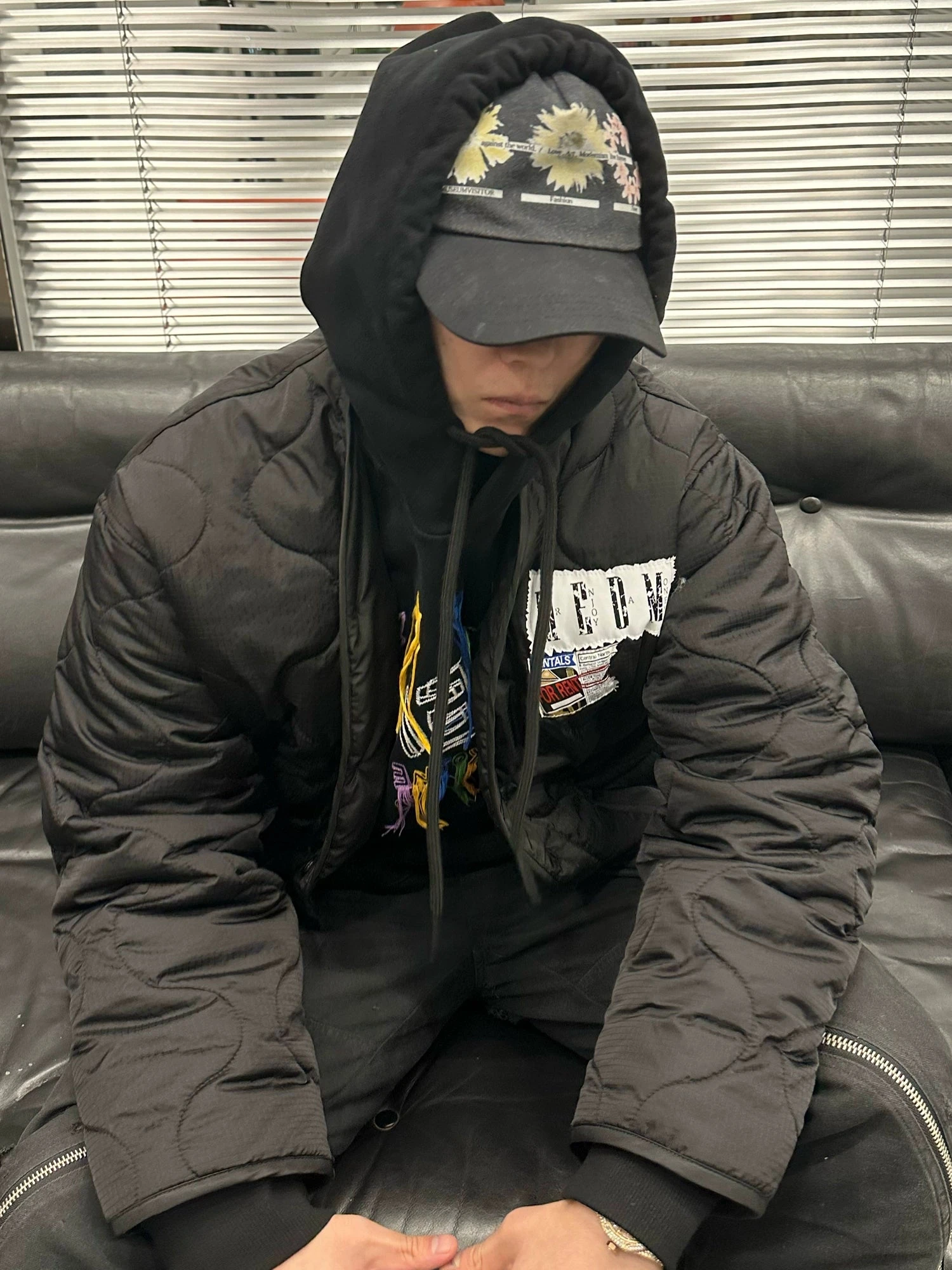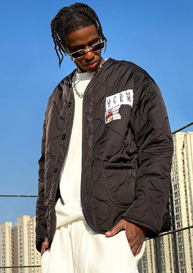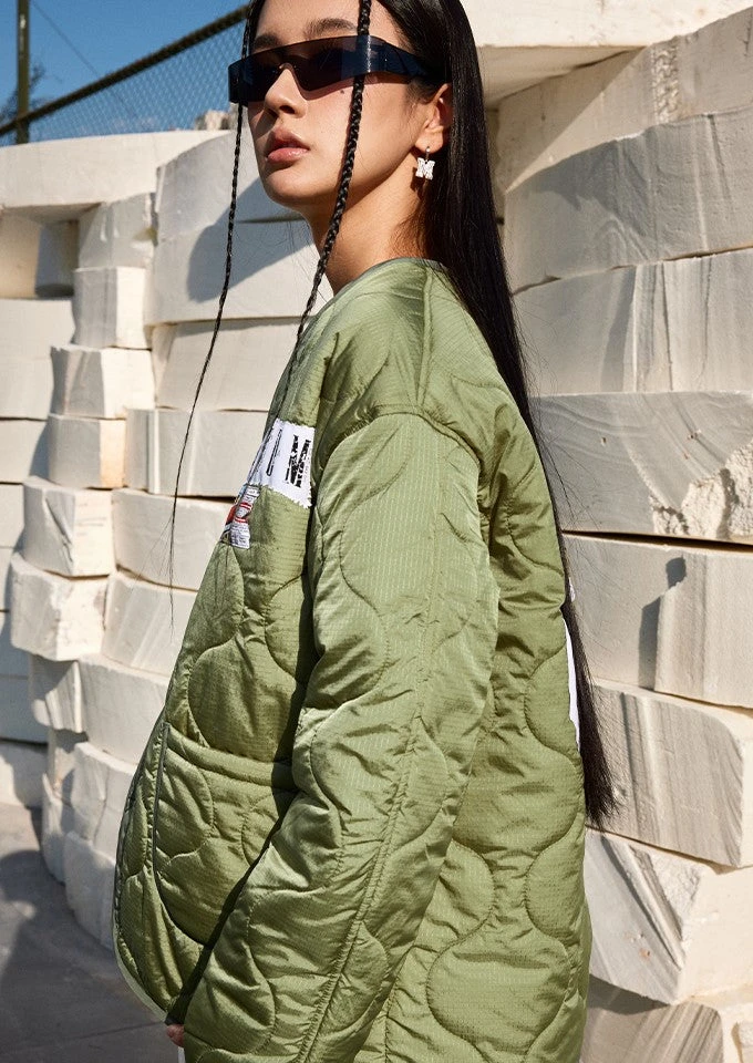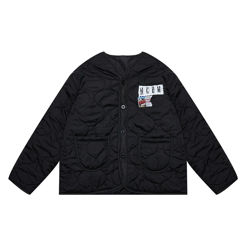 MEDM insulated nylon-blend jacket, V-neck, dropped shoulders, summary closure, patch pockets, graphic patches sewn at chest and back, fully lined.