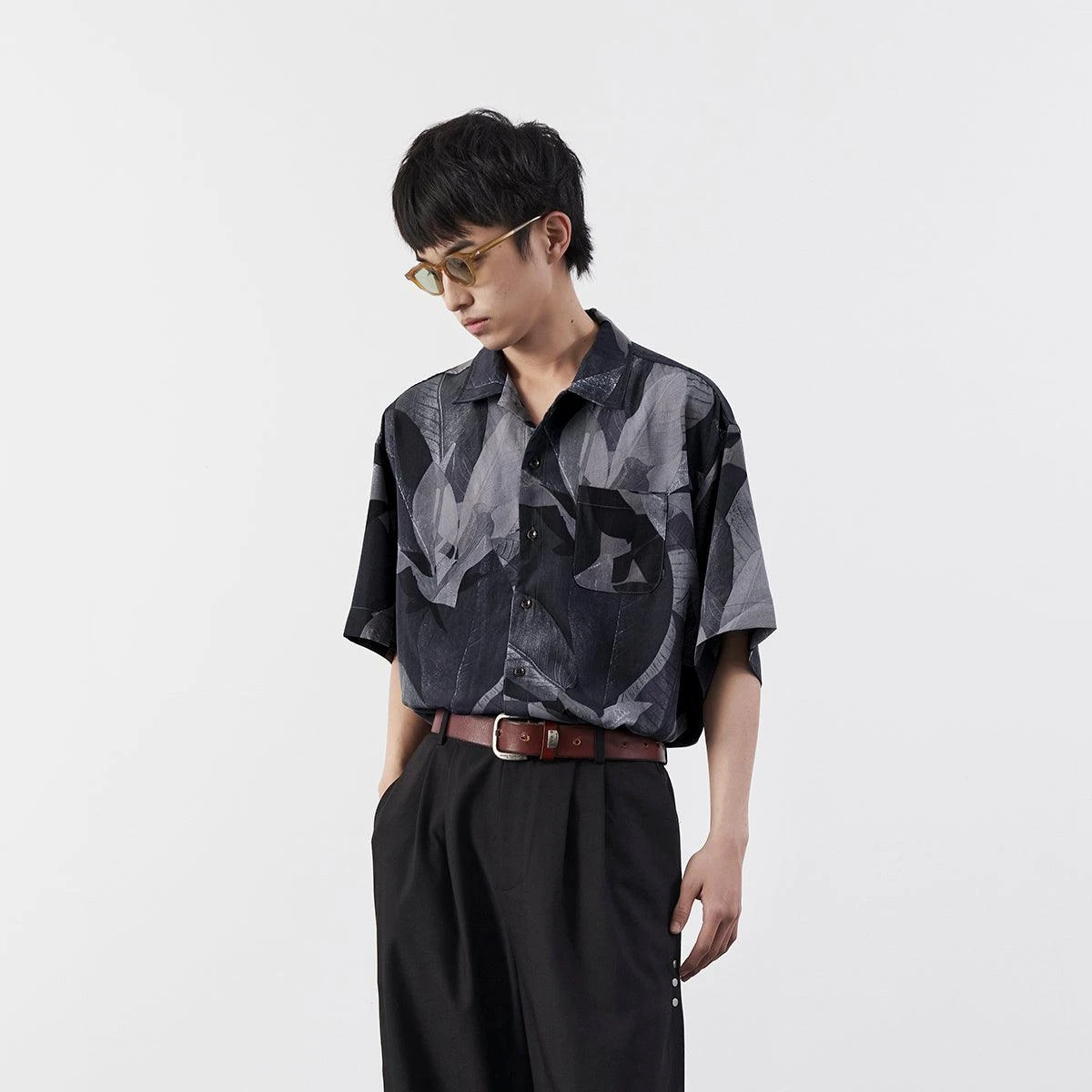 Mentmate plain-woven cotton shirt, spread collar, summary closure, patch pocket at chest, graphic printed throughout.