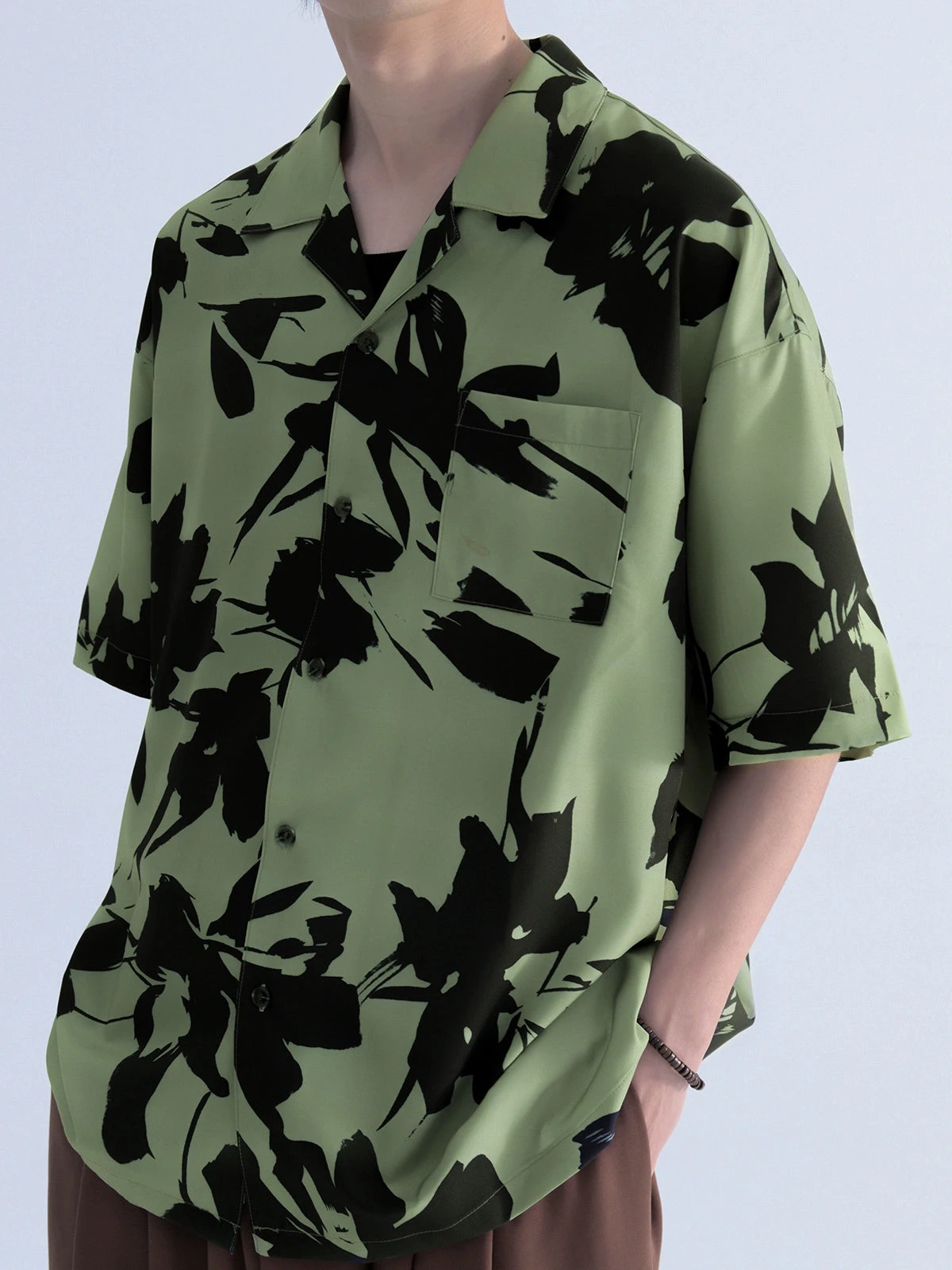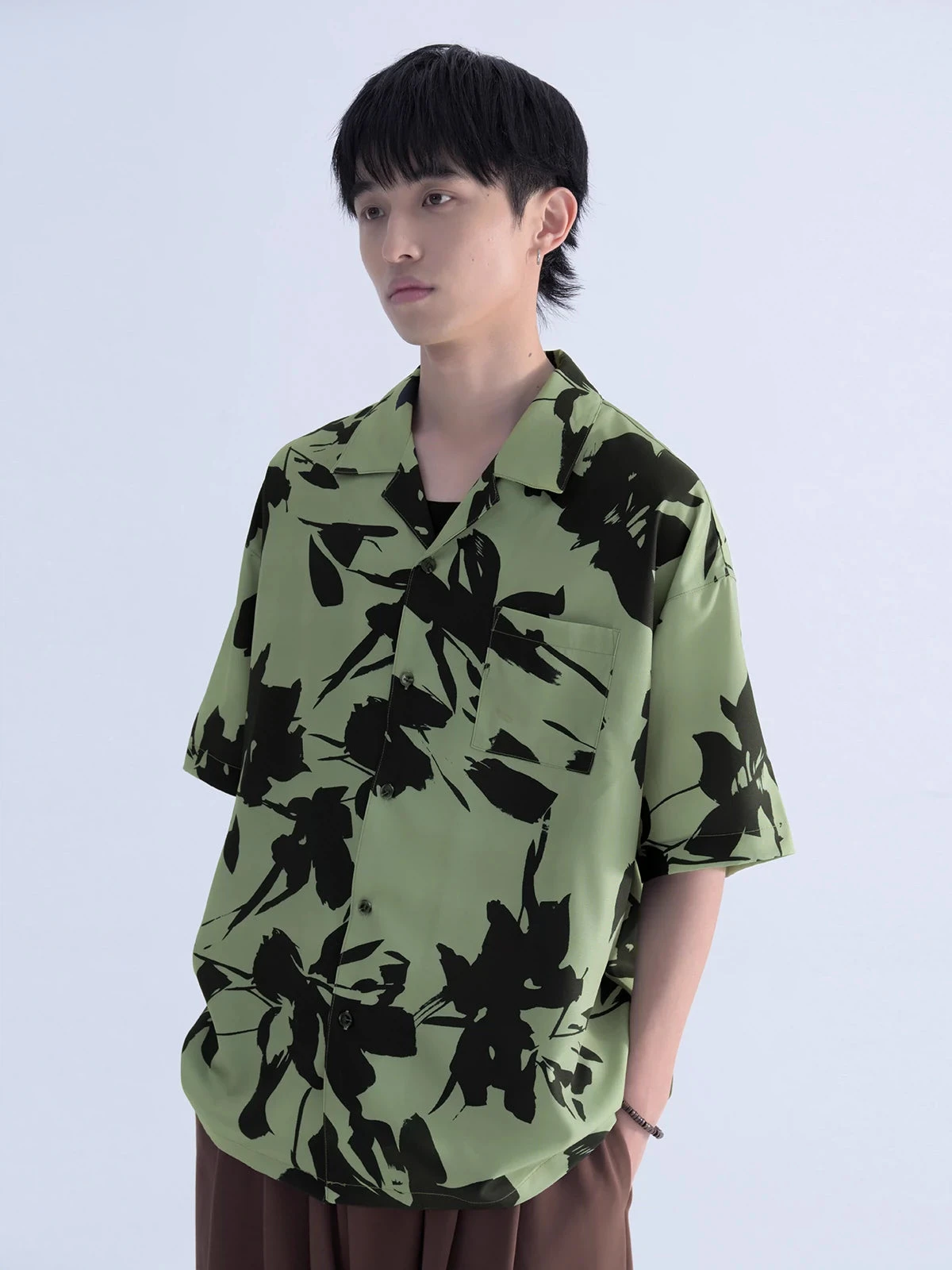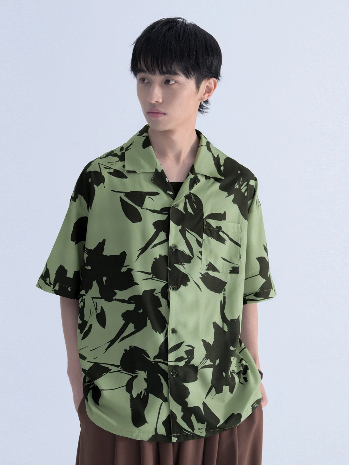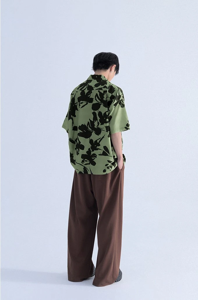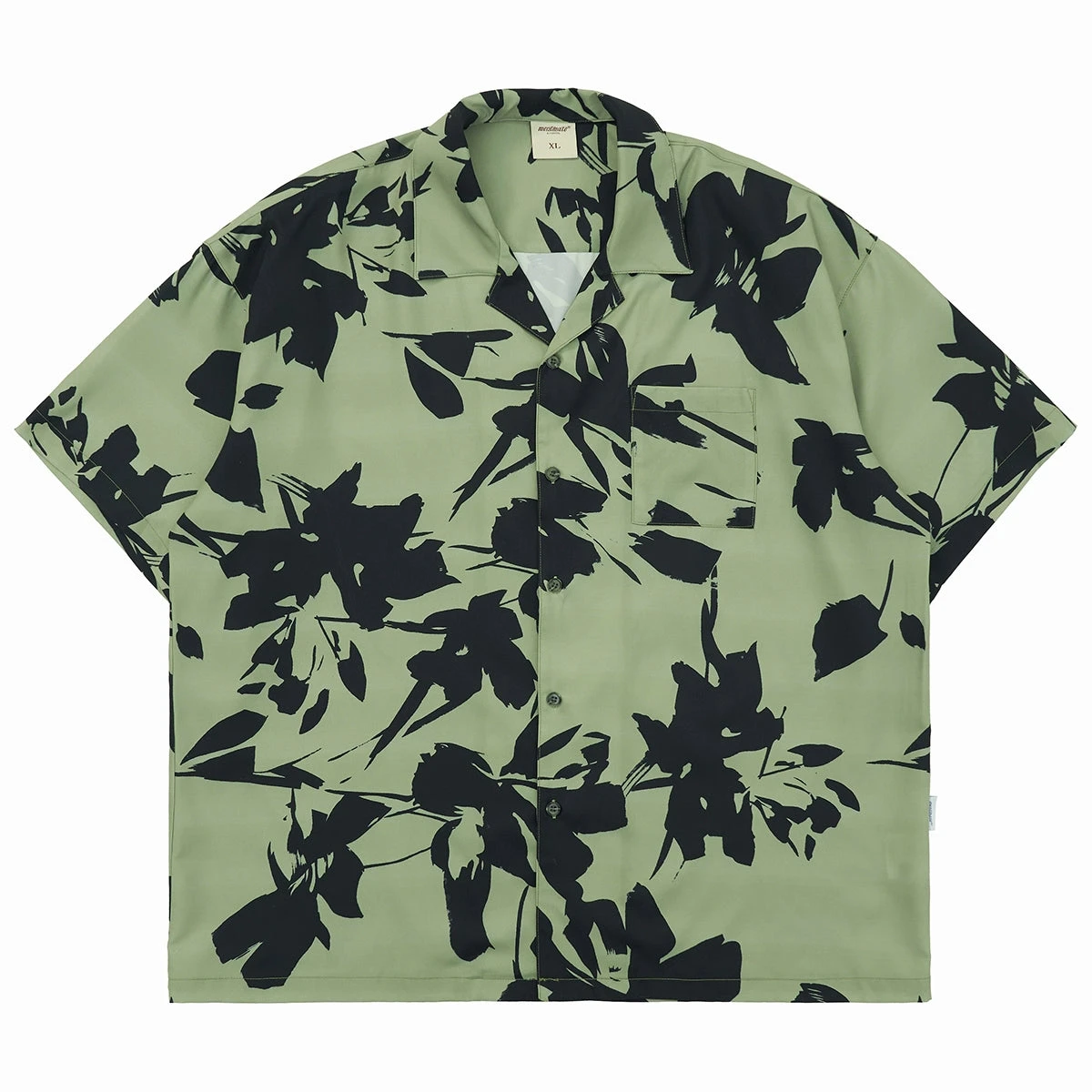 Mentmate cotton blend short sleeve shirt, floral pattern throughout, spread collar, rib knit hem and cuffs, dropped shoulders, summary closure, patch pocket at chest.