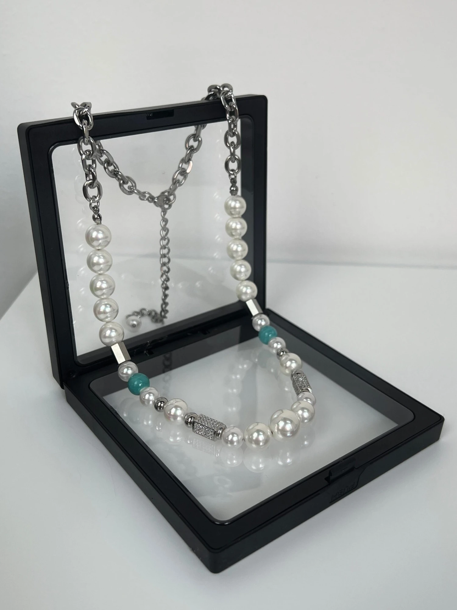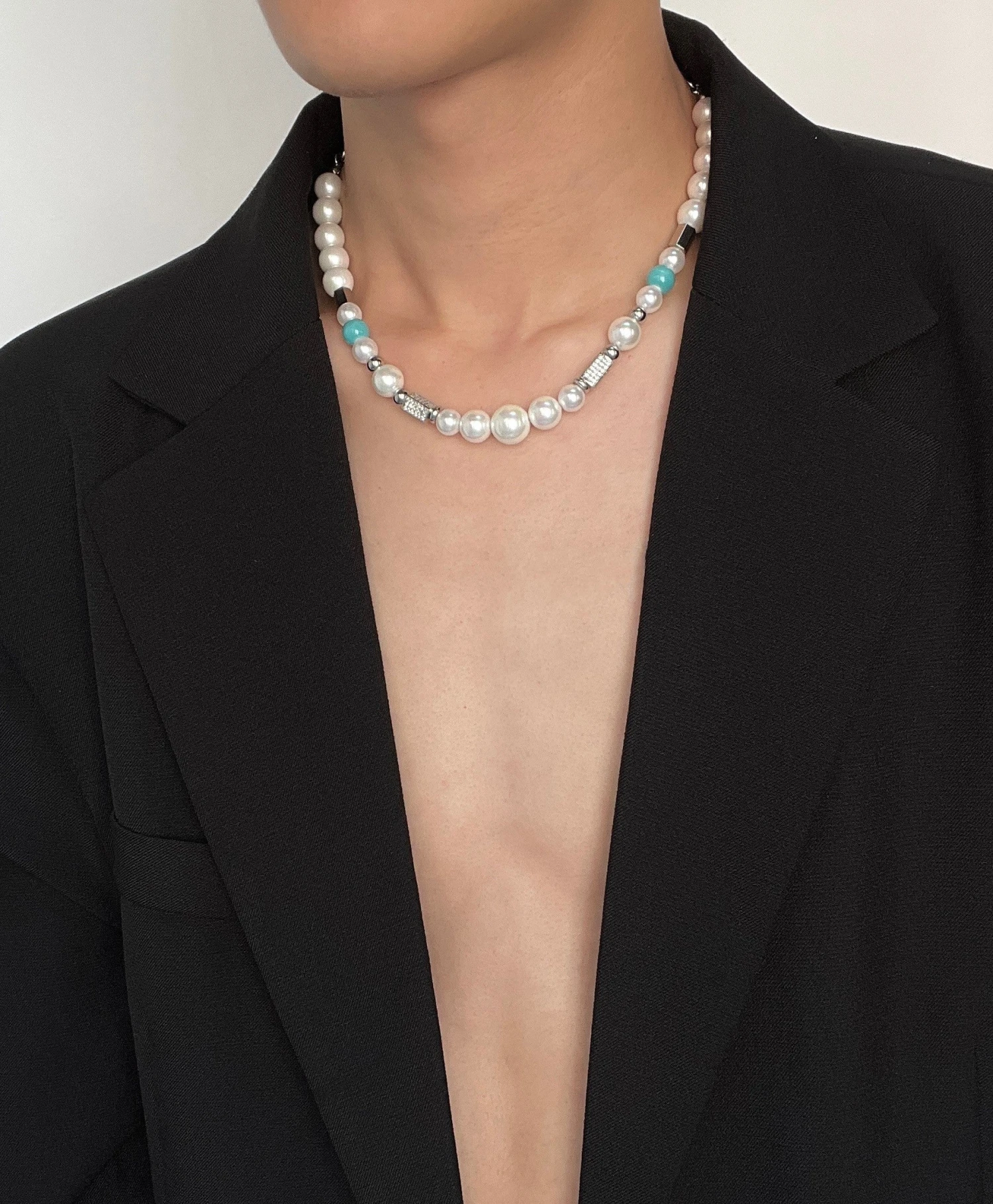 MINBIN faux-pearl necklace in white and teal, bead detailing throughout, adjustable lobster-clasp fastening.