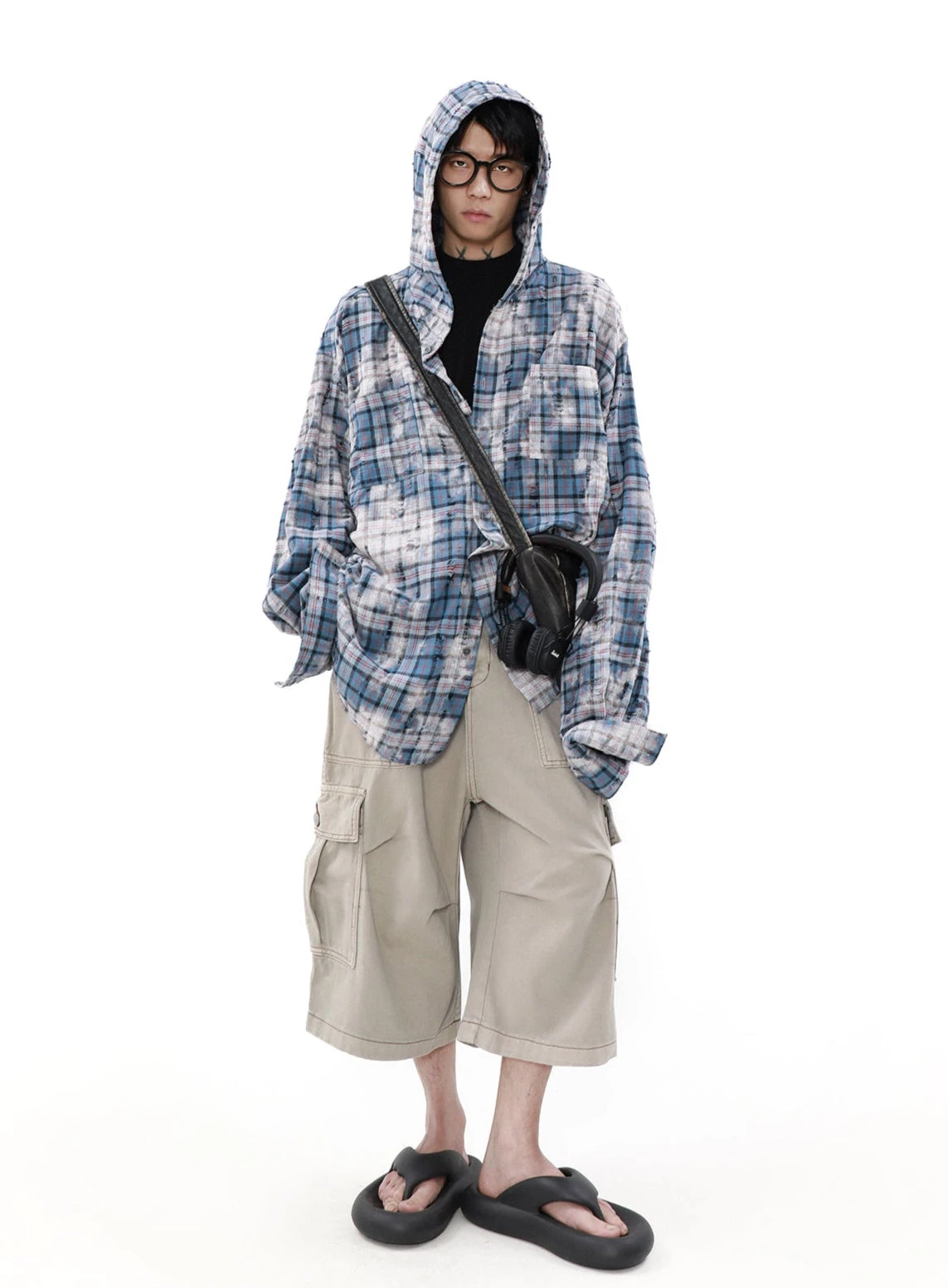 ​MRNEARLY Distressed Horizon Hooded Flannel Jacket, featuring a vintage-inspired plaid pattern with a distressed finish, soft brushed flannel fabric, attached drawstring hood, summary-front closure, chest flap pockets, and adjustable summaryed cuffs.​