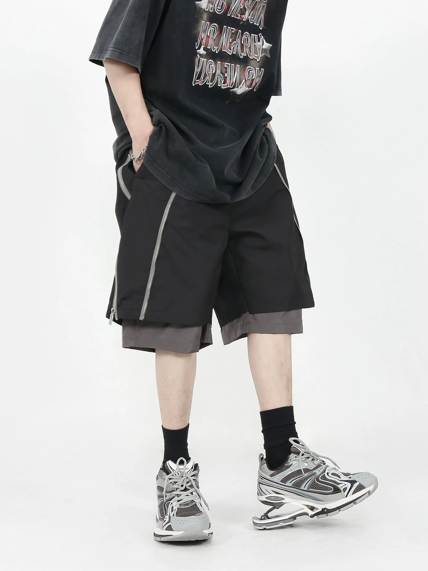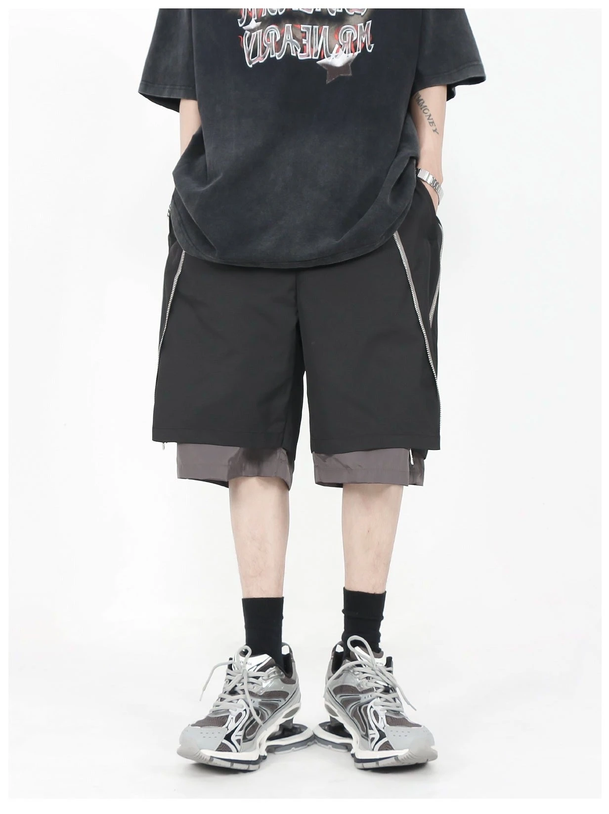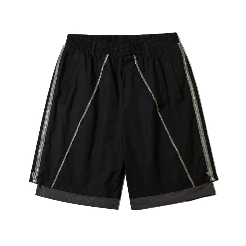 MRNEARLY polyester shorts, layered construction, zipper detailing throughout, elasticized waistband, belt loops, four-pocket styling.