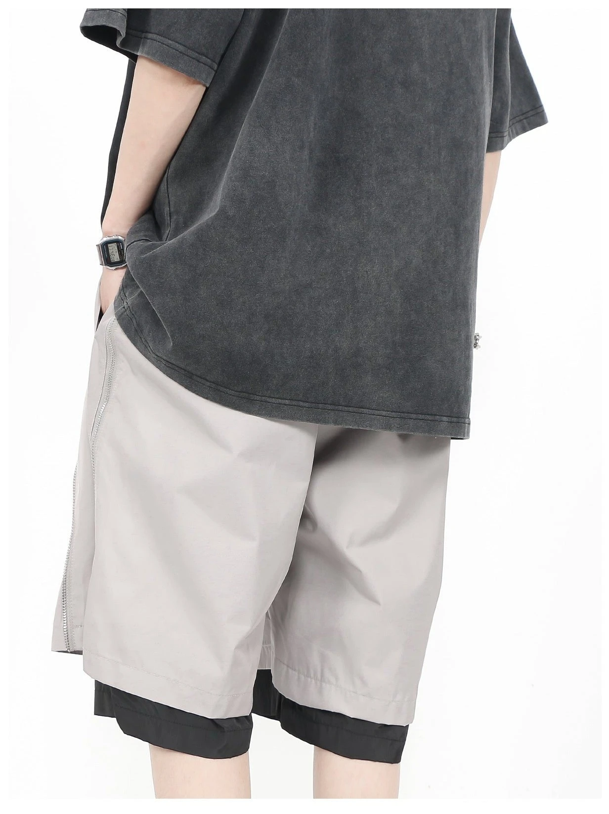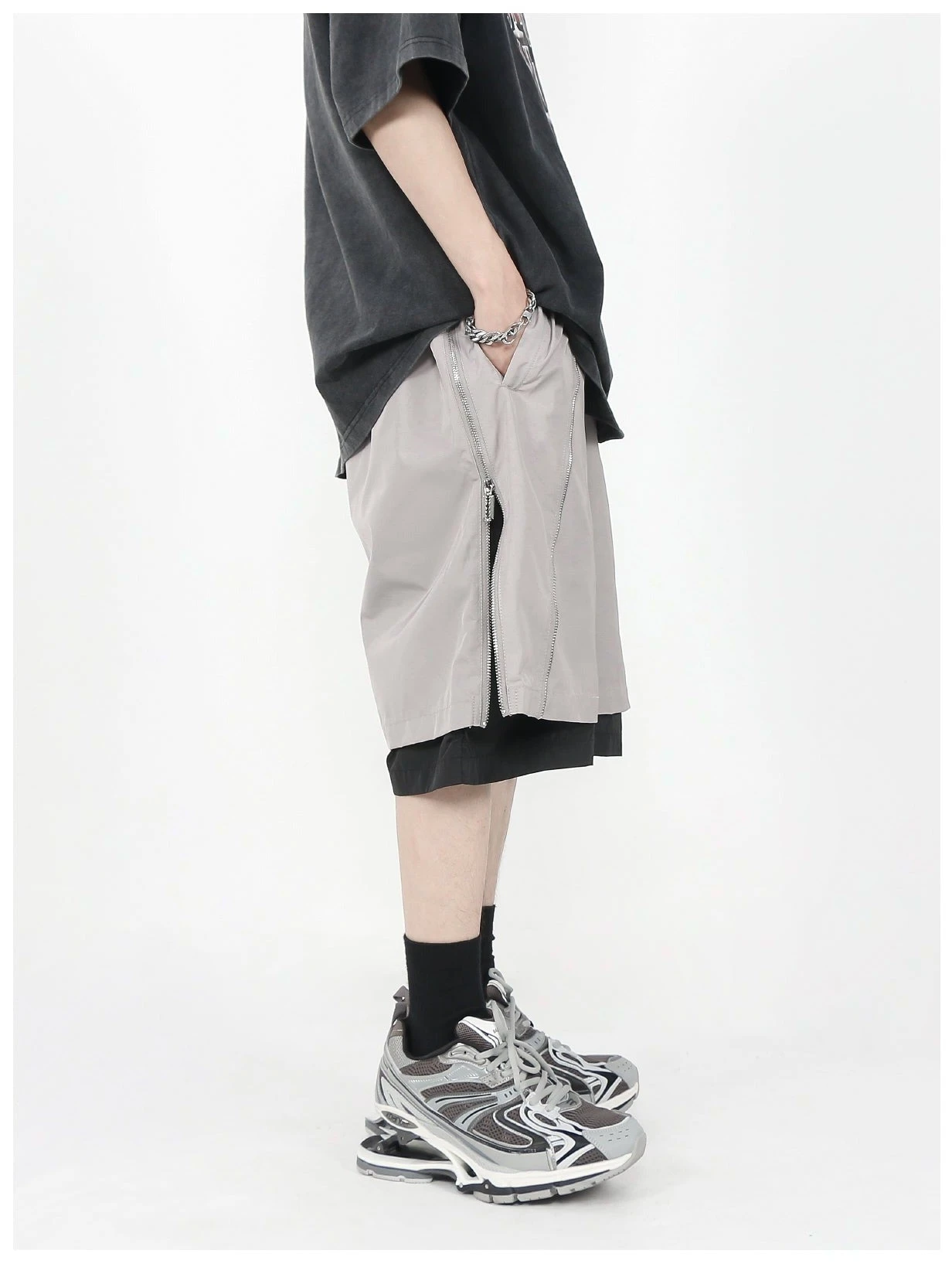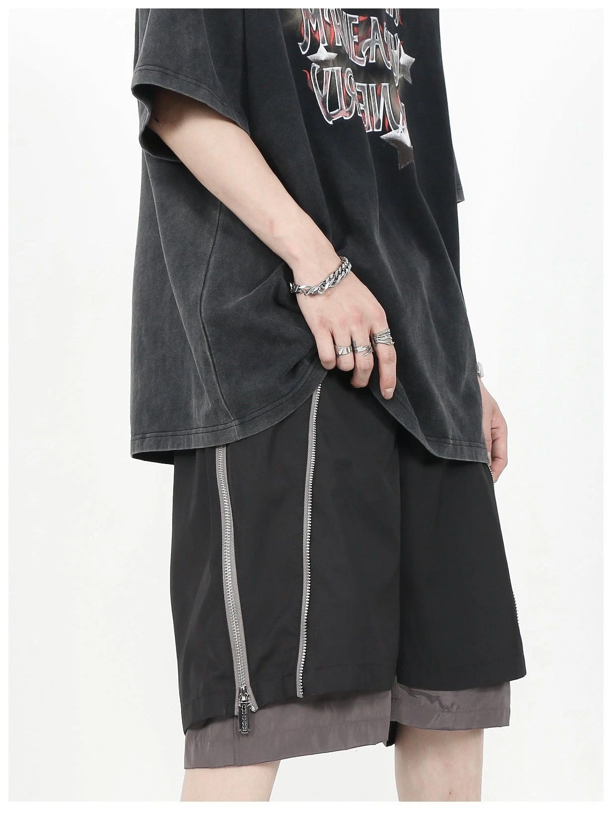MRNEARLY polyester shorts, layered construction, zipper detailing throughout, elasticized waistband, belt loops, four-pocket styling.