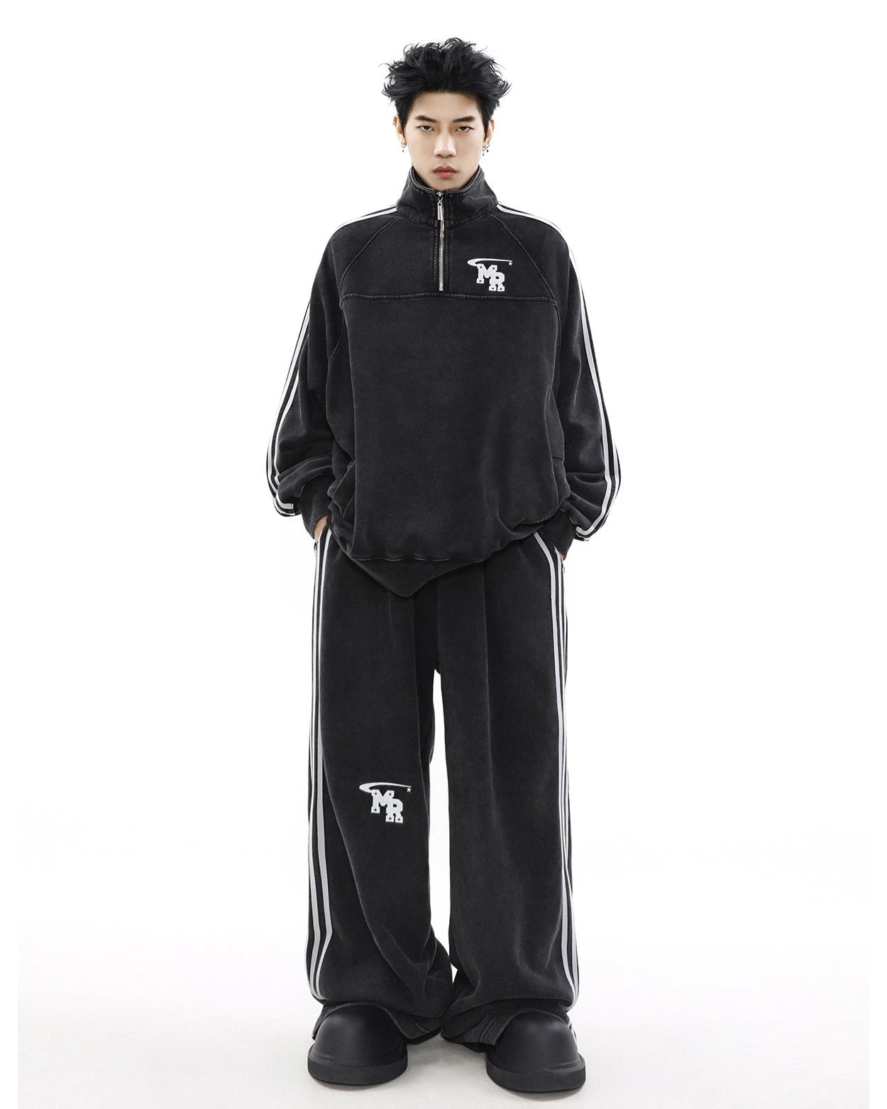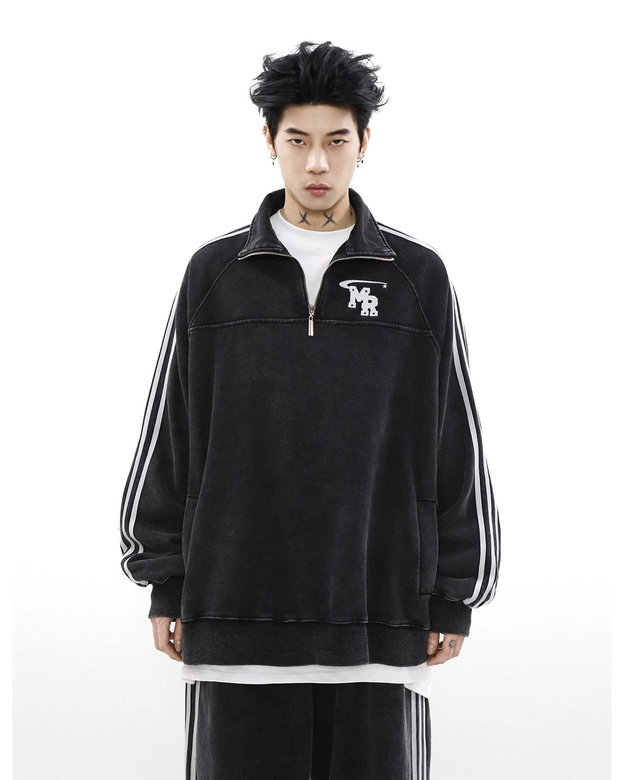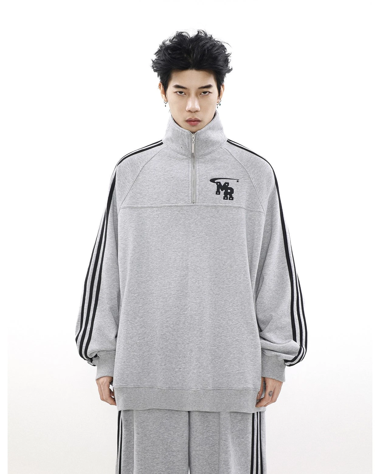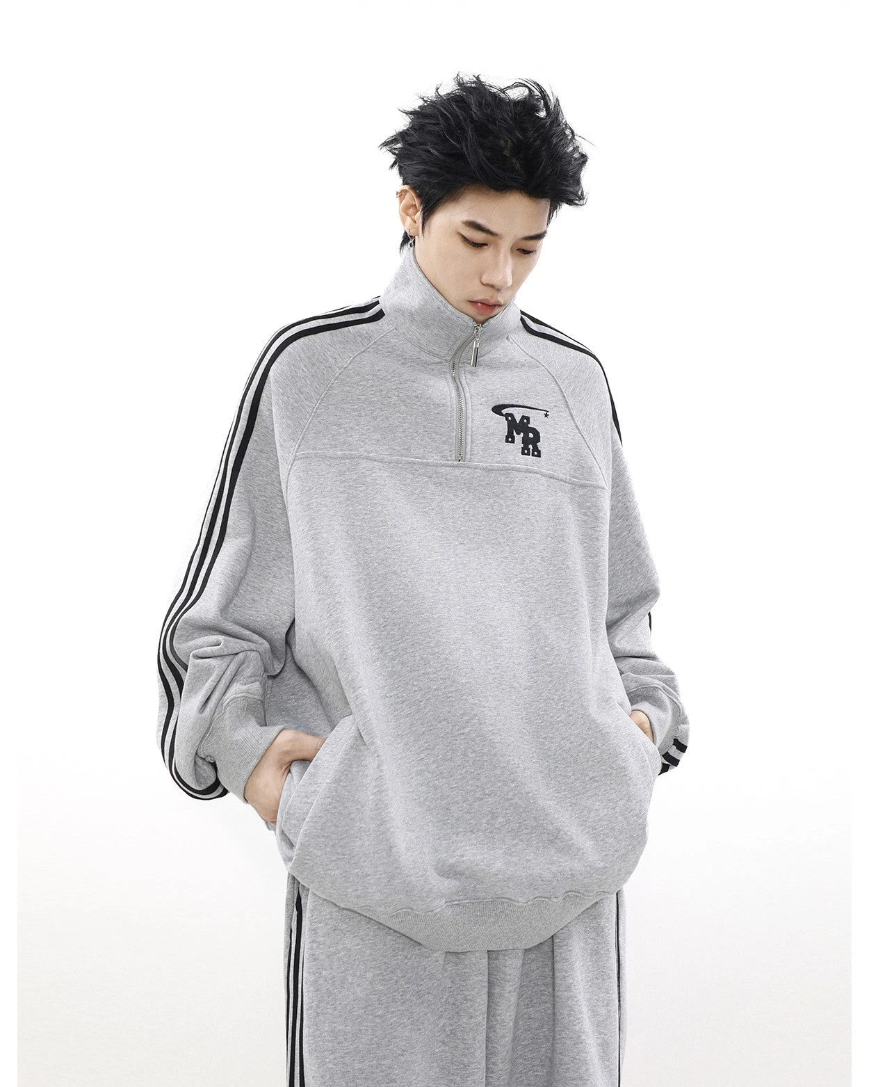 MRNEARLY cotton jacket, rib knit stand collar, ribbed cuffs & hem, half-zip closure, logo patch at chest, jacquard stripes at sleeves, kangaroo pocket.