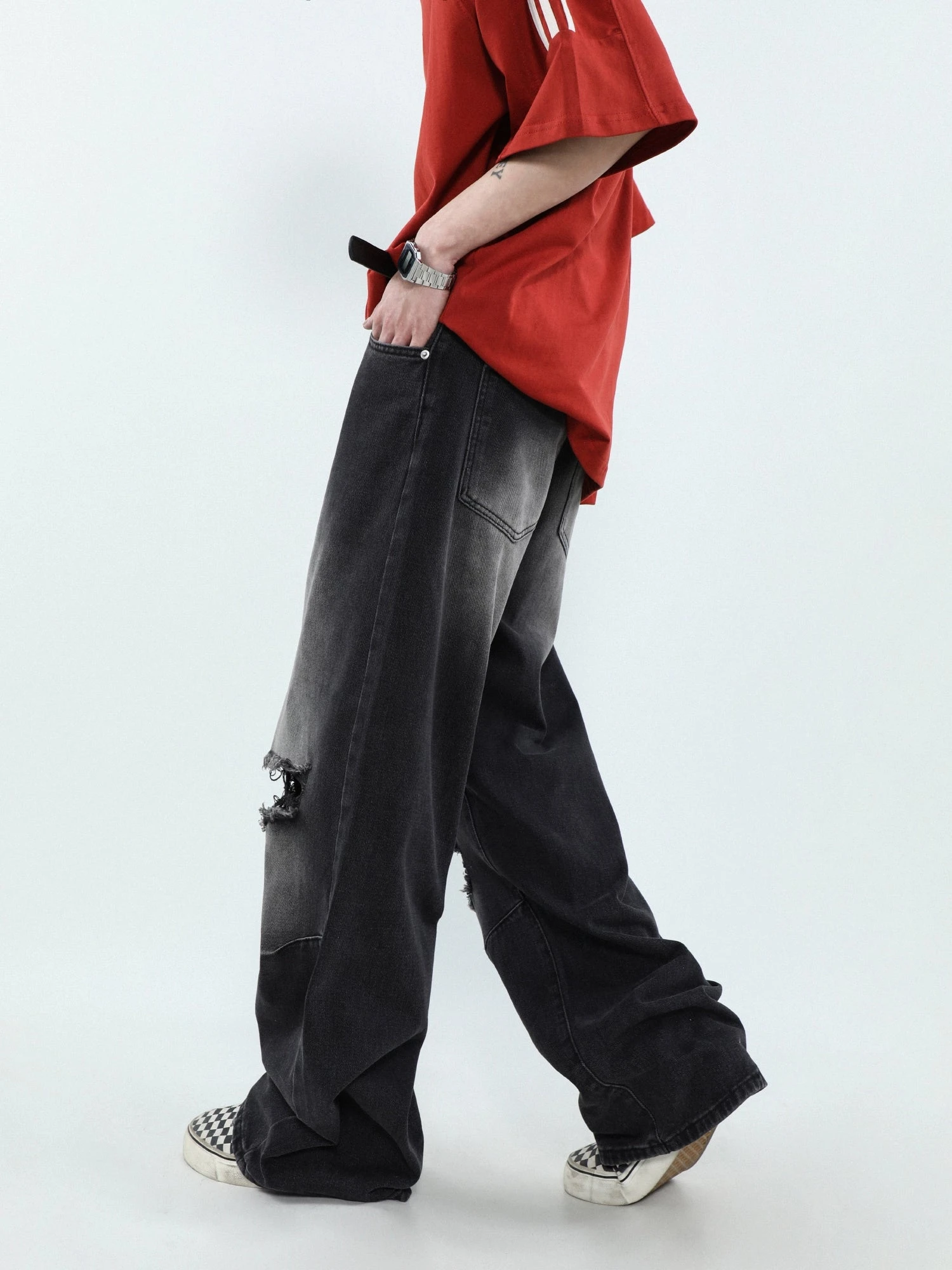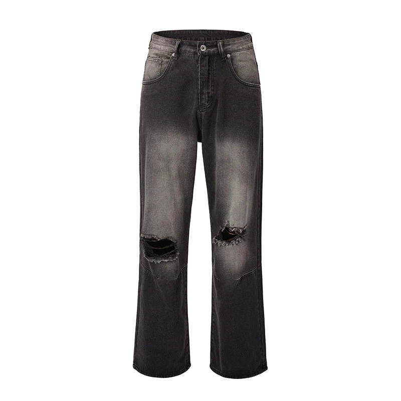 MRNEARLY denim jeans, distressing & fading throughout, belt loops, four-pocket styling, zip fly, rips at front legs.