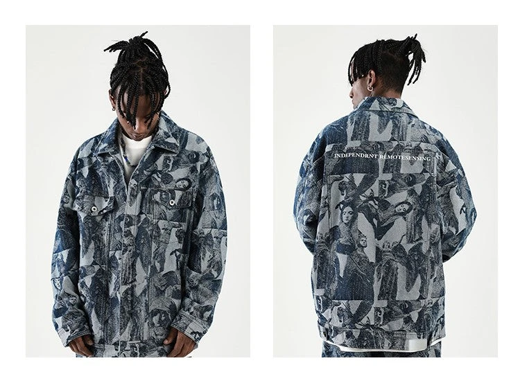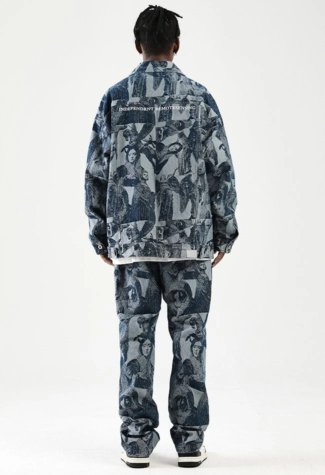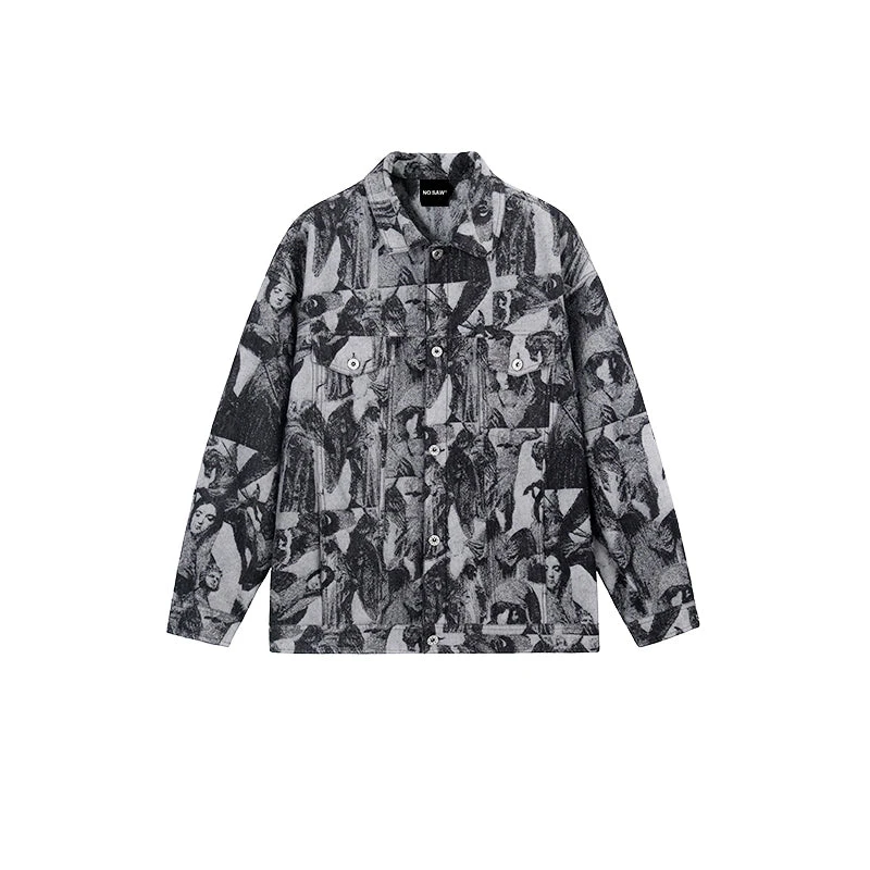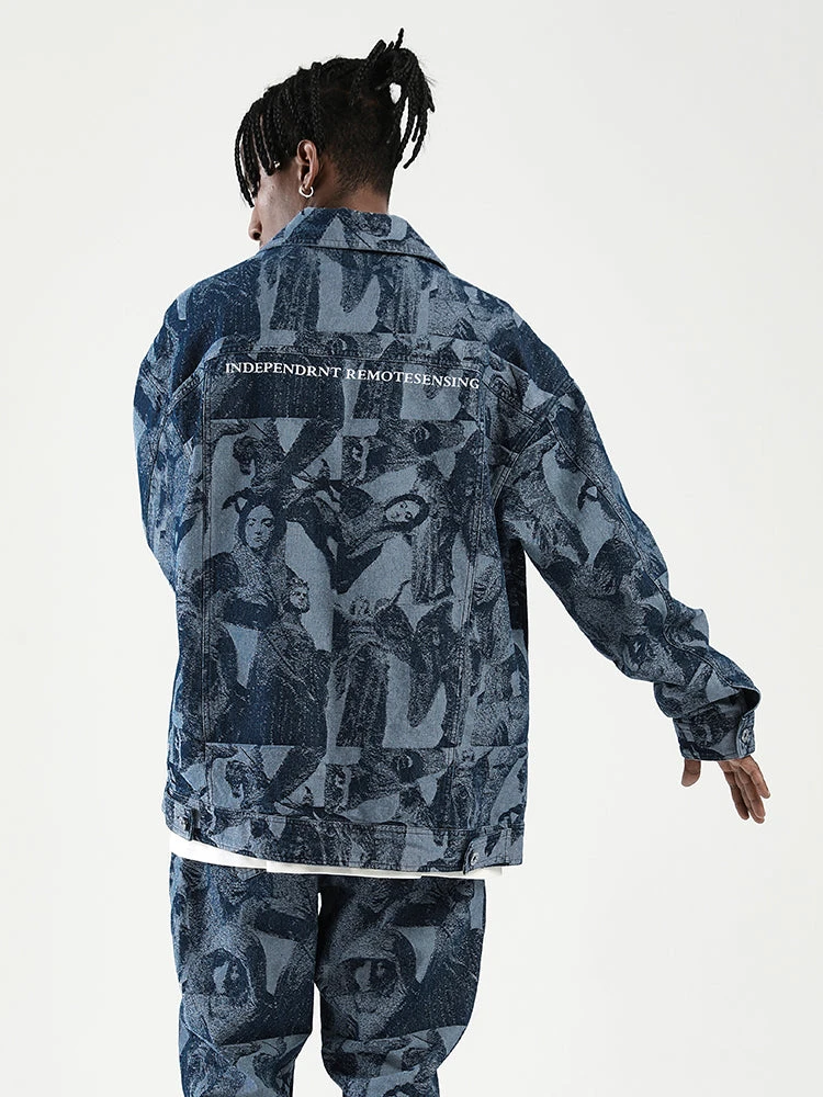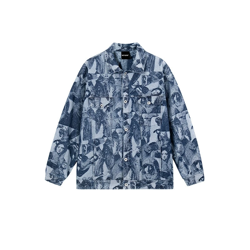 NOSAW denim jacket, paneled construction, renaissance pattern throughout, spread collar, summary closure, flap pockets, single-summary barrel cuffs, adjustable summary tabs at back hem, text printed at back.