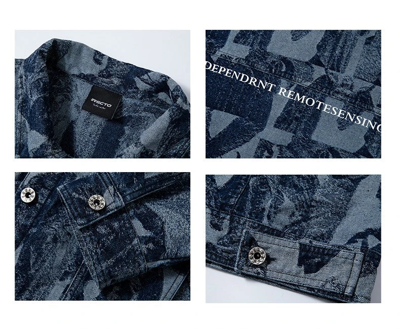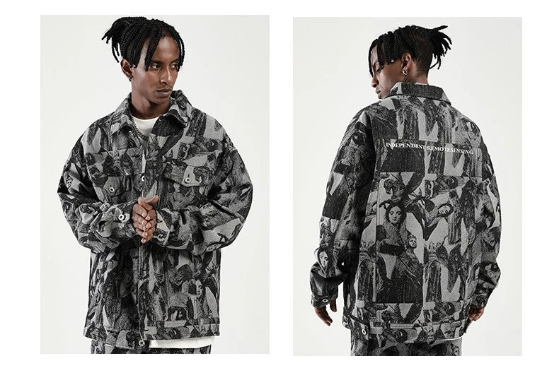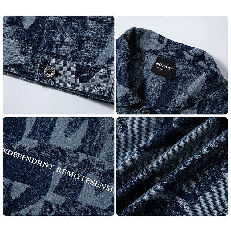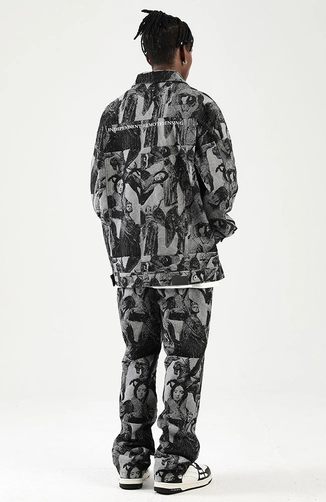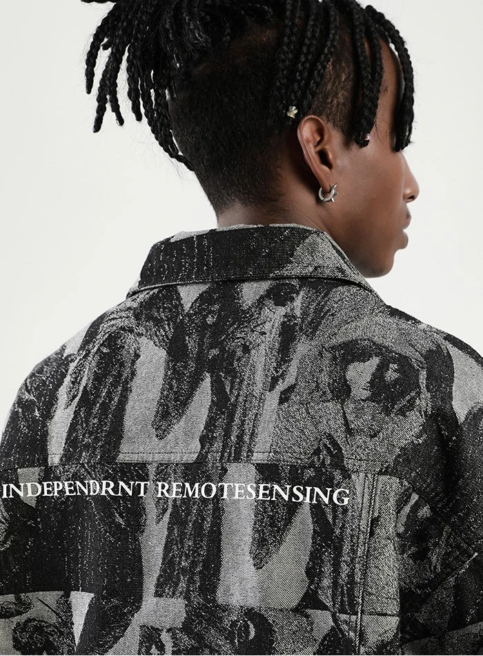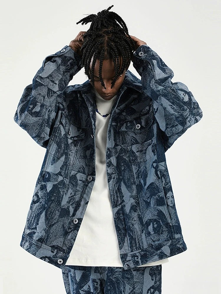 NOSAW denim jacket, paneled construction, renaissance pattern throughout, spread collar, summary closure, flap pockets, single-summary barrel cuffs, adjustable summary tabs at back hem, text printed at back.