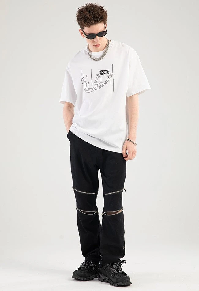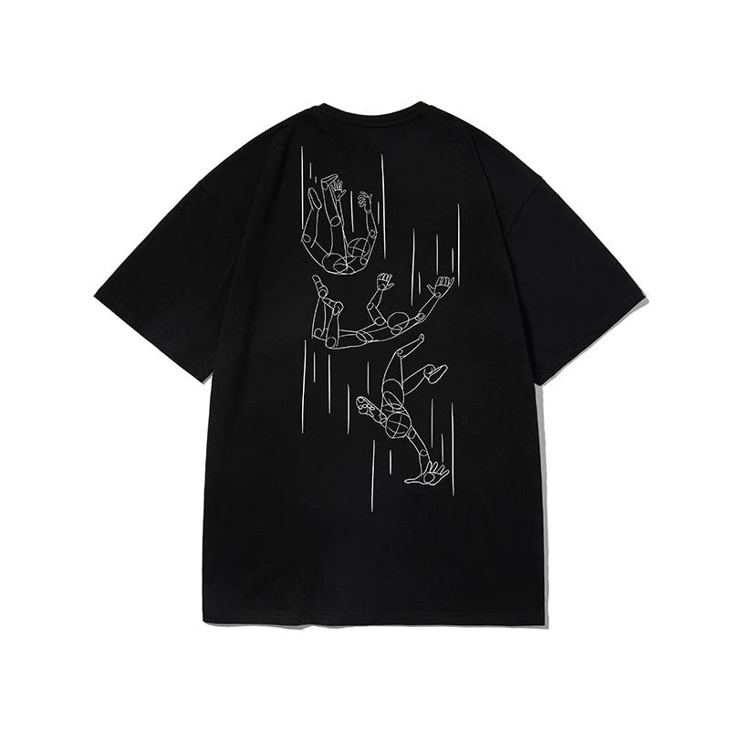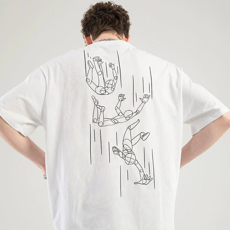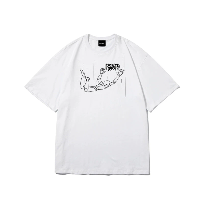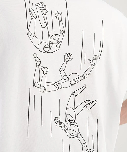 NOSAW cotton short sleeve shirt, rib knit crewneck/hem/cuffs, dropped shoulders, wooden mannequin graphic printed at front and back.