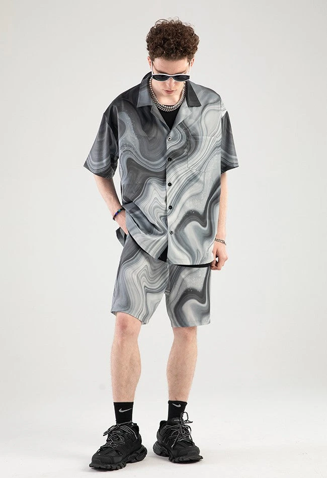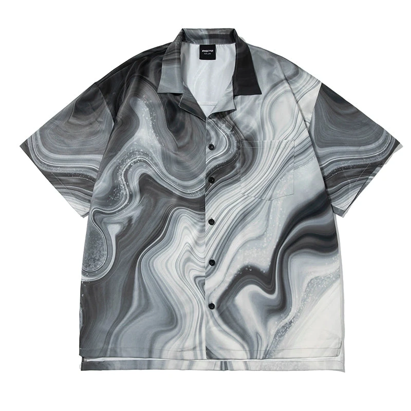 NOSAW polyester short sleeve shirt, marble pattern throughout, spread collar, dropped shoulders, summary closure, patch pocket.