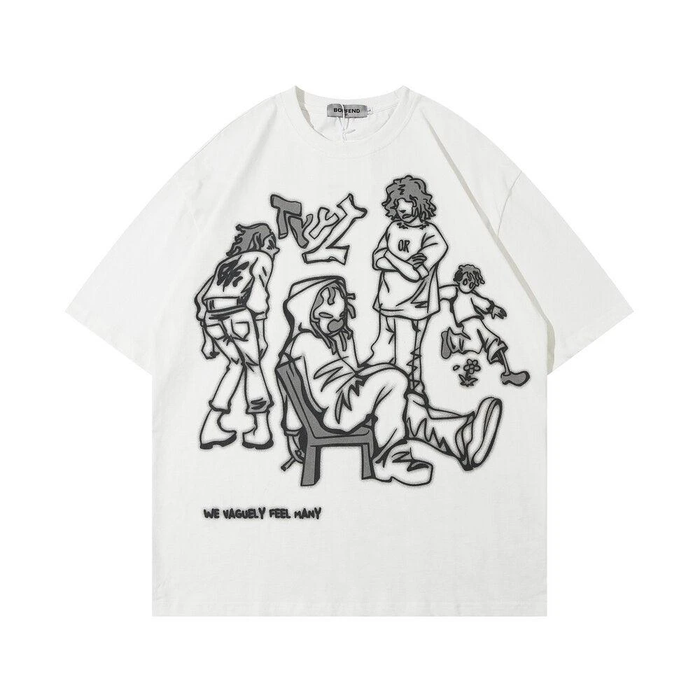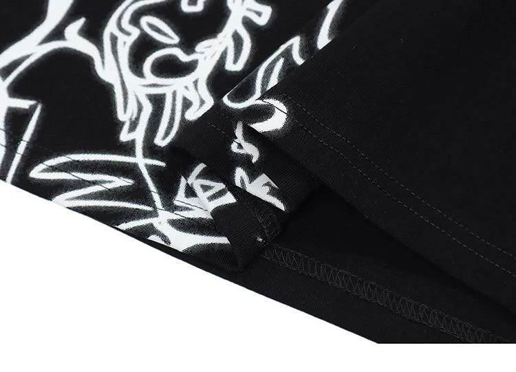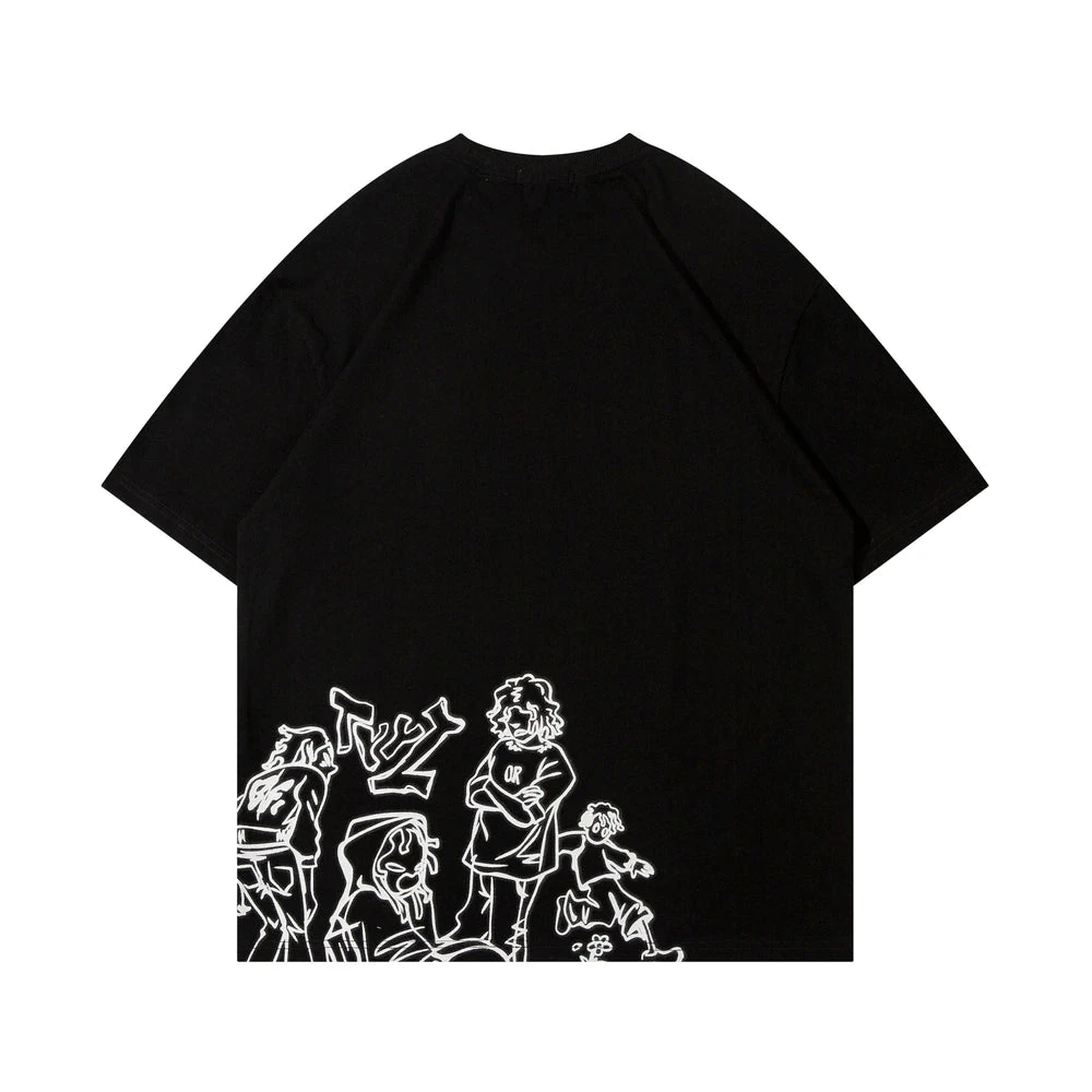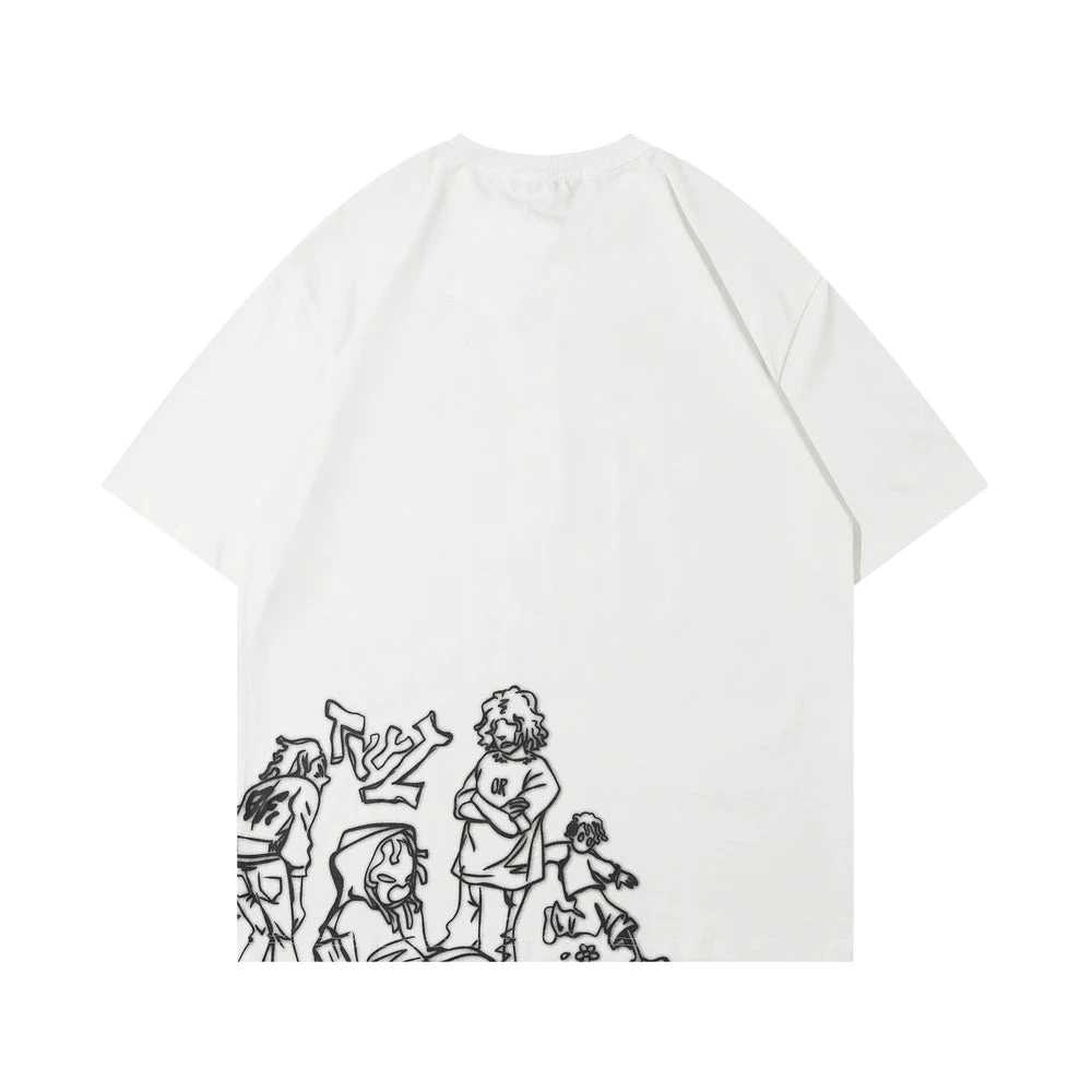 Cotton tee, straight/finished hem, tonal stitching, quality screen printing.
