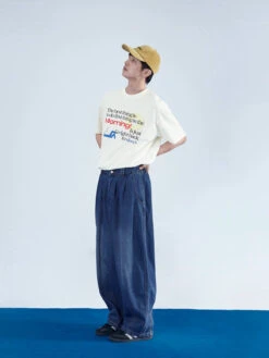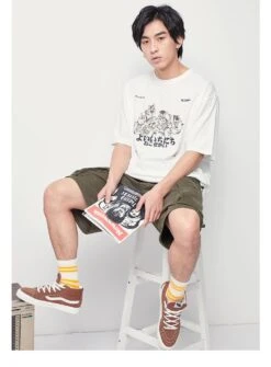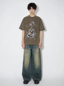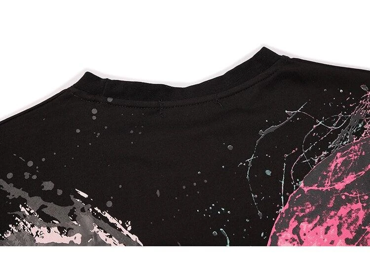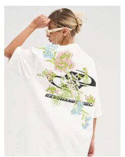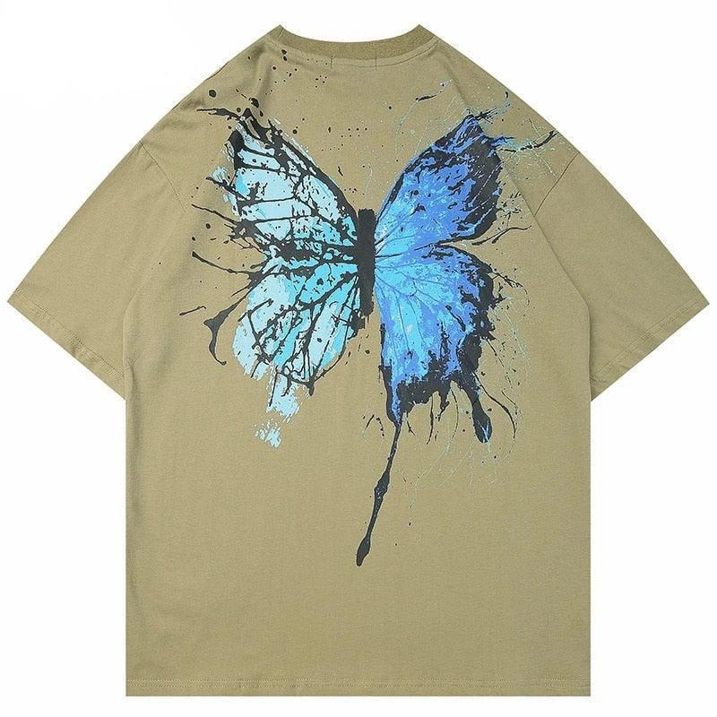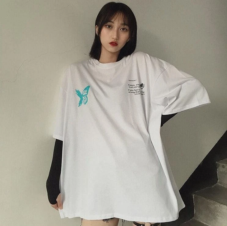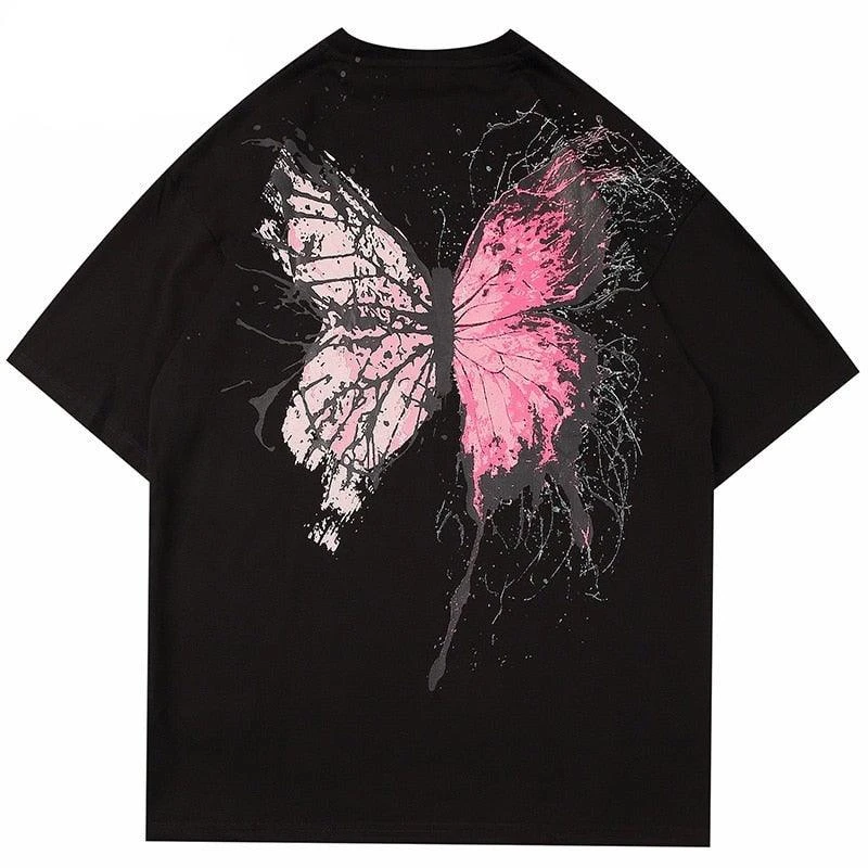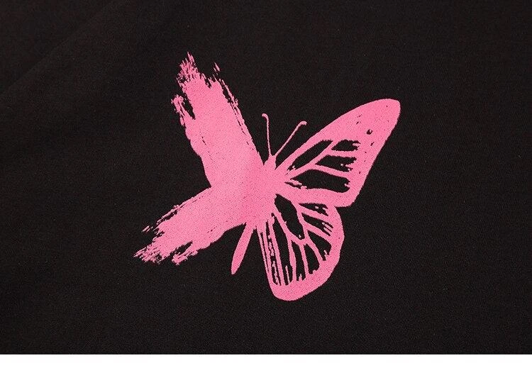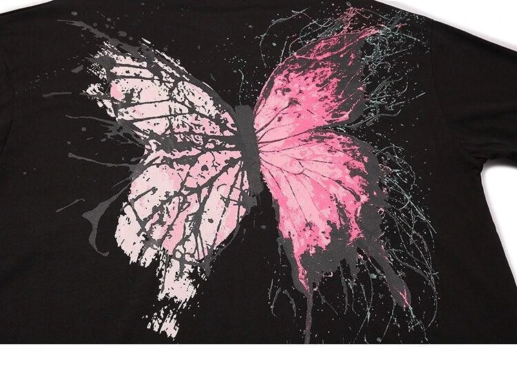 Cotton short sleeve shirt, rib knit crewneck/hem/cuffs, dropped shoulders, butterfly design printed at front and back.
