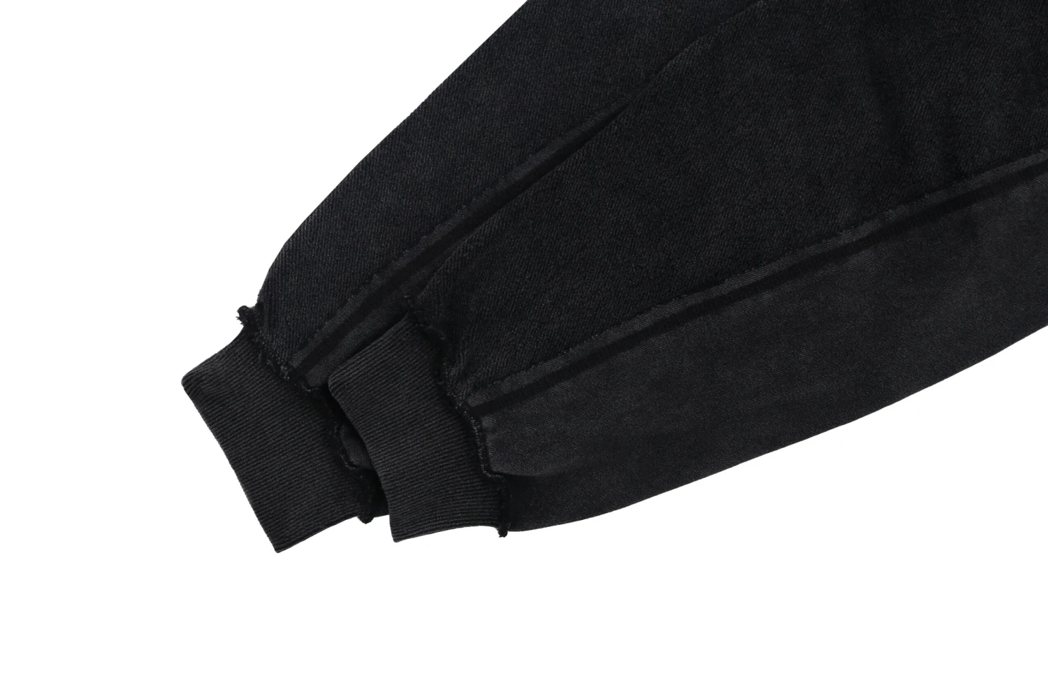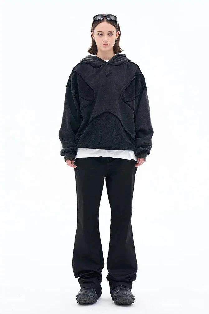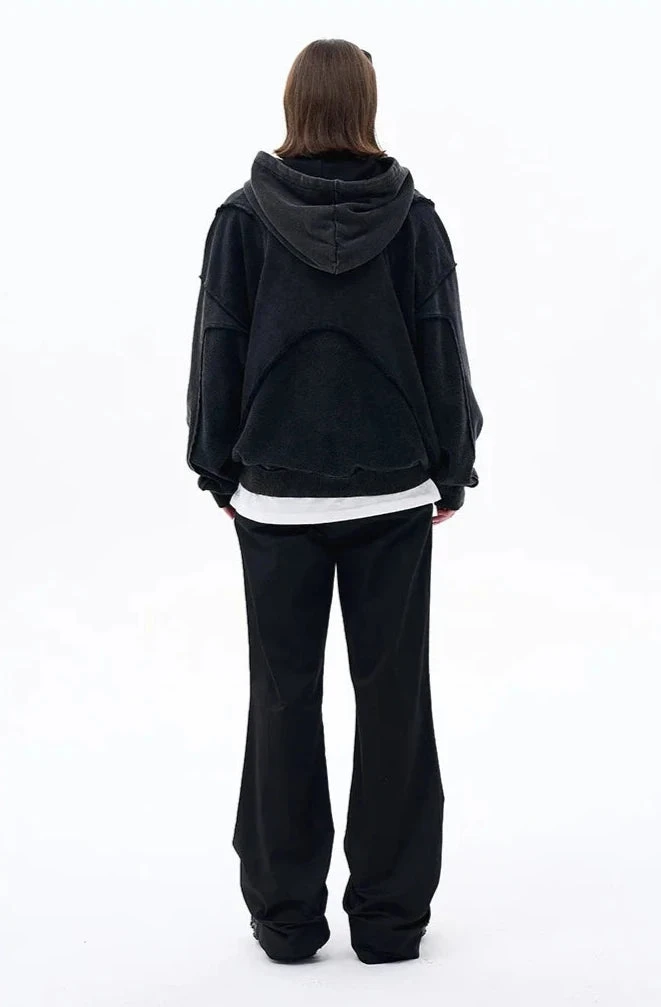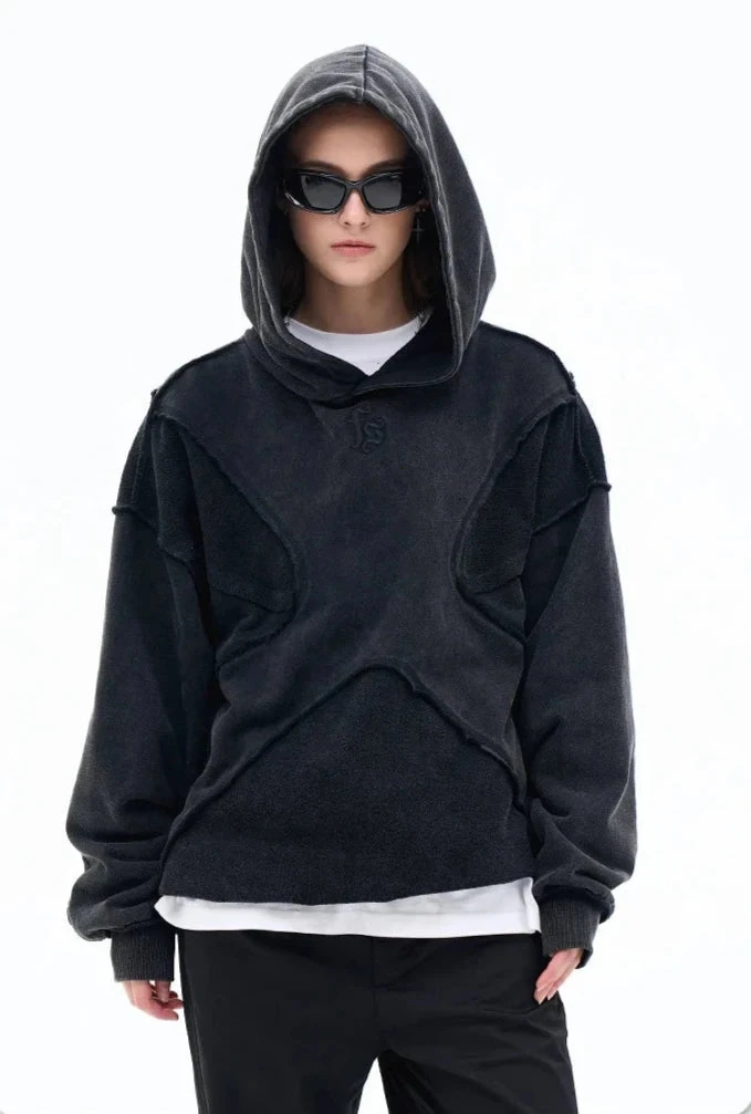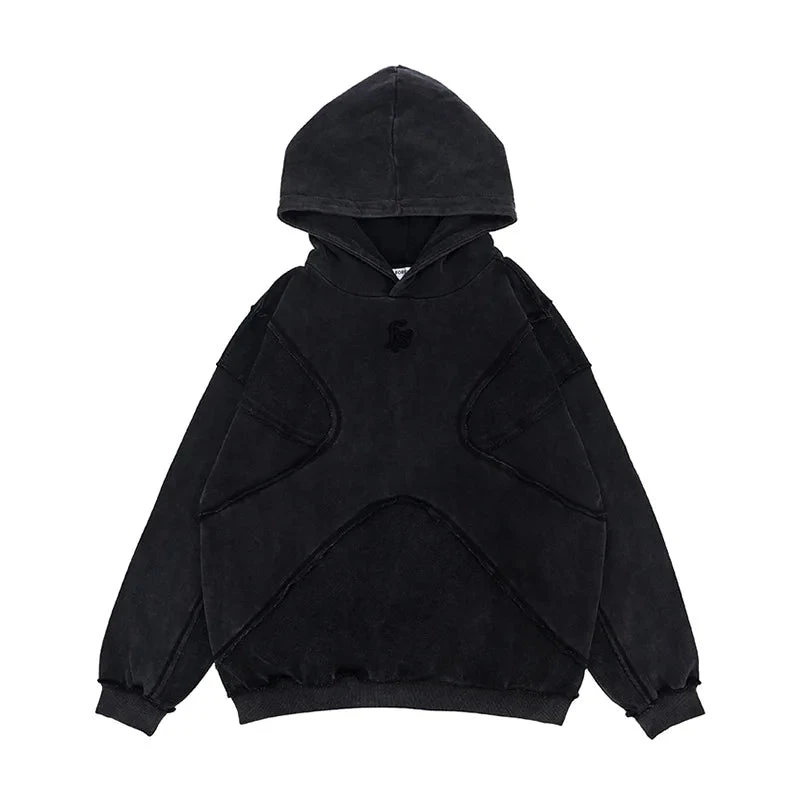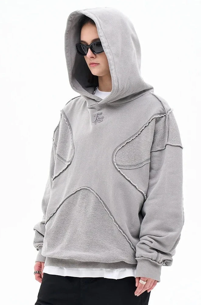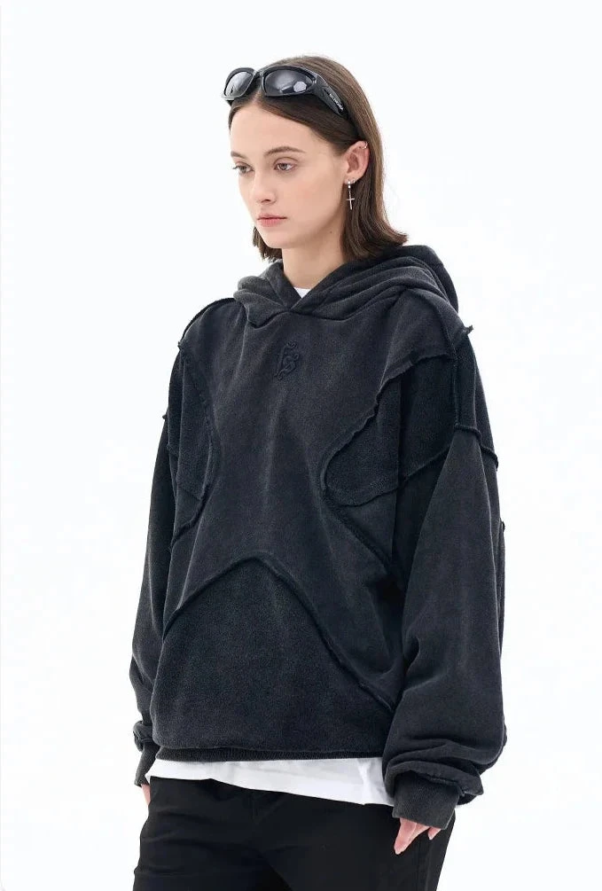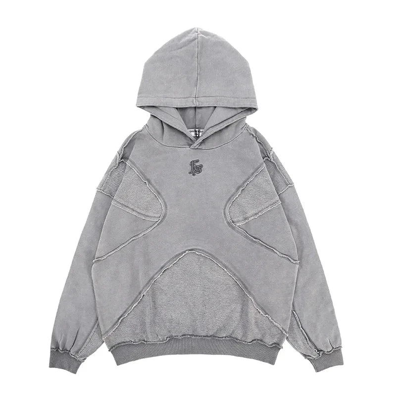 Vintage washed, heavy cotton hoodie, cut and sewed garment, layered design, rib knit cuffs and hem, kangaroo pocket at waist, panel cut hood, embroidered logo at chest.
