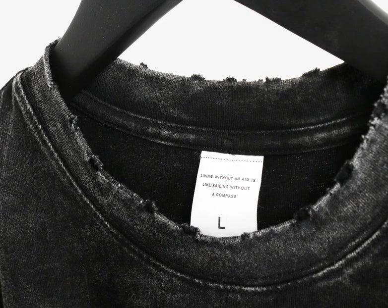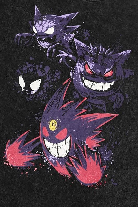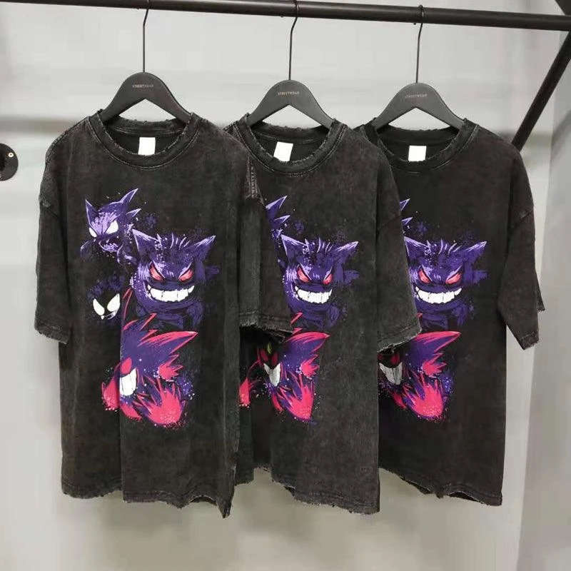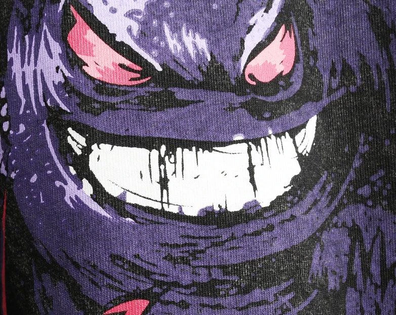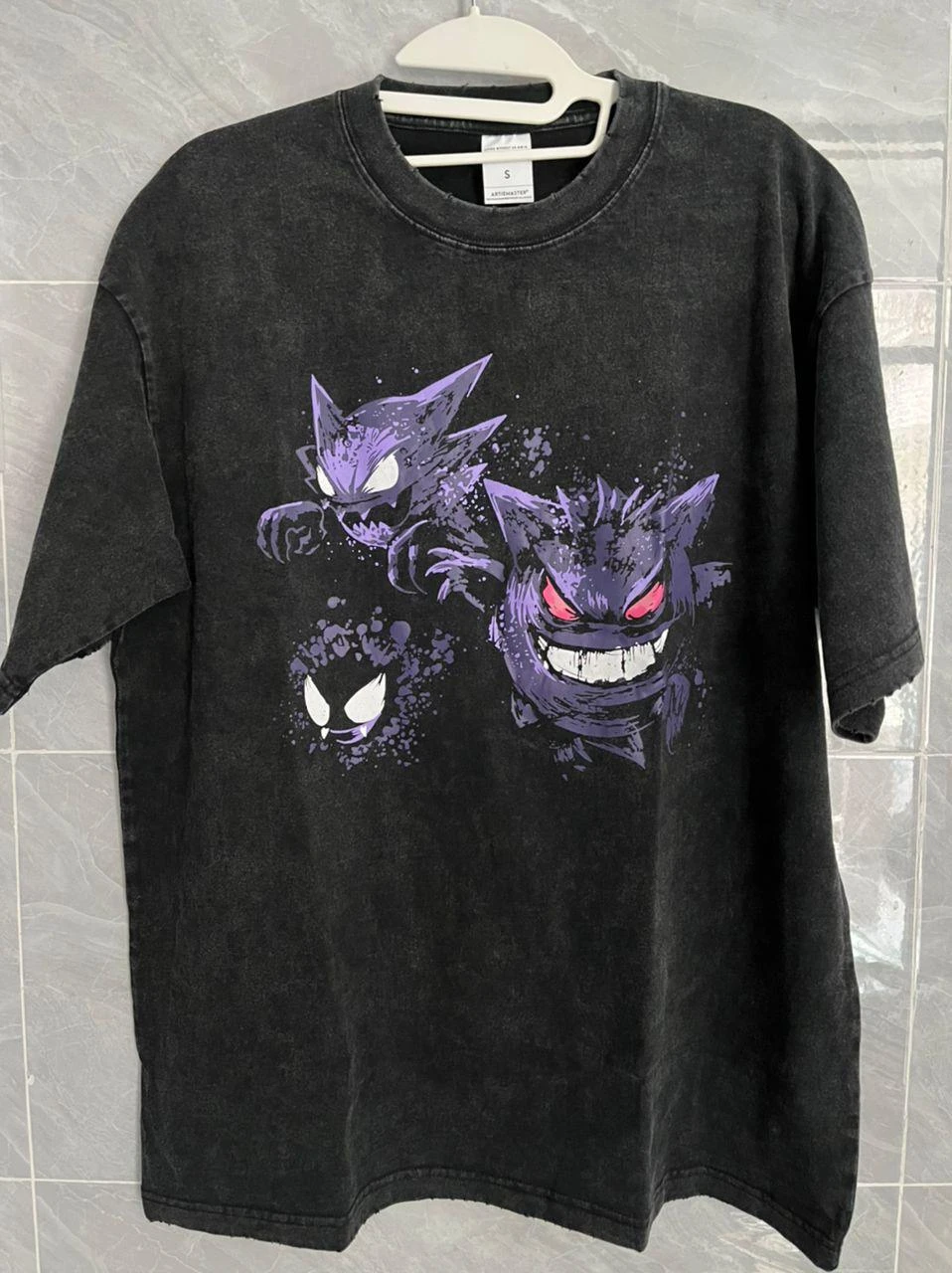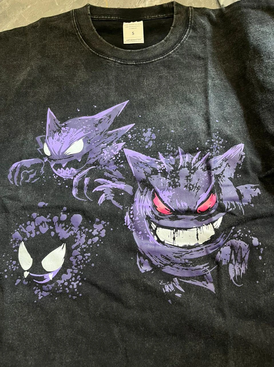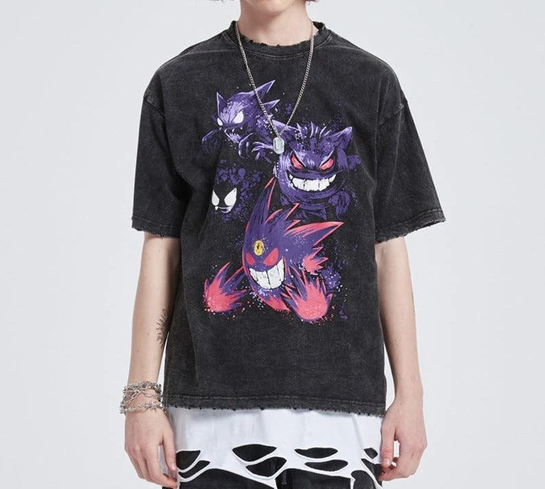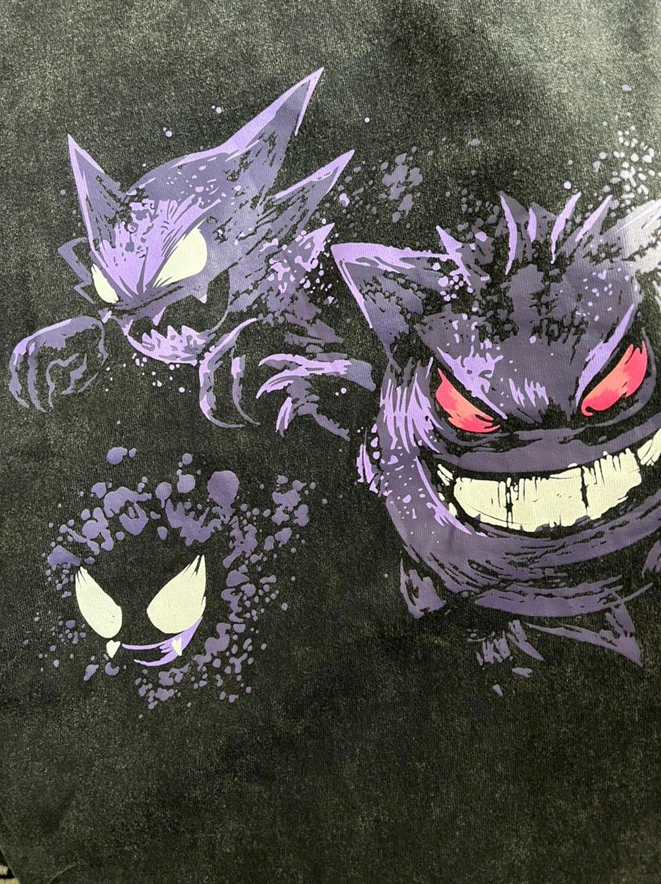 Cotton short sleeve shirt, frayed edges at rib knit crewneck/hem/cuffs, dropped shoulders, Gengar design embedded at front for a long lasting print. Hand-washed staining for a vintage look & feel.